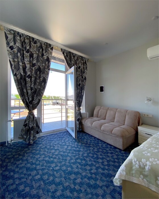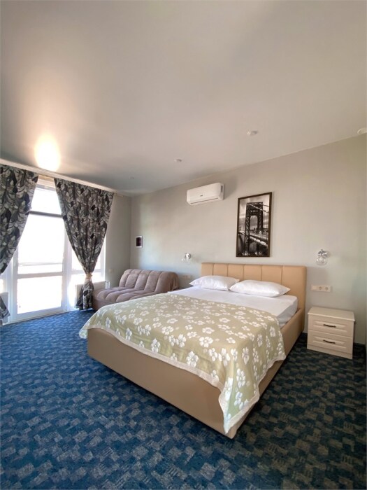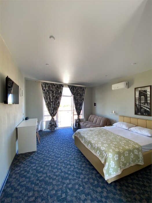 Гостям, для проживания, предлагаются номера со всем необходимым для комфортного отдыха. В номере все удобства: холодильник, чайник, посуда, кондиционер, телевизор Smаrt, Wi-Fi, стол, стулья, диван, большой шкаф-купе, кровать с ортопедическим матрасом и подушками, прикроватные тумбы, фен, сейф, санузел.