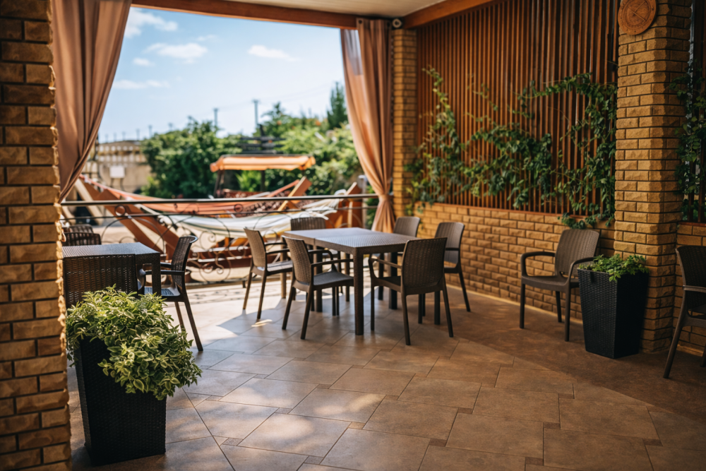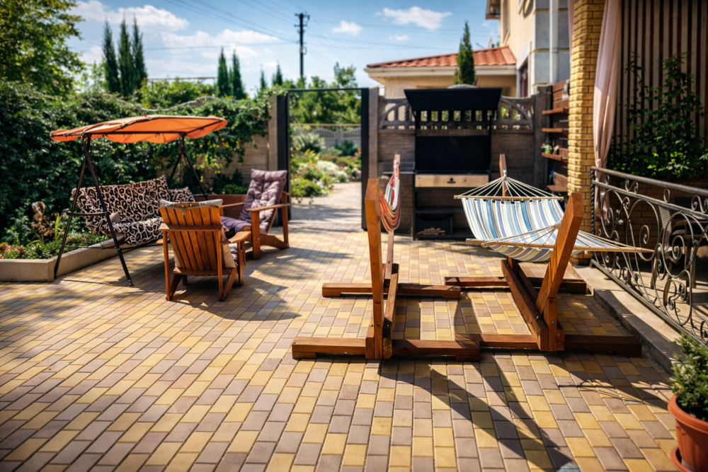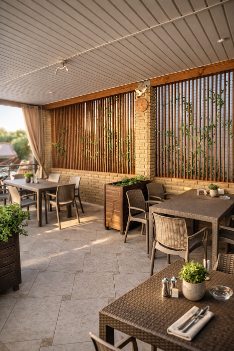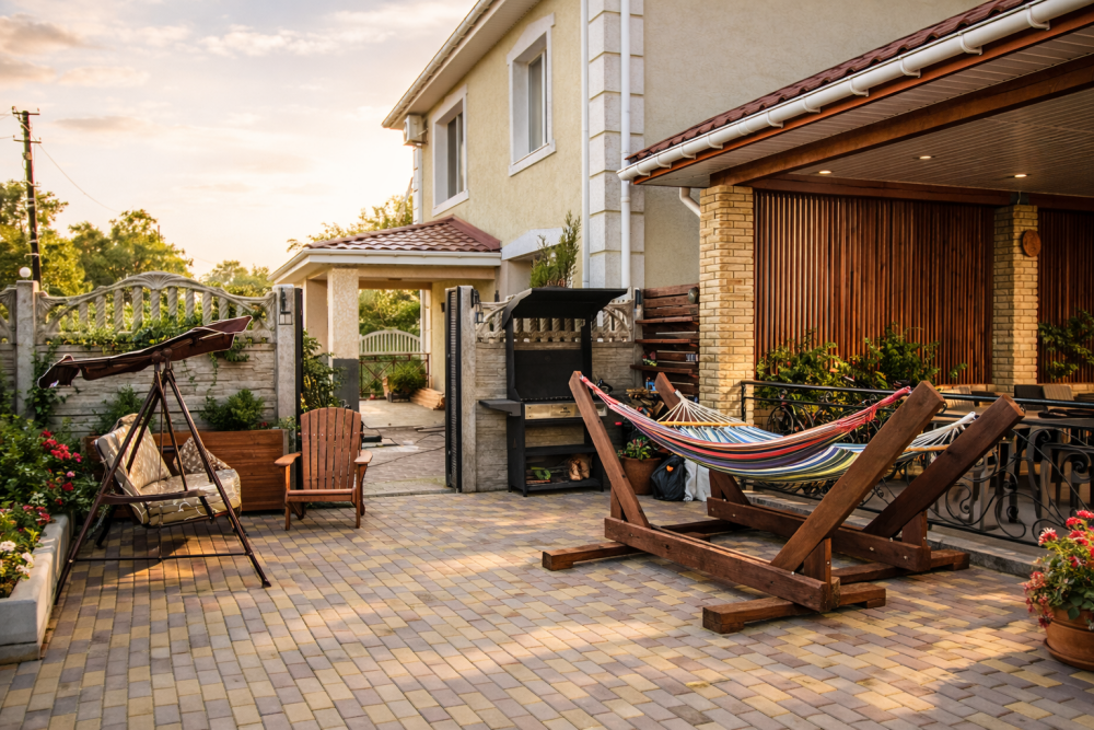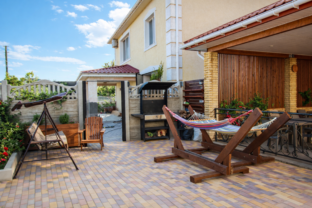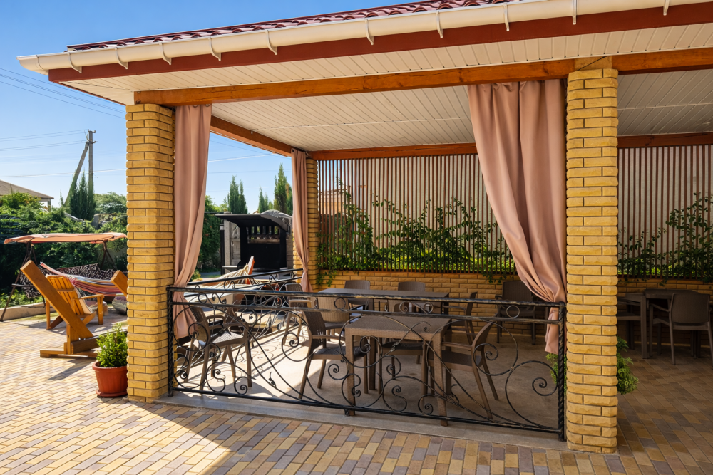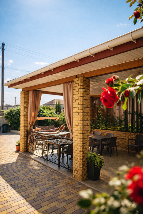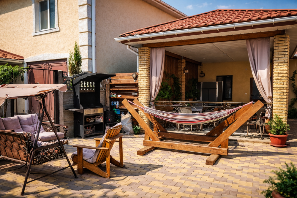 Отдых и досуг: Просторная летняя веранда, мангальная зона, зона отдыха с гамаками и уютный зеленый двор.