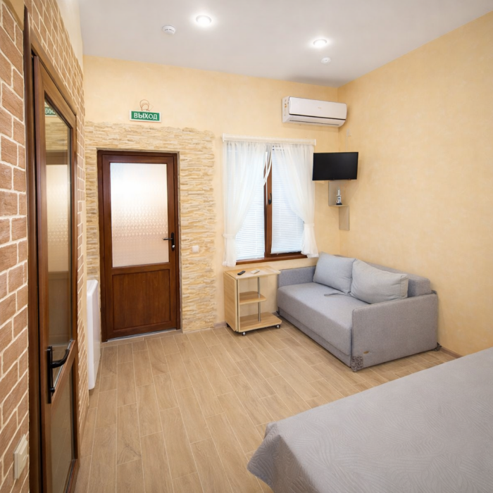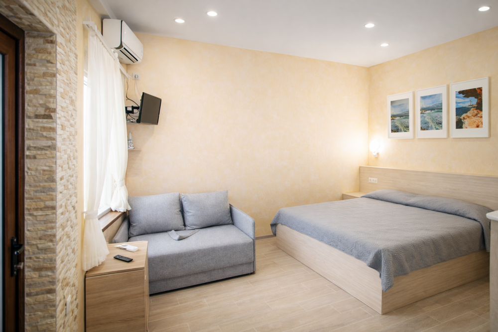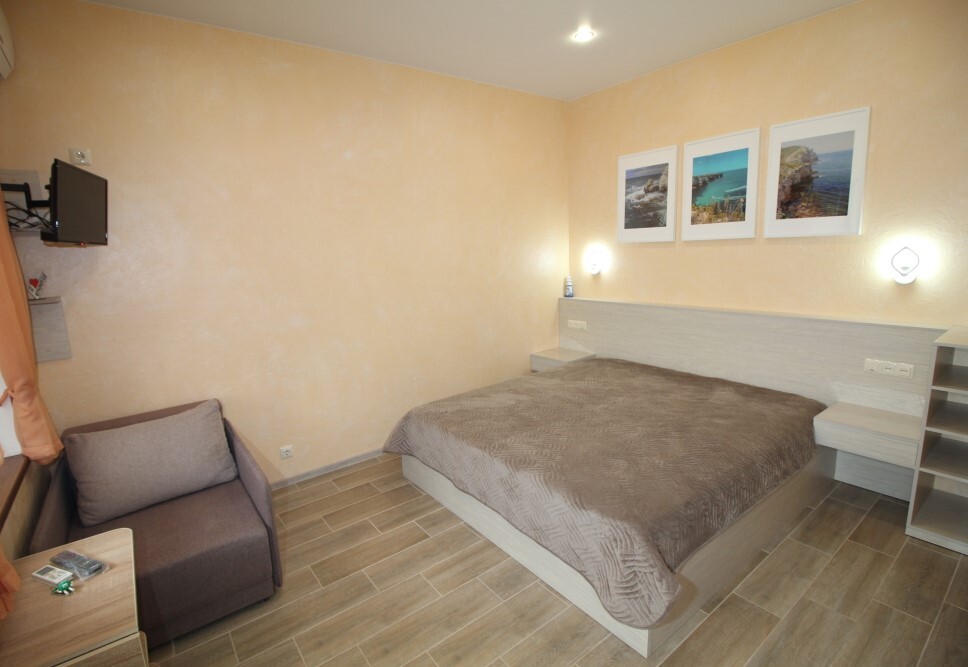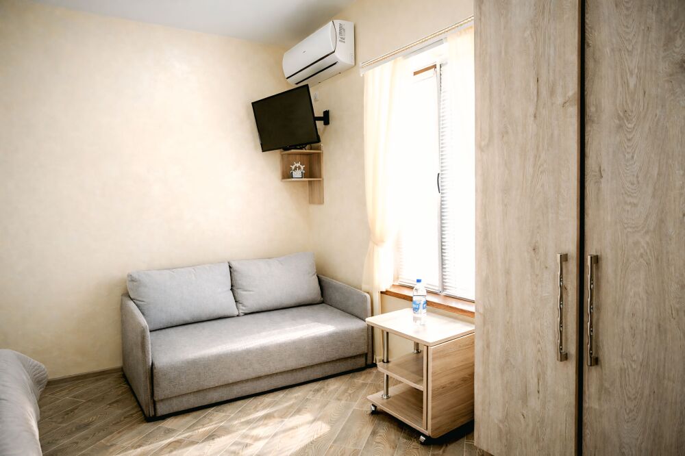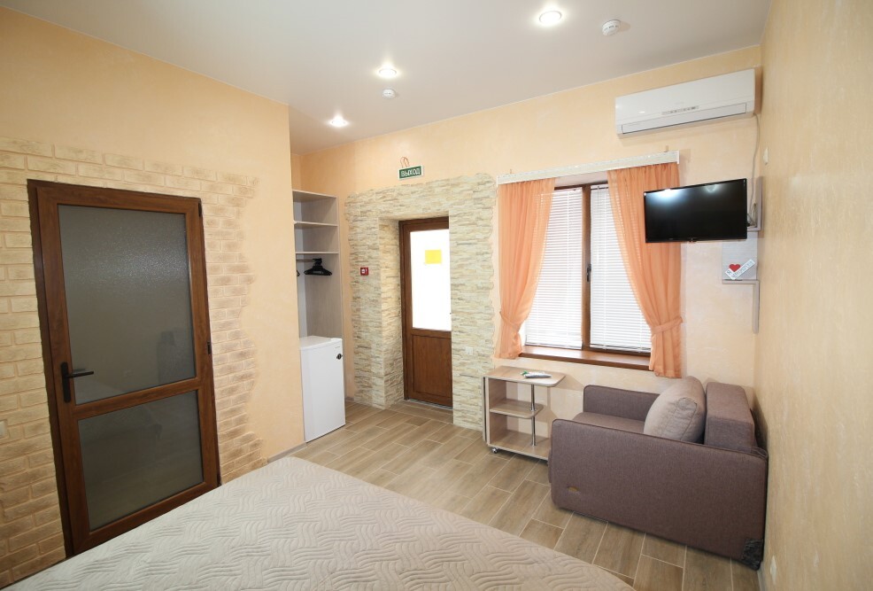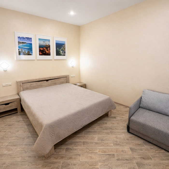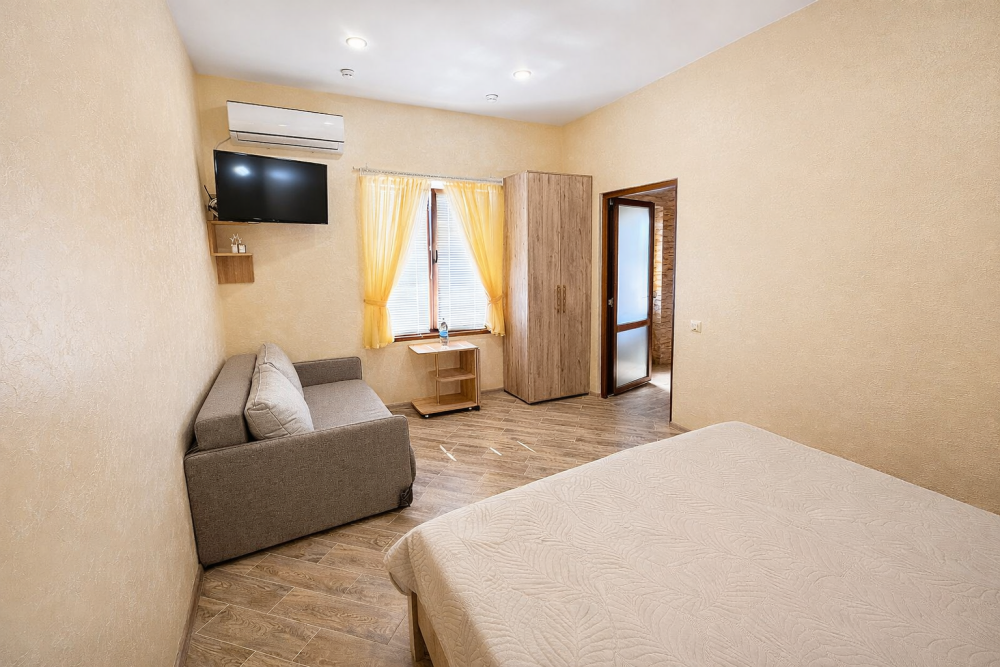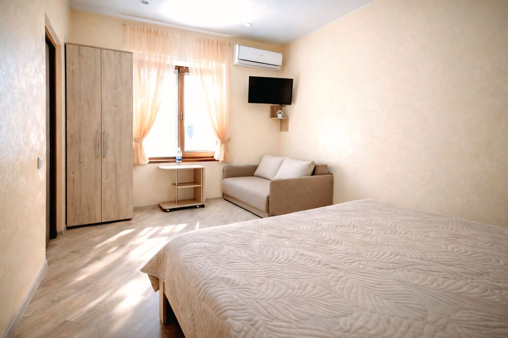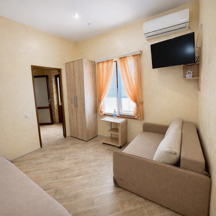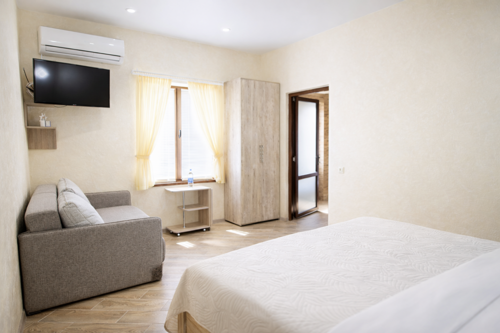 В номере есть: двуспальная кровать с ортопедическим матрасом, односпальное кресло-кровать, кондиционер, холодильник, шкаф, журнальный столик, Wi-Fi, современная сантехника и мебель, телевизор (кабельное телевидение), санузел, набор постельного белья и полотенец для каждого гостя, средства личной гигиены, сушилка для белья.