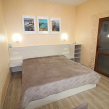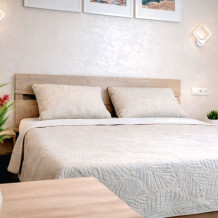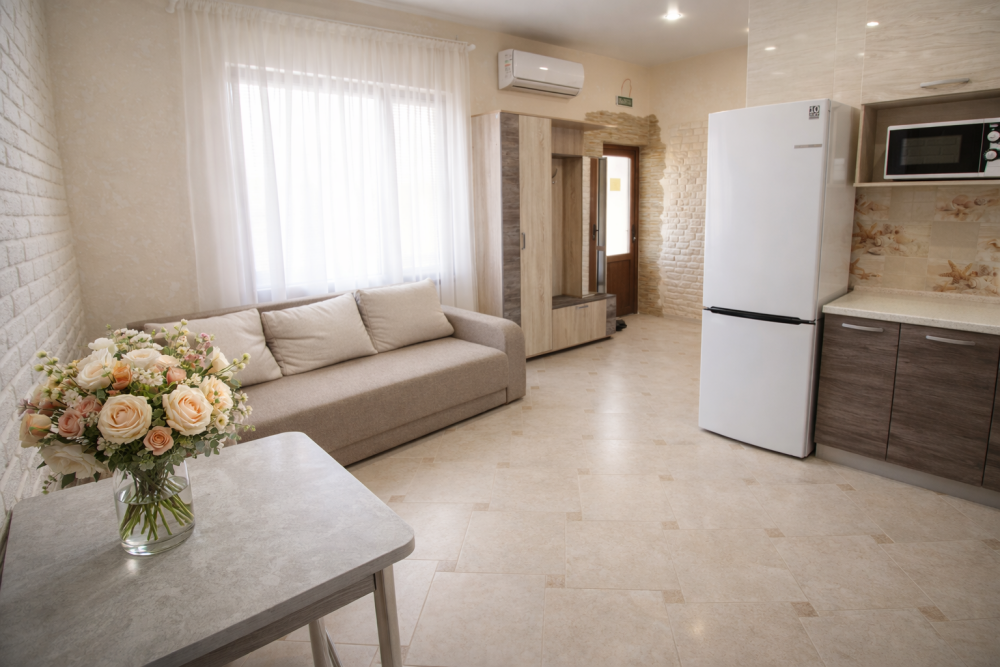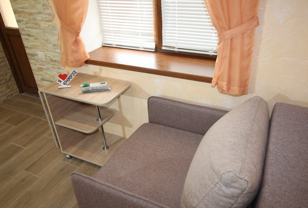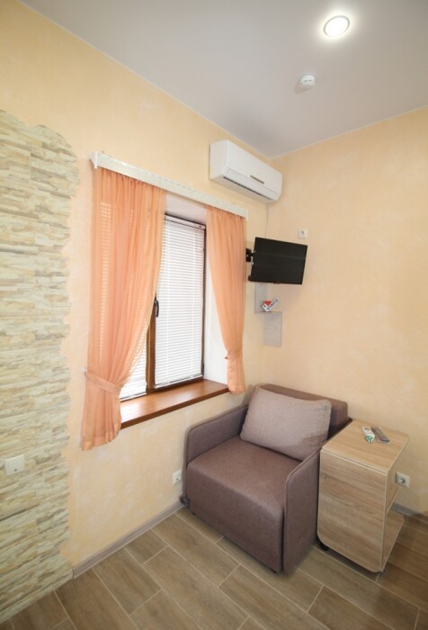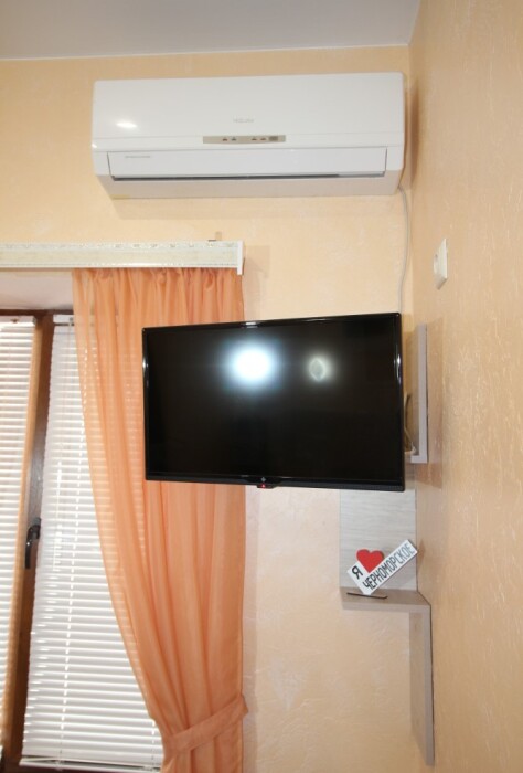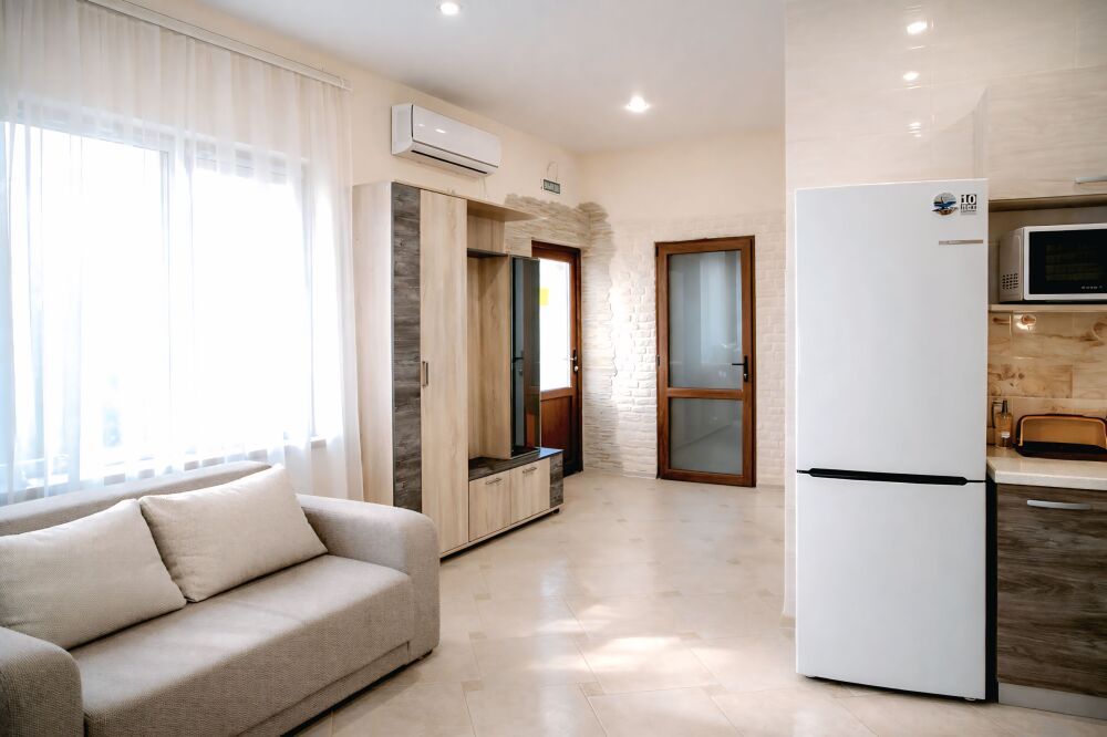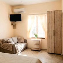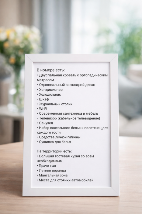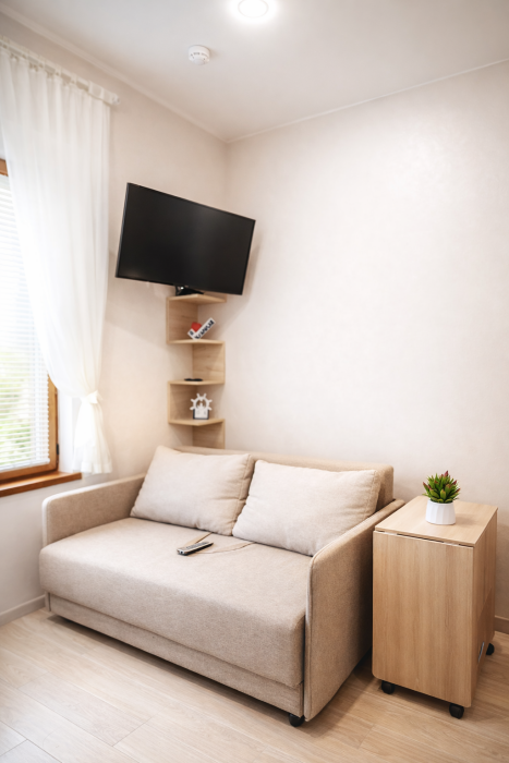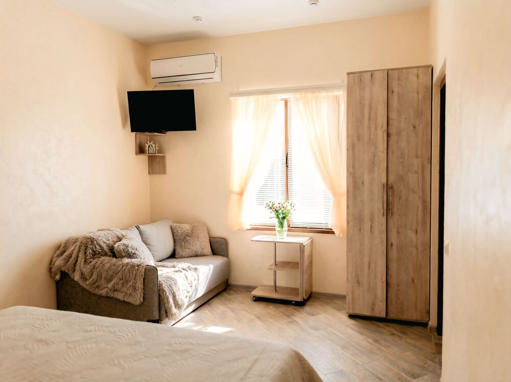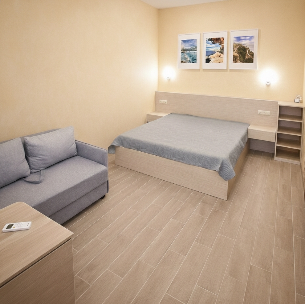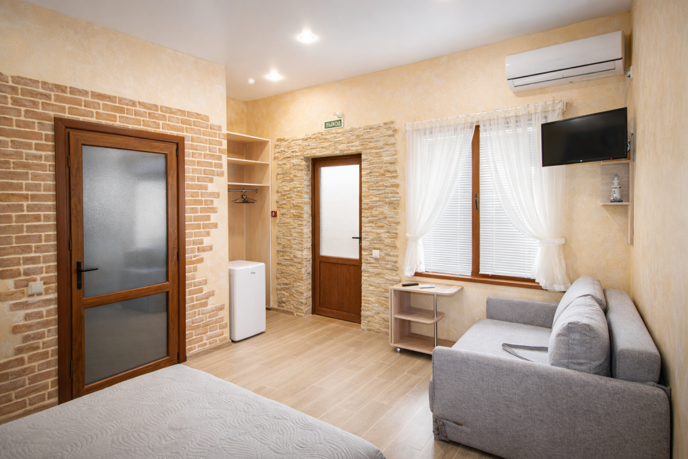 В номере есть: двуспальная кровать с ортопедическим матрасом, односпальное кресло-кровать, кондиционер, холодильник, шкаф, журнальный столик, Wi-Fi, современная сантехника и мебель, телевизор (кабельное телевидение), санузел, набор постельного белья и полотенец для каждого гостя, средства личной гигиены, сушилка для белья.