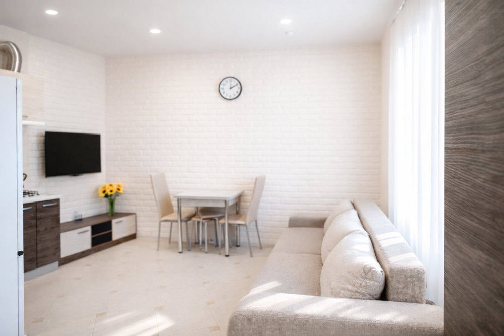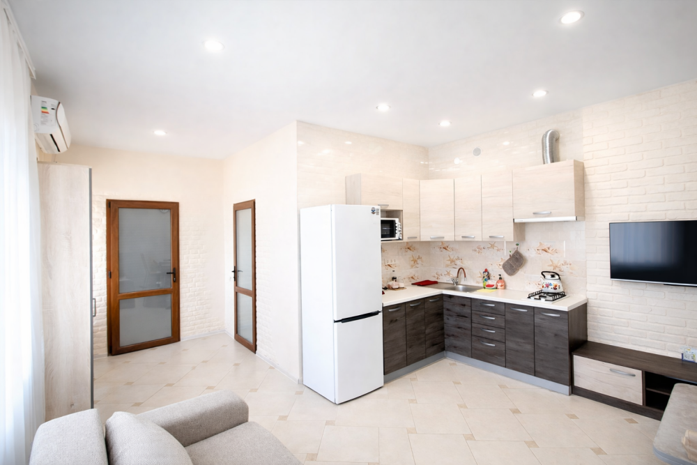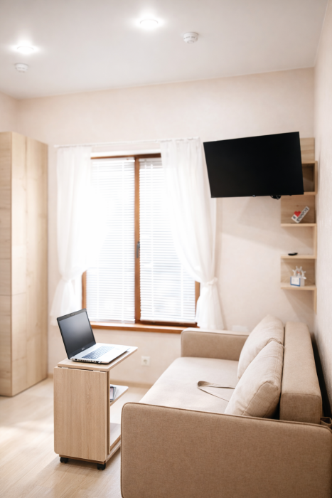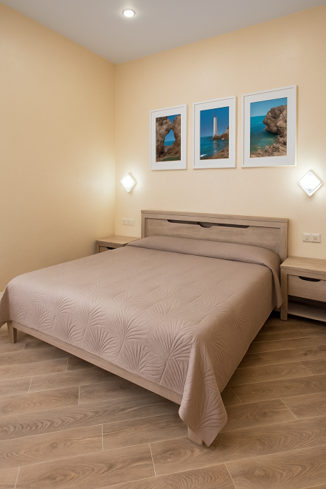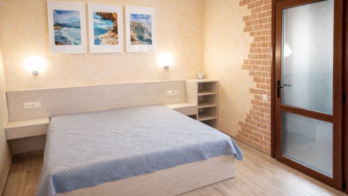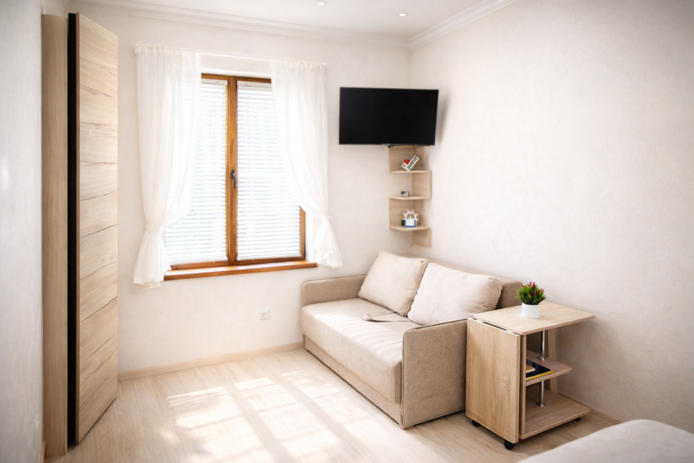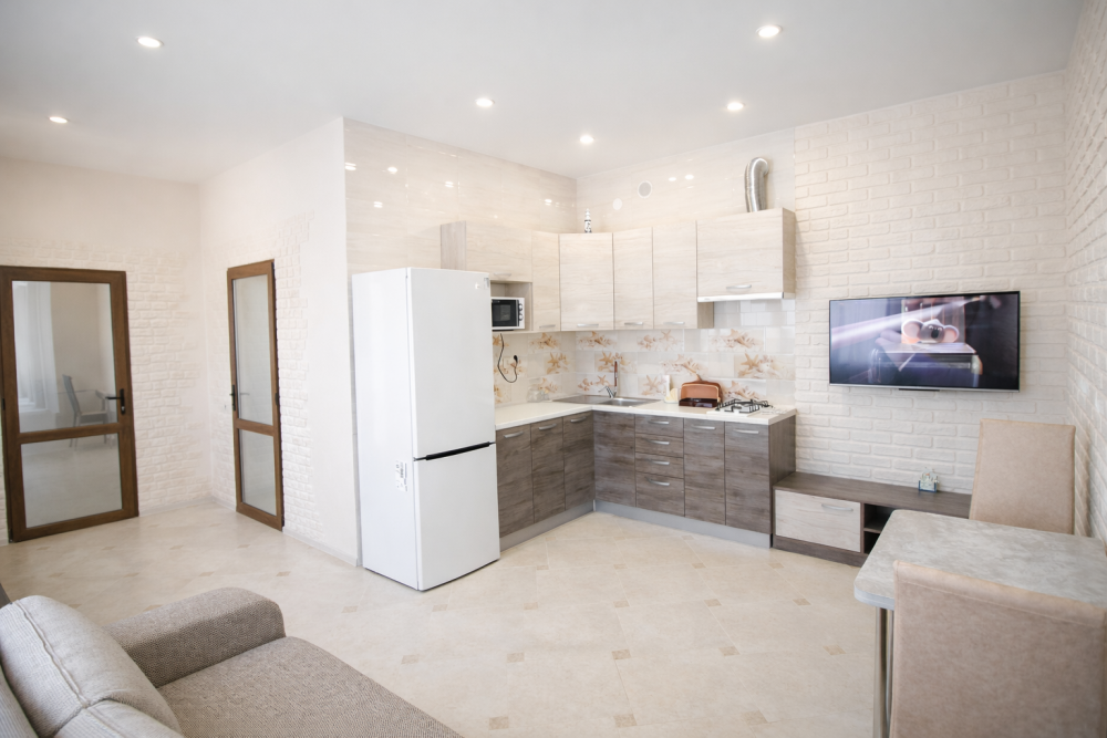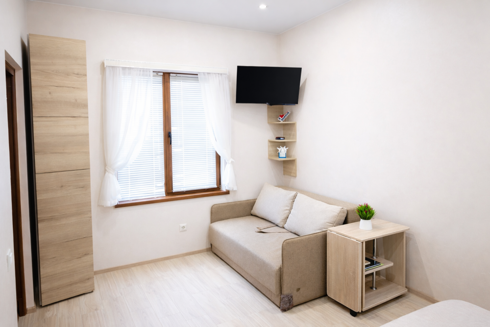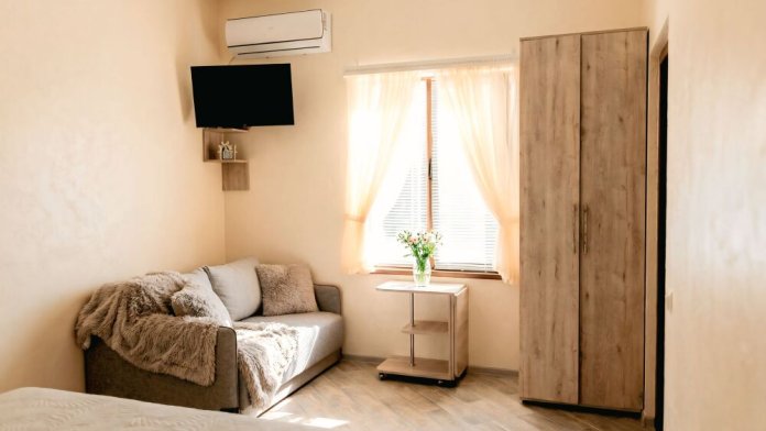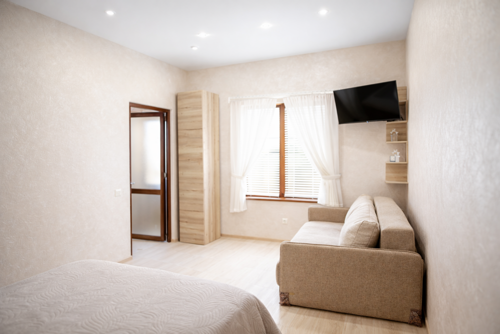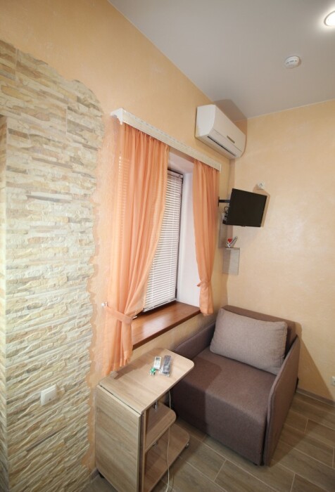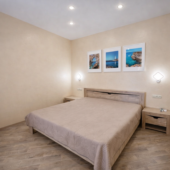 В номере есть: двуспальная кровать с ортопедическим матрасом, односпальное кресло-кровать, кондиционер, холодильник, шкаф, журнальный столик, Wi-Fi, современная сантехника и мебель, телевизор (кабельное телевидение), санузел, набор постельного белья и полотенец для каждого гостя, средства личной гигиены, сушилка для белья.