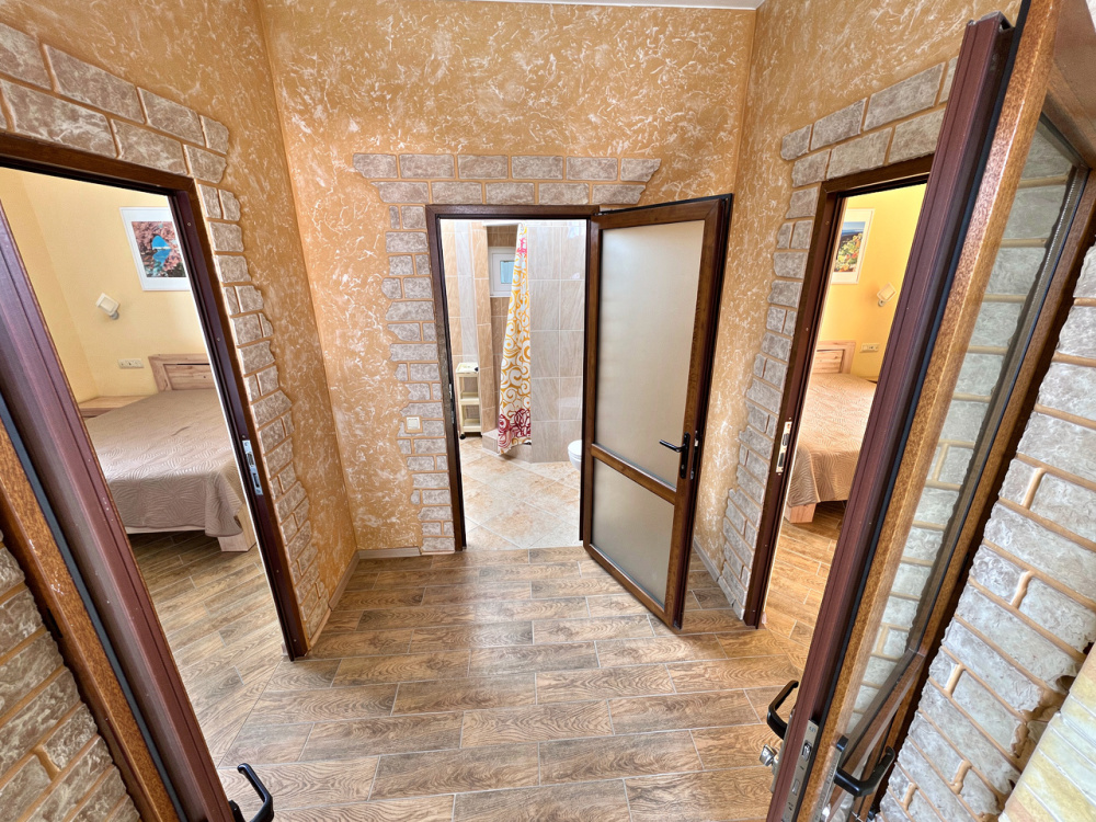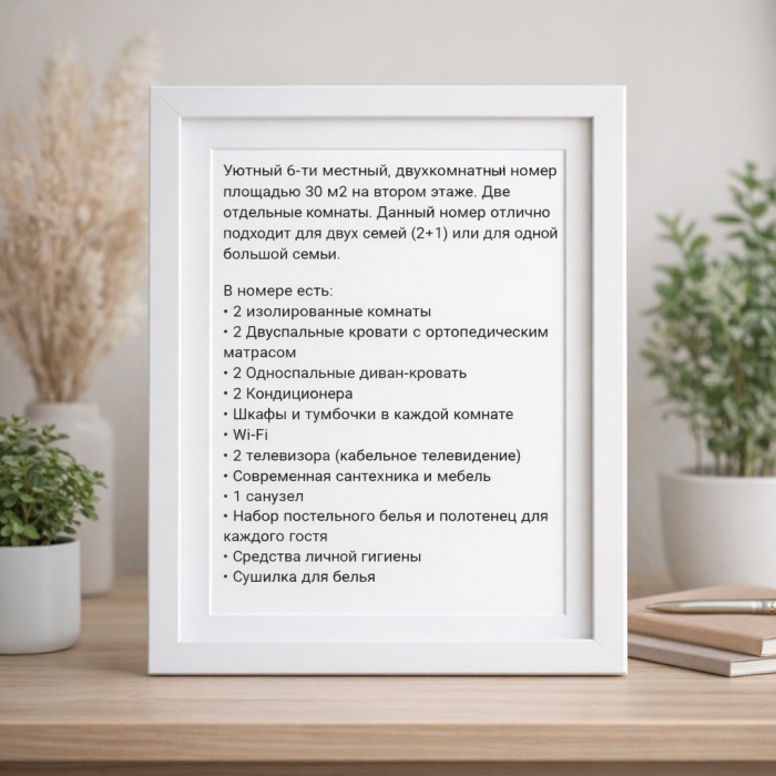 Уютный 6-ти местный, двухкомнатный номер площадью 30 м2 расположен на втором этаже. Две отдельные комнаты.