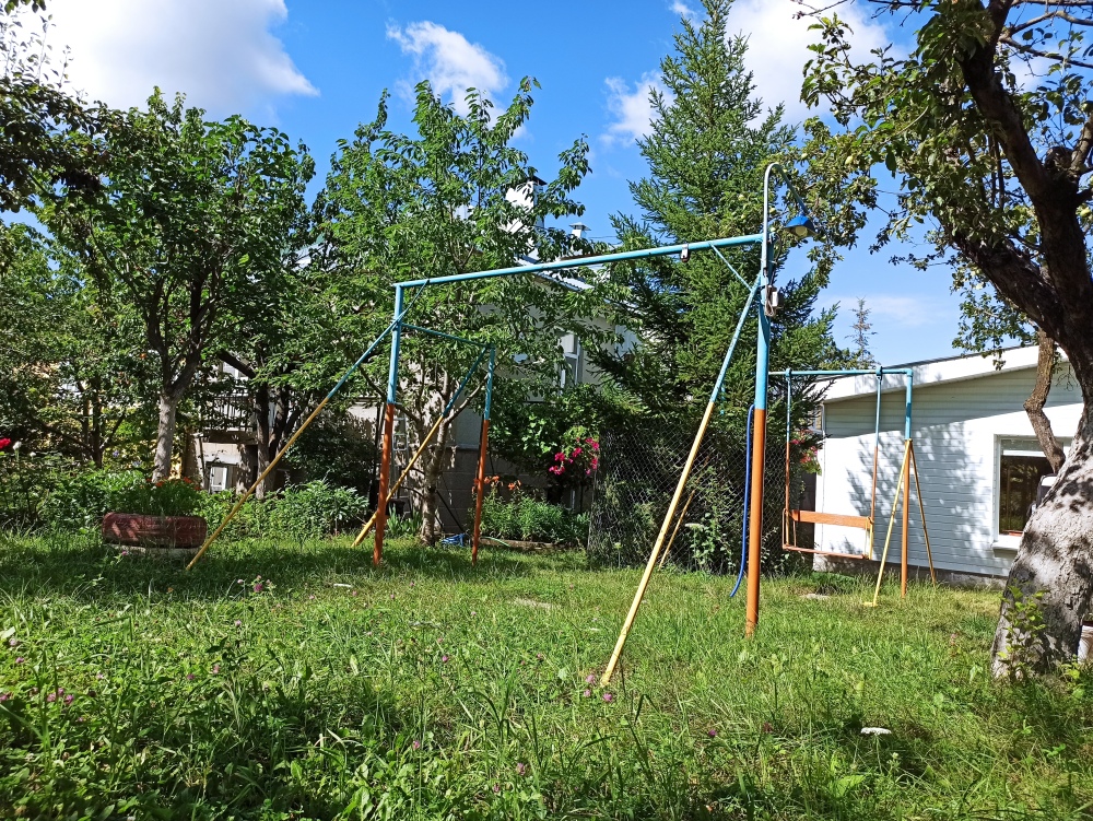На территории зеленый двор, зона для отдыха на свежем воздухе, обеденная зона, мангал, качели.