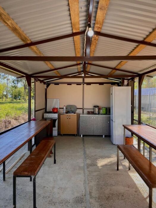 На территории базы для гостей есть общая кухня со всем необходимым, для самостоятельного приготовления пищи, зоны для отдыха на свежем воздухе, мангал, песочница для детей.