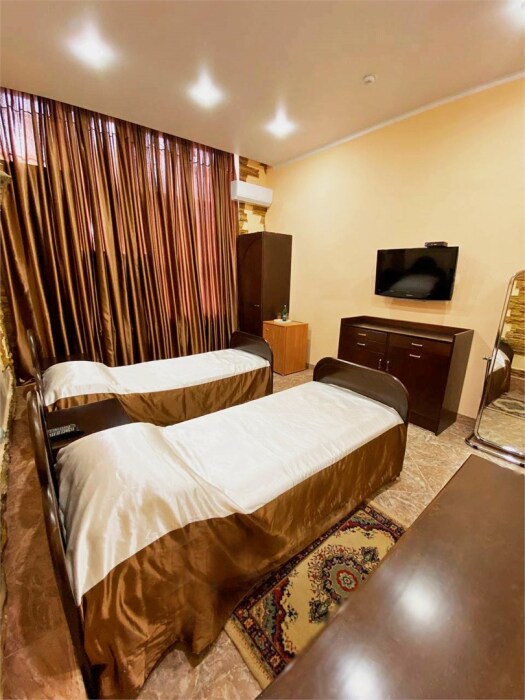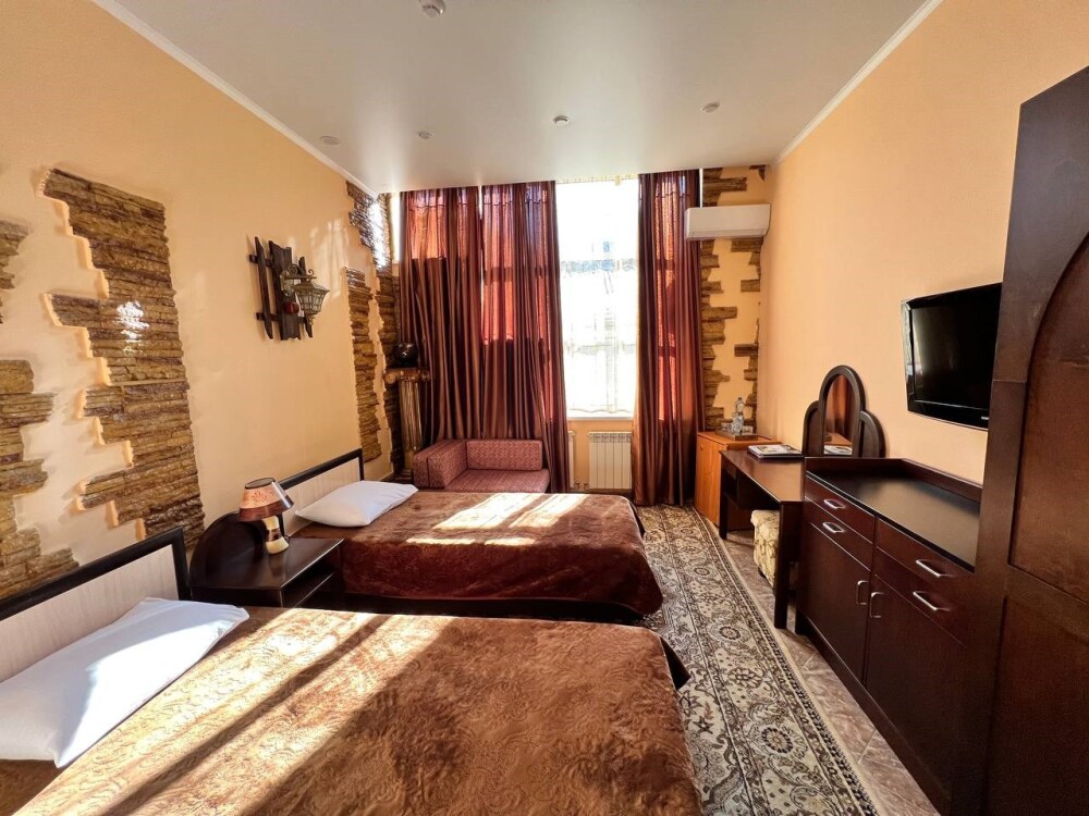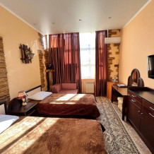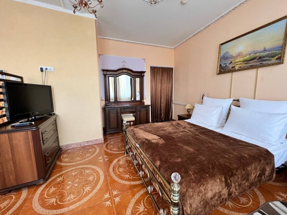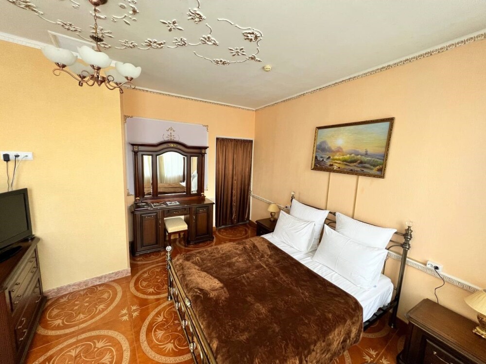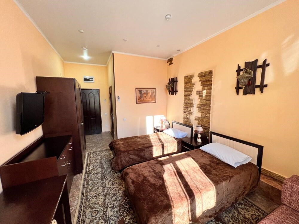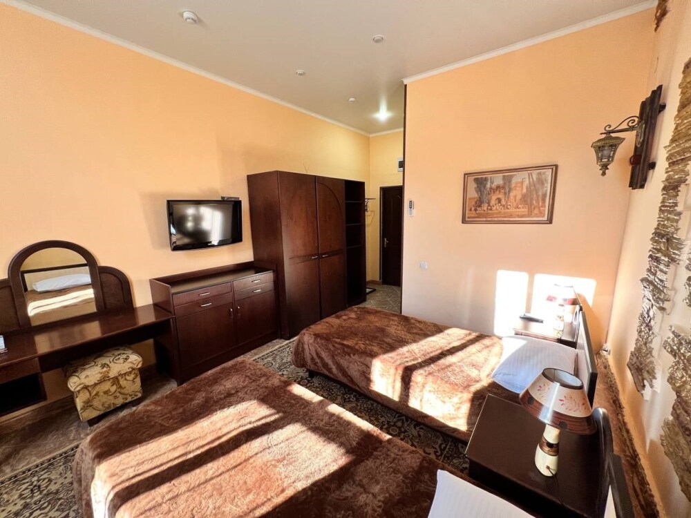 В номере кровати системы «спринг-бокс» - трансформируются в отдельные кровати. Так же: ортопедический матрас, мягкая мебель, ТВ, мини-холодильник, сейф, телефон, Wi-Fi, чайник, чашки, чай и кофе, питьевая вода. Балкон с видом на город. Совмещенный санузел с ванной, фен, гигиенические средства, косметические средства, полотенца, халат, тапочки, сушилка для белья.