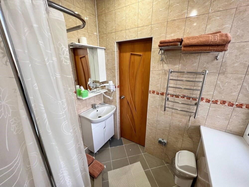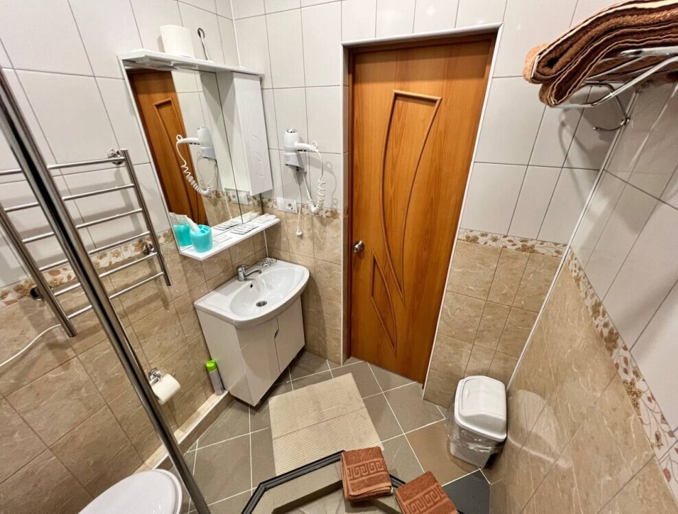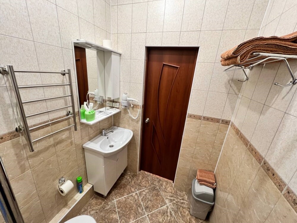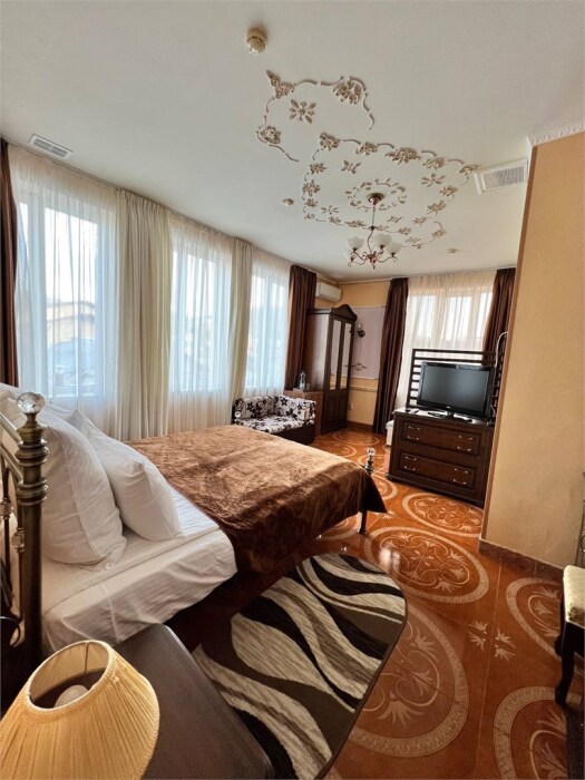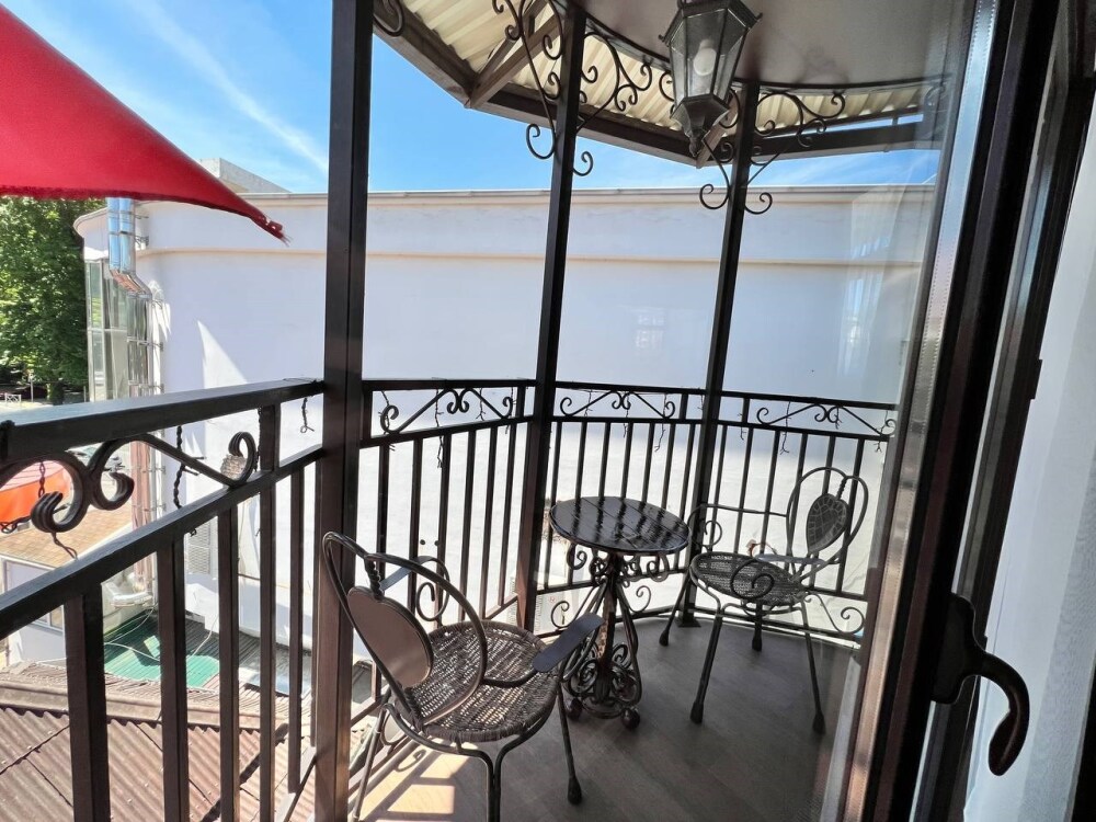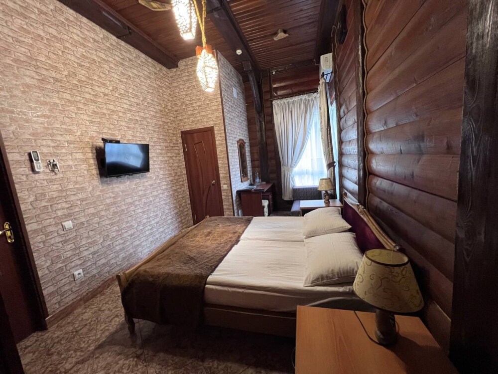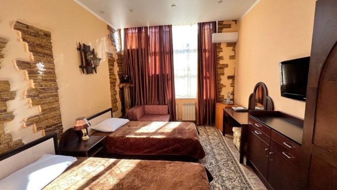 В номере кровати системы «спринг-бокс» - трансформируются в отдельные кровати. Так же: ортопедический матрас, мягкая мебель, ТВ, мини-холодильник, сейф, телефон, Wi-Fi, чайник, чашки, чай и кофе, питьевая вода. Балкон с видом на город. Совмещенный санузел с ванной, фен, гигиенические средства, косметические средства, полотенца, халат, тапочки, сушилка для белья.