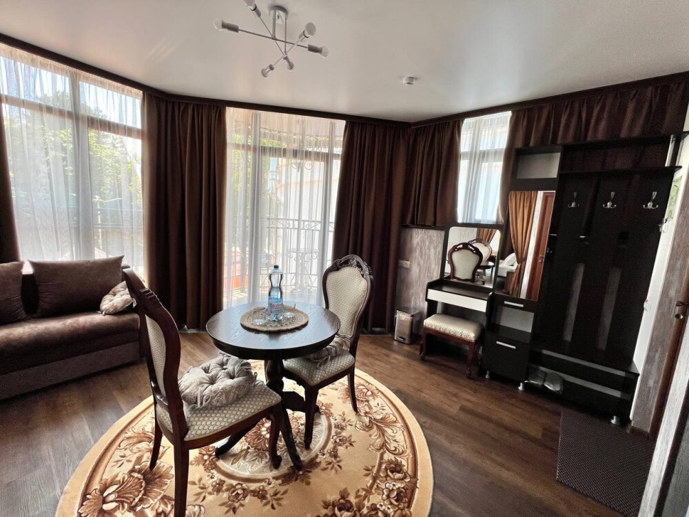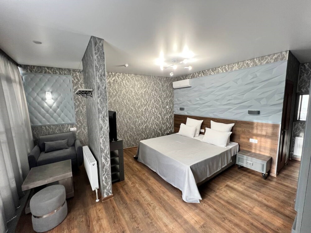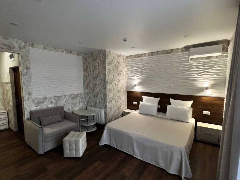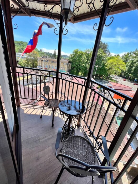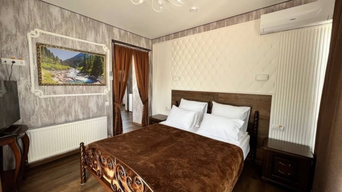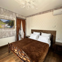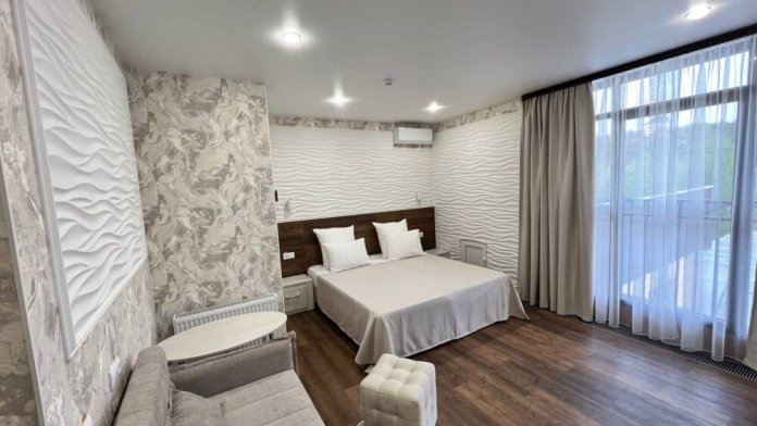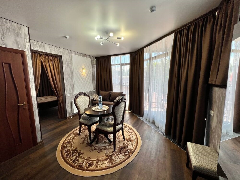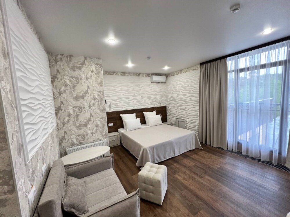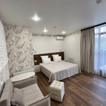 Совмещенный санузел с душевой, фен, гигиенические средства, косметические средства, полотенца, халат, тапочки; сушилка для белья. Двухкомнатный номер. В номере гостиная (1 комната) и спальня (2 комната); двуспальная кровать (DBL), ортопедический матрас, мягкая мебель, ТВ, мини-холодильник, КД, сейф, Wi-Fi, чайник, чашки, чай и кофе, питьевая вода. Балкон с видом на горы и город. Доп. место – диван.