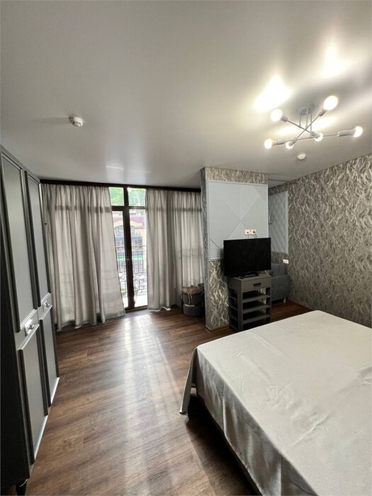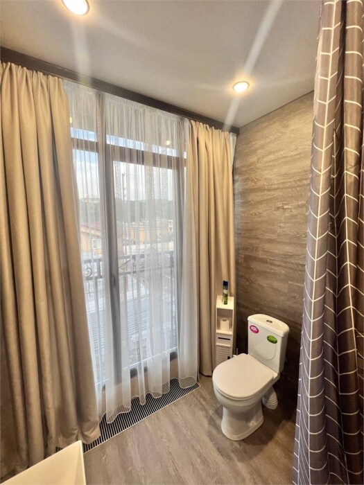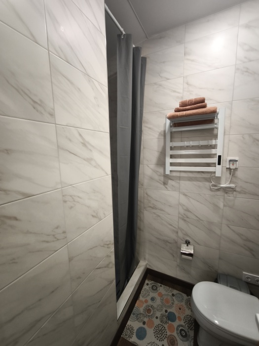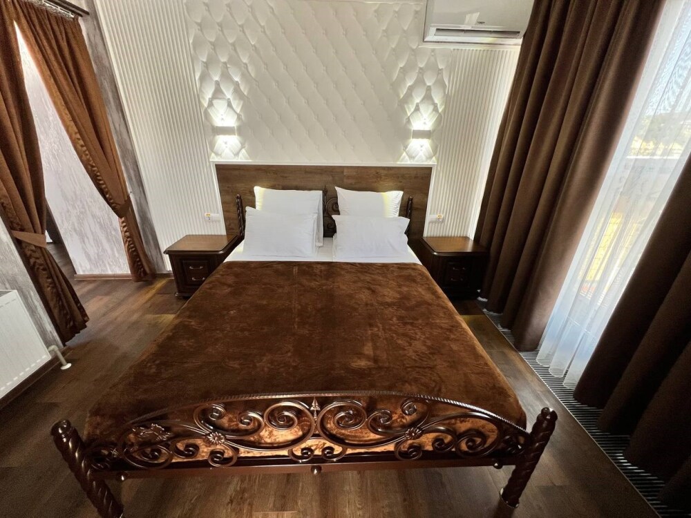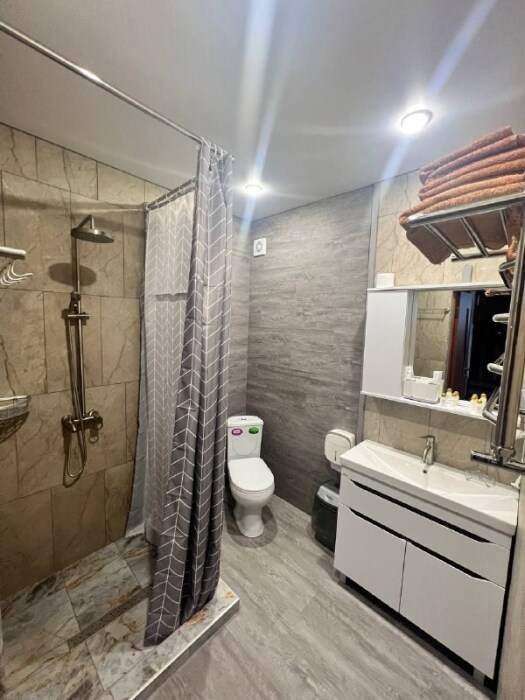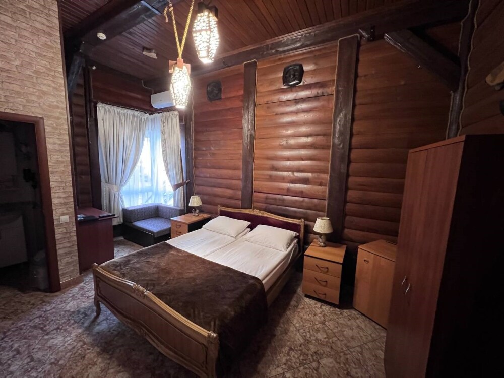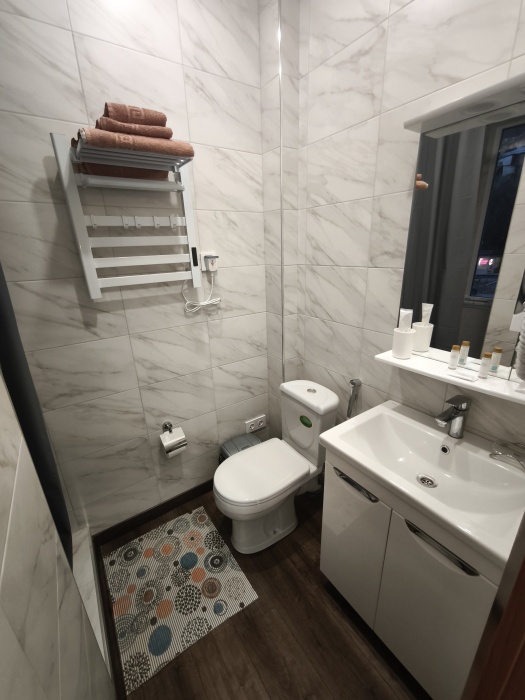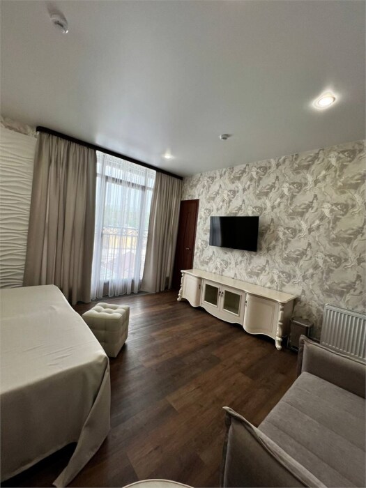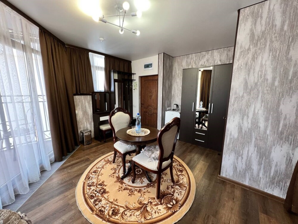 Совмещенный санузел с душевой, фен, гигиенические средства, косметические средства, полотенца, халат, тапочки; сушилка для белья. Двухкомнатный номер. В номере гостиная (1 комната) и спальня (2 комната); двуспальная кровать (DBL), ортопедический матрас, мягкая мебель, ТВ, мини-холодильник, КД, сейф, Wi-Fi, чайник, чашки, чай и кофе, питьевая вода. Балкон с видом на горы и город. Доп. место – диван.