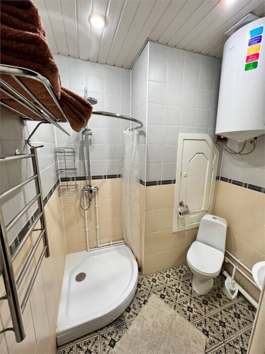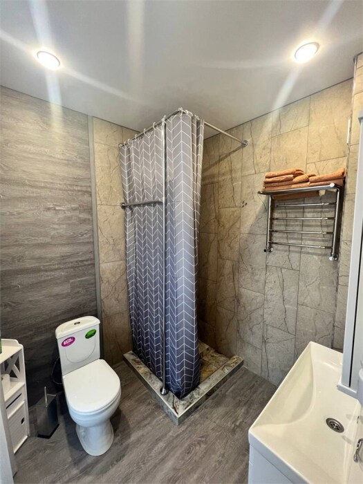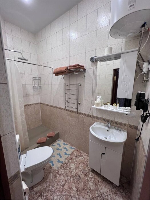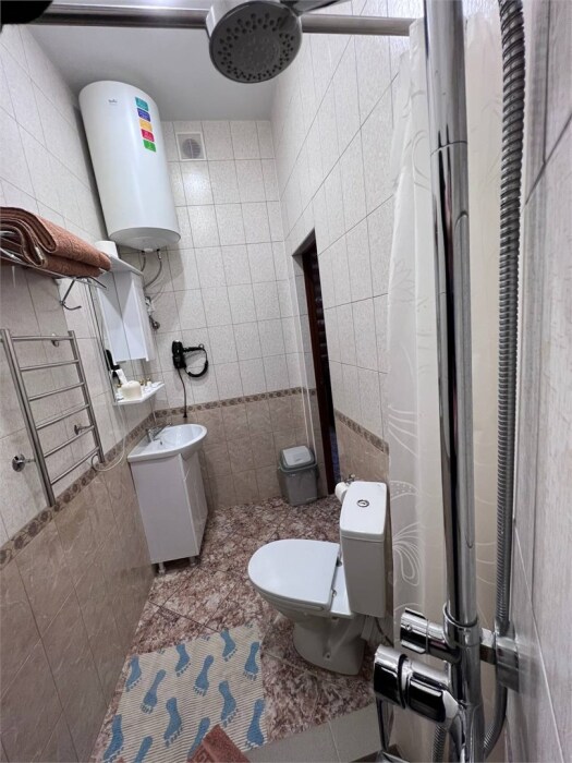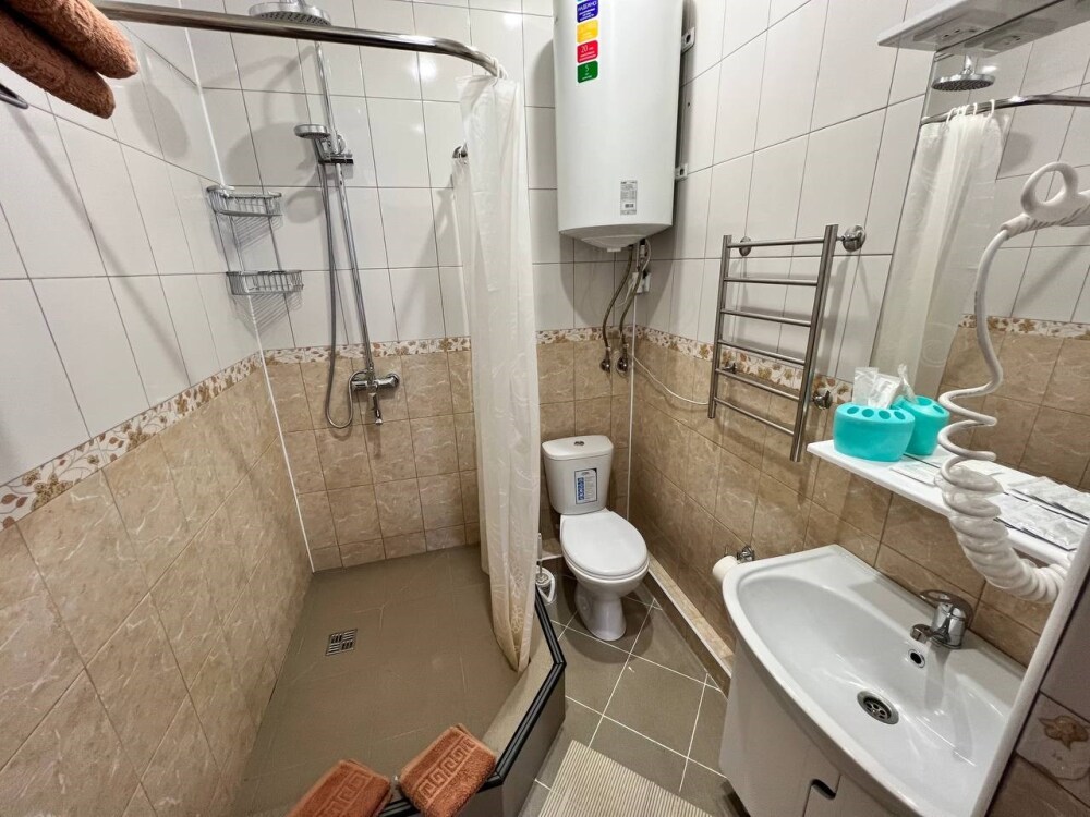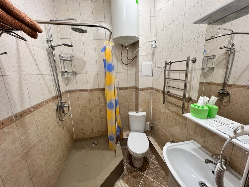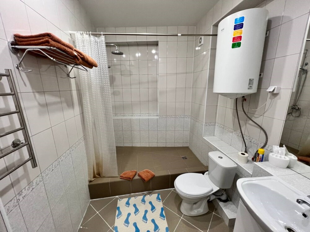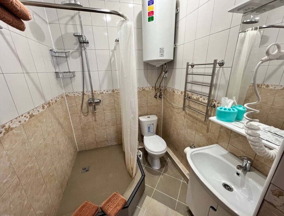 Совмещенный санузел с душевой, фен, гигиенические средства, косметические средства, полотенца, халат, тапочки; сушилка для белья. Двухкомнатный номер. В номере гостиная (1 комната) и спальня (2 комната); двуспальная кровать (DBL), ортопедический матрас, мягкая мебель, ТВ, мини-холодильник, КД, сейф, Wi-Fi, чайник, чашки, чай и кофе, питьевая вода. Балкон с видом на горы и город. Доп. место – диван.