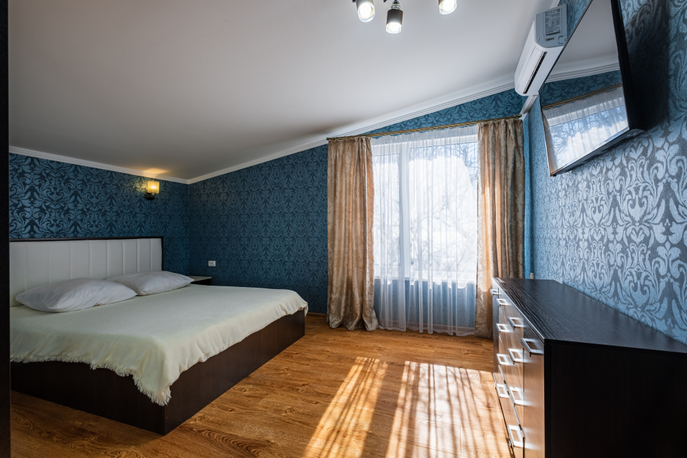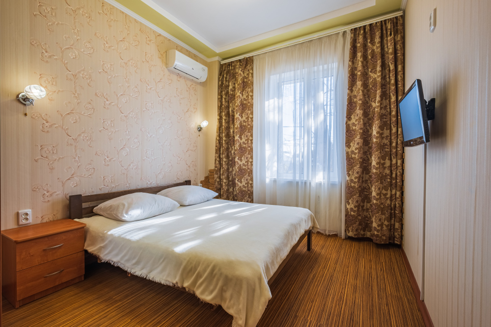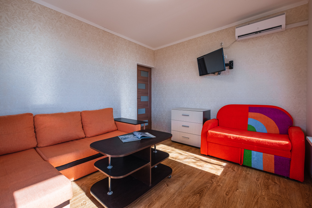 Комнаты в номере раздельные. Первая с двуспальной кроватью с удобным анатомическим беспружинным матрасом. Во второй комнате удобный двуспальный диван. В каждой комнате плазменный телевизор и кондиционер для Вашего удобства. Многие наши гости, с удовольствием спят и отдыхают на террасе на свежем чистом воздухе.