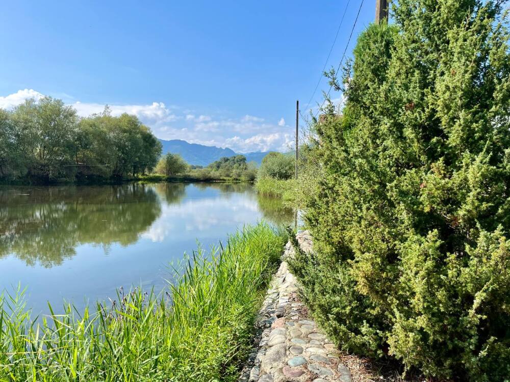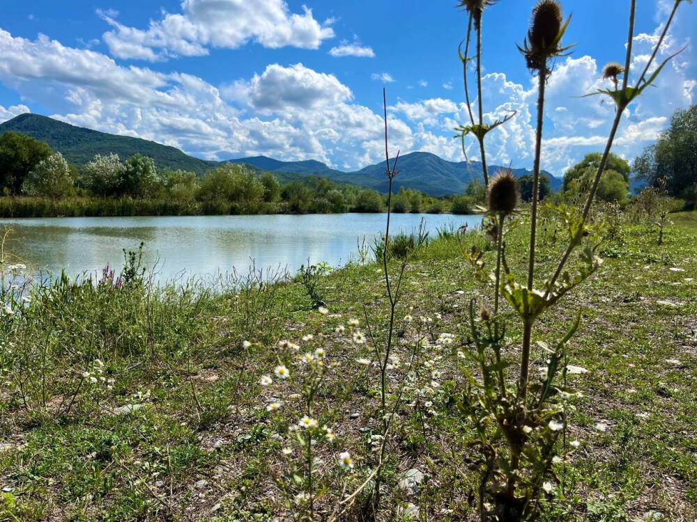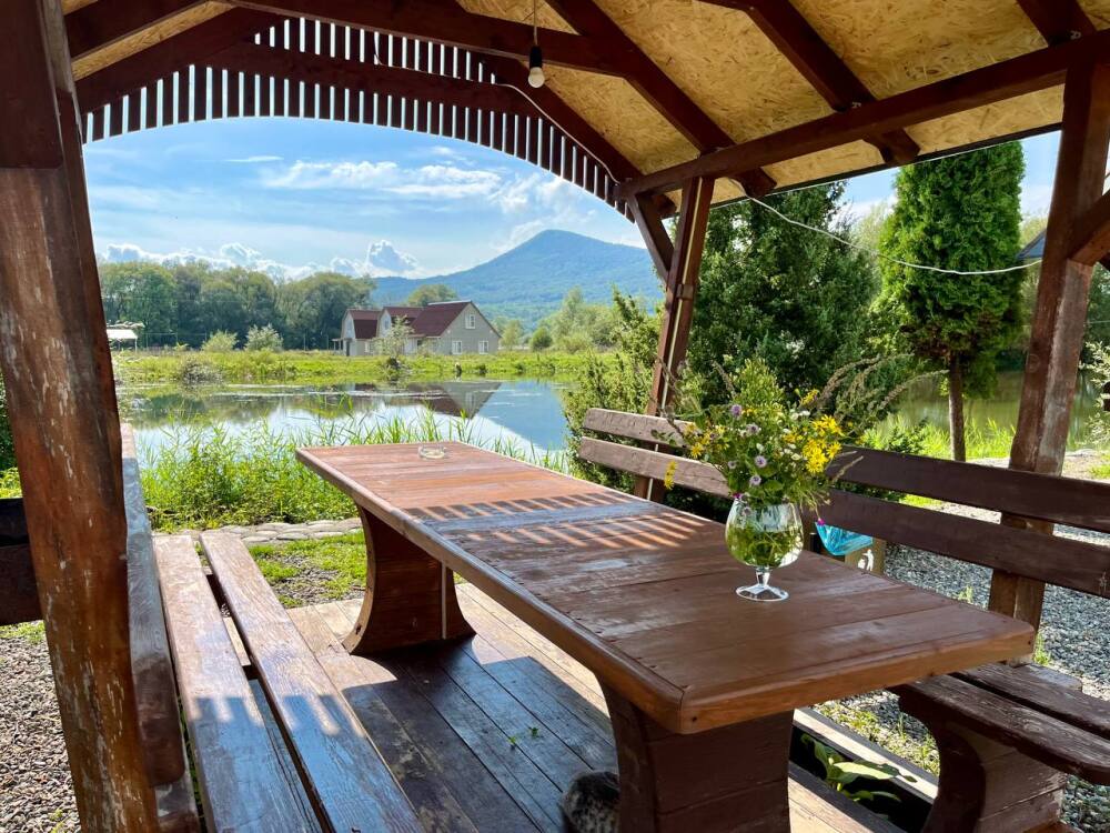 Рядом: горы, лес, озеро, река Белая с подвесным мостом, красота и свежесть.