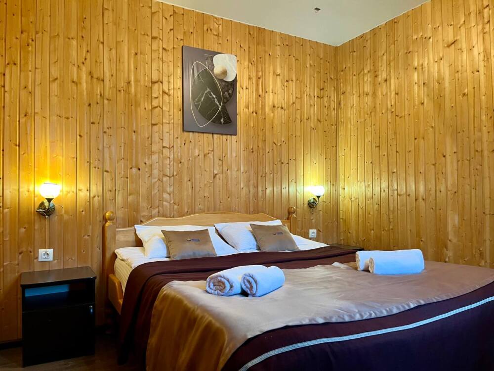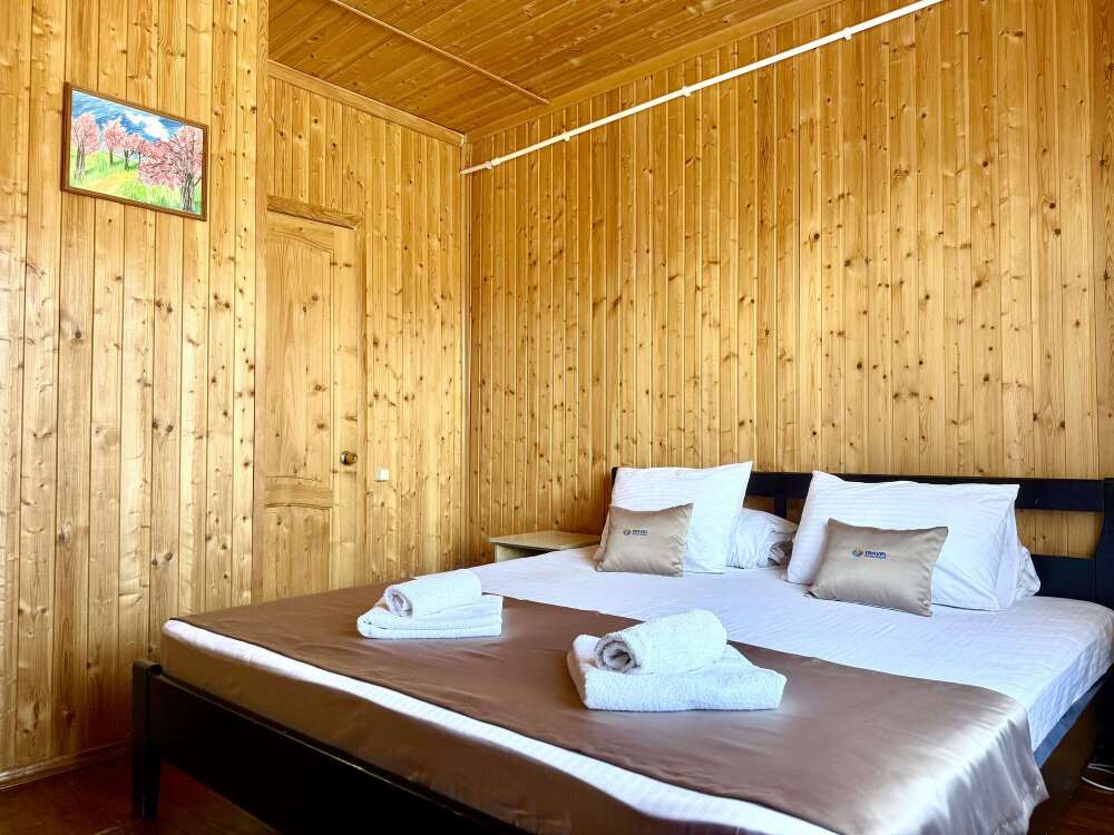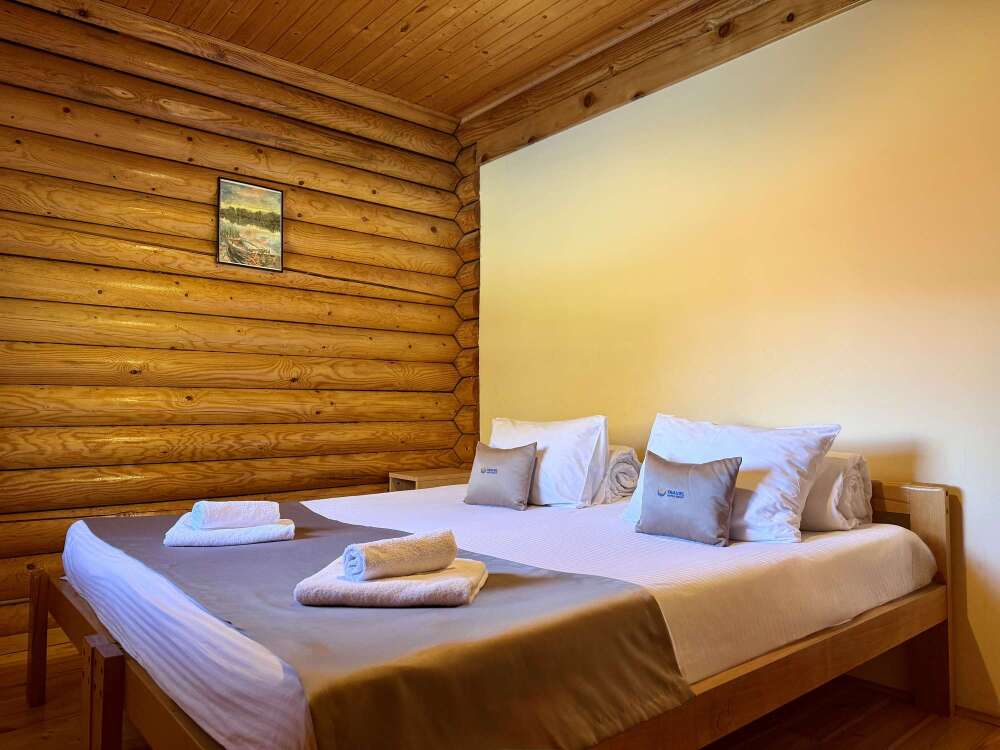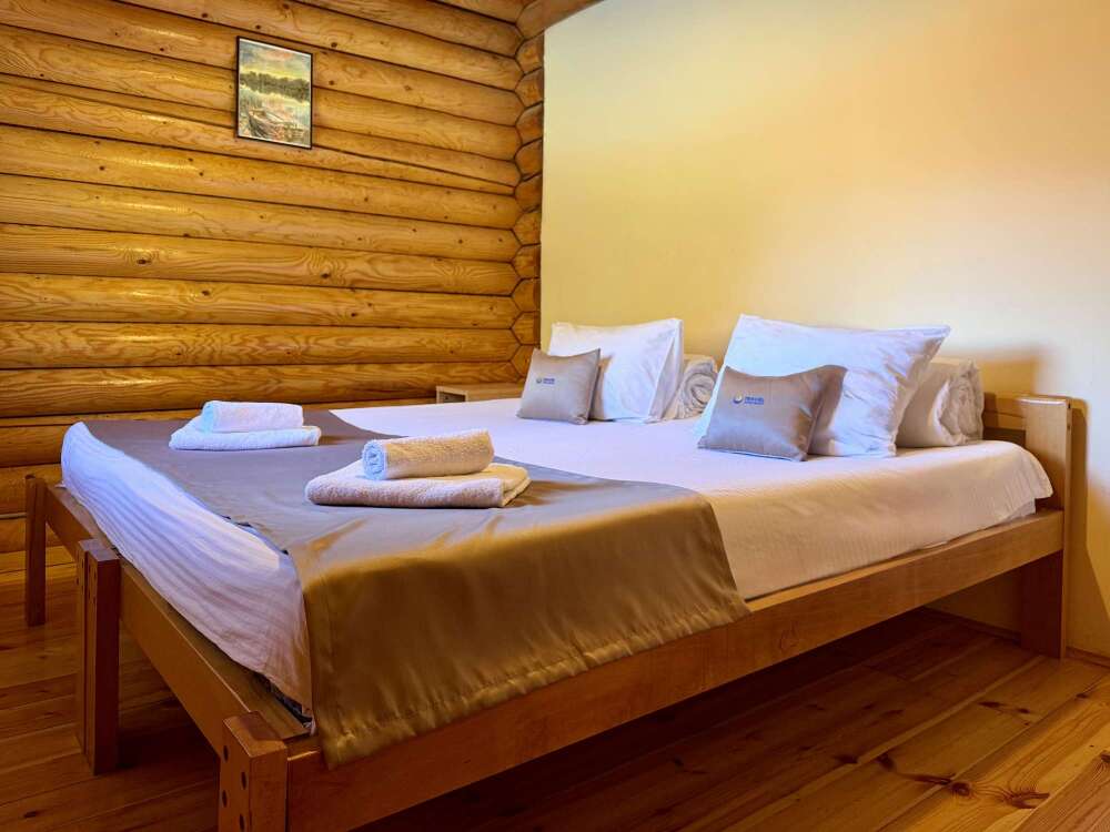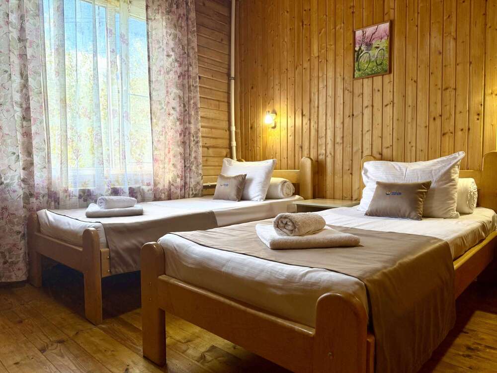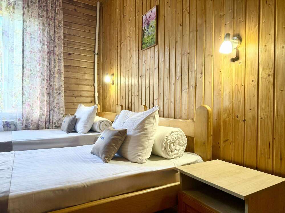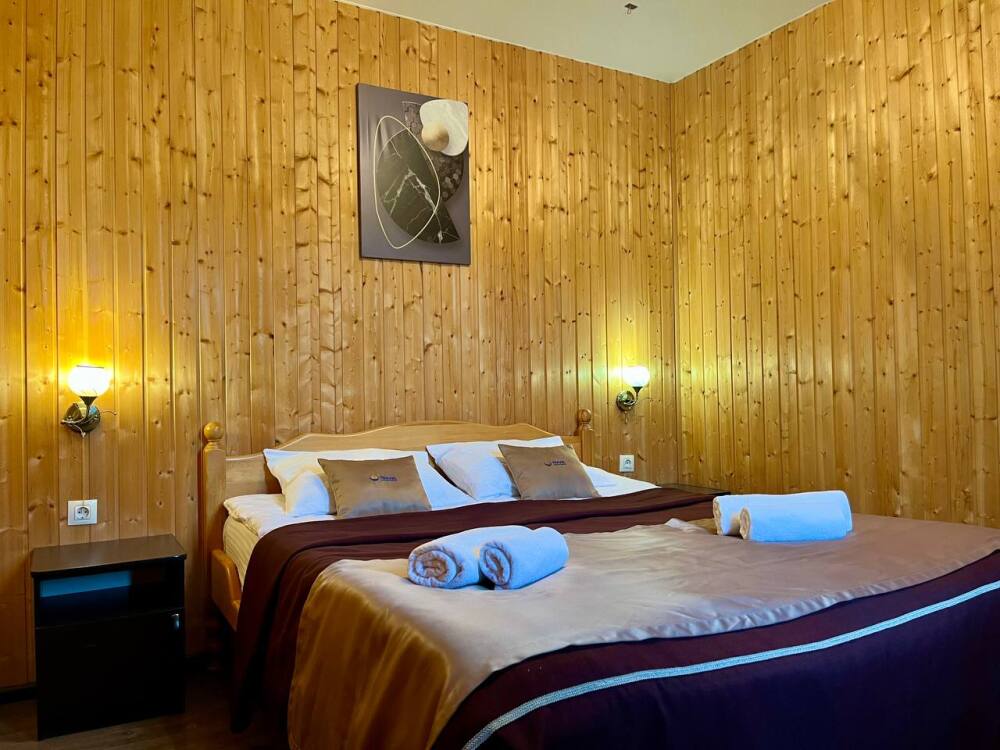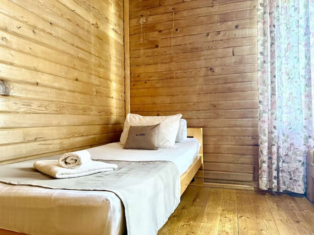 Уютные двухместные номера выполнены в эко‑стиле — в них легко дышится, много натуральных материалов и ощущение спокойствия. Просторная кровать с тёплыми одеялами и ортопедическими подушками обеспечивает по‑настоящему комфортный отдых.