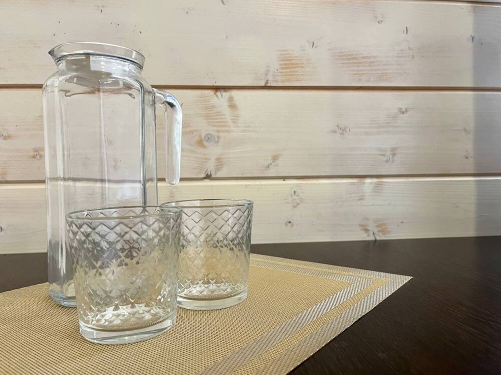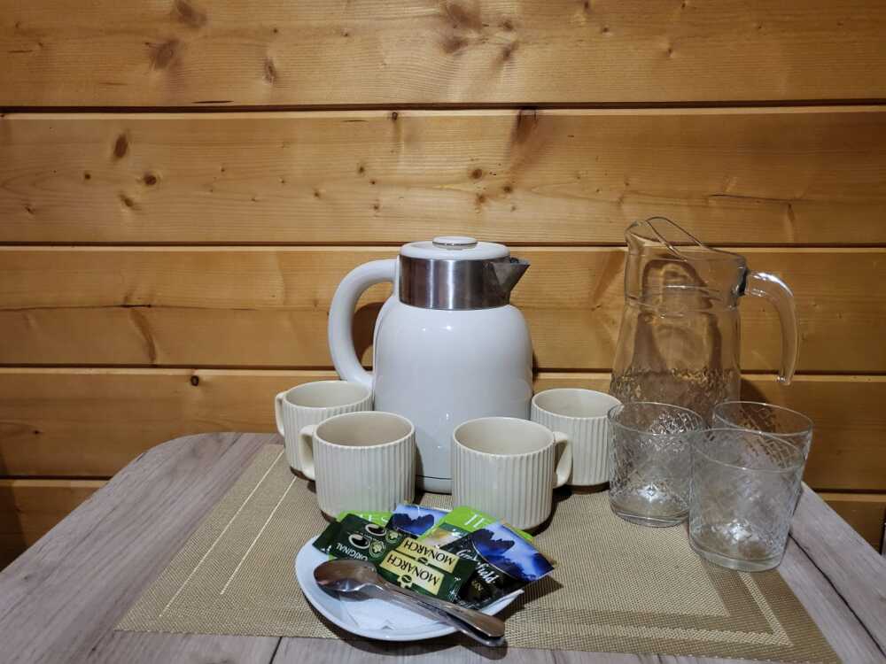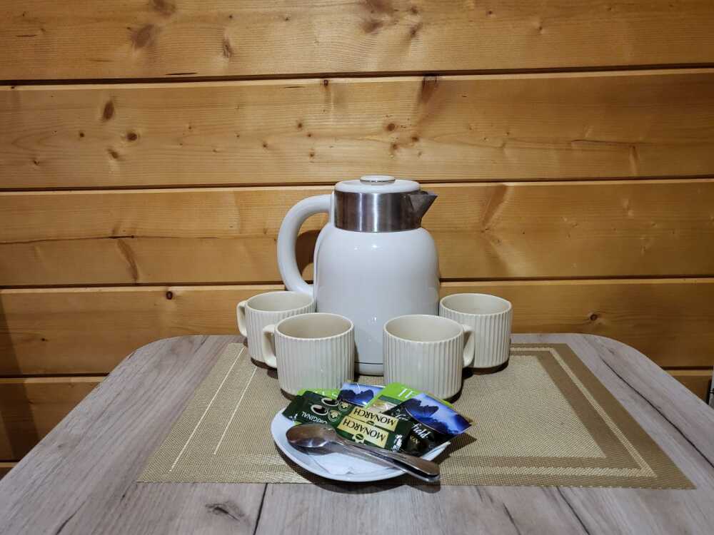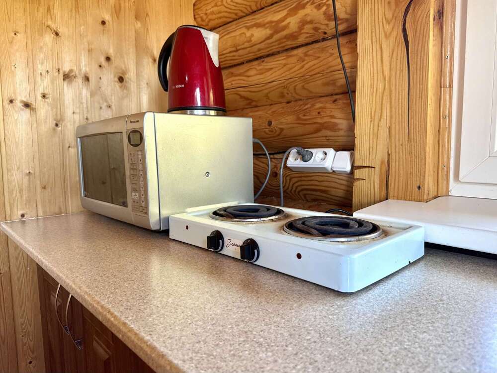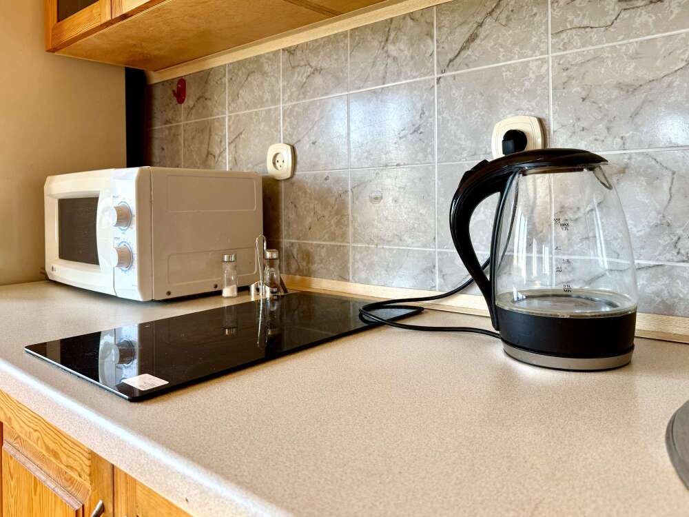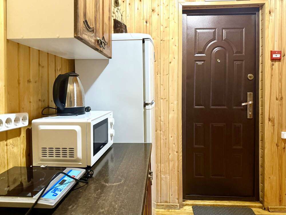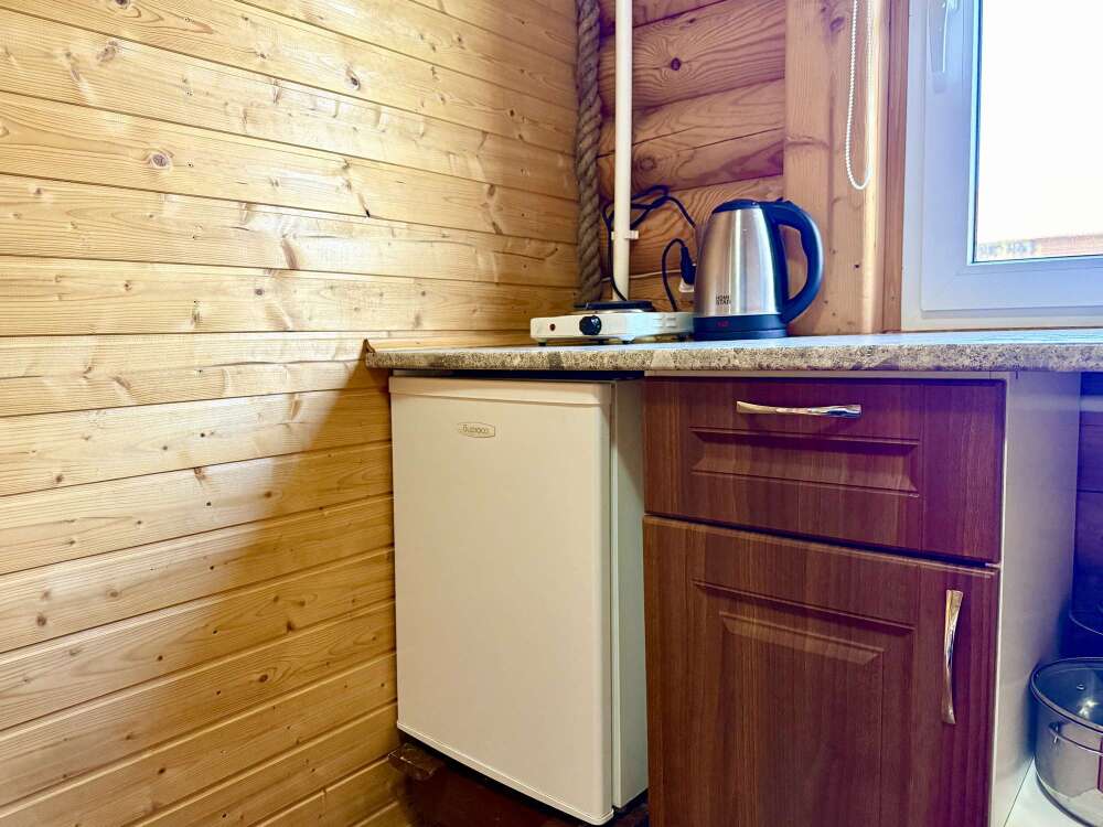 - оборудованная кухонная зона: электрочайник, мини-холодильник, индукционная плита, посуда и кухонные принадлежности