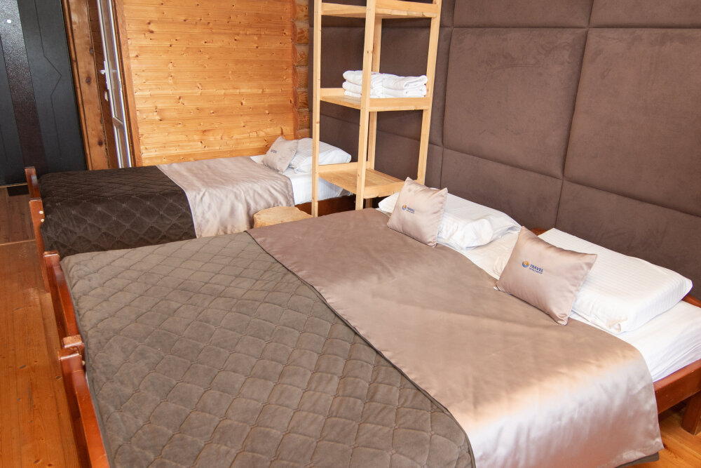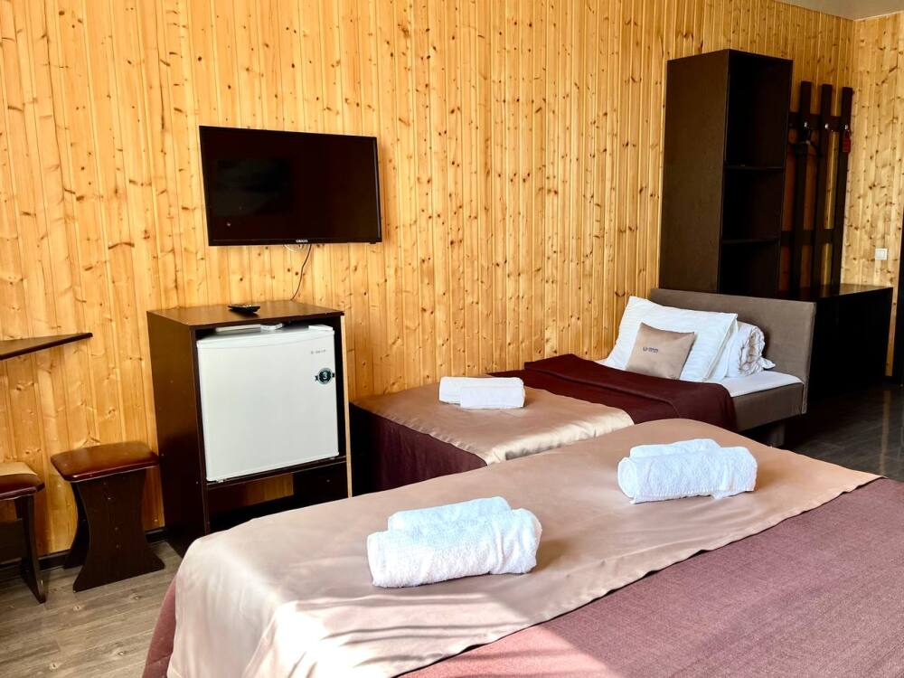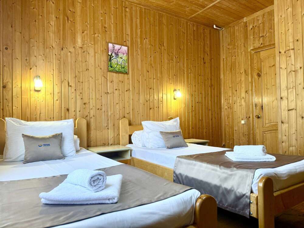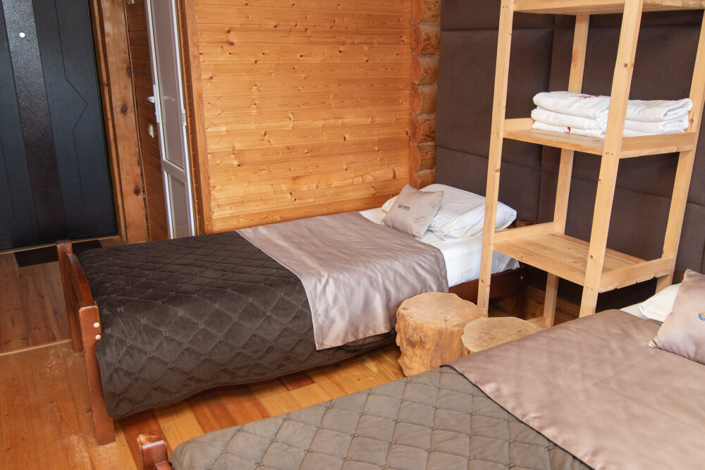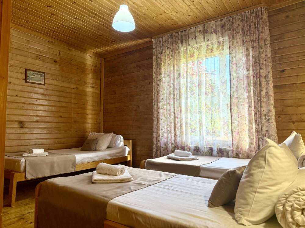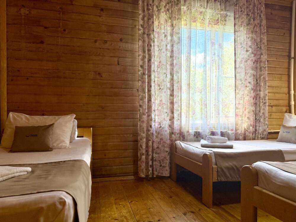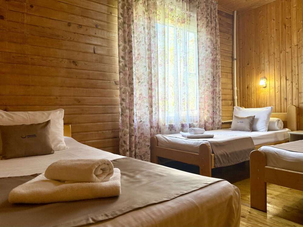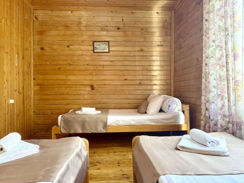 Уютные трёхместные номера оформлены в лёгком эко‑стиле, создающем атмосферу природной гармонии и спокойствия. В номере расположены двуспальная и односпальная кровати с тёплыми одеялами и ортопедическими подушками — каждый гость чувствует себя максимально комфортно.