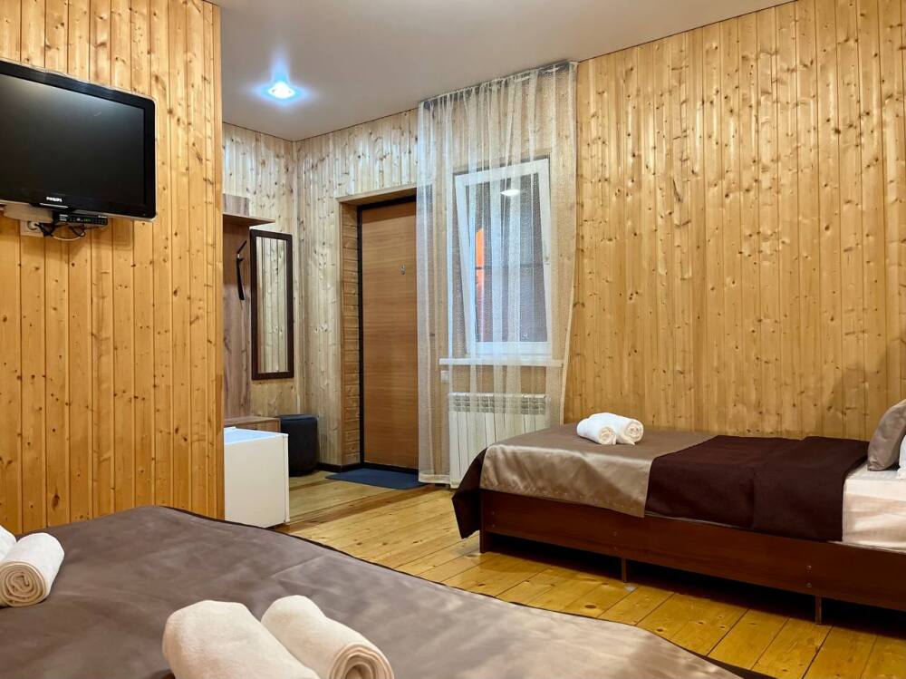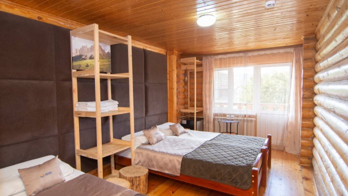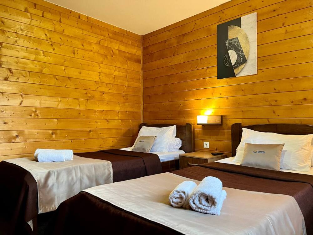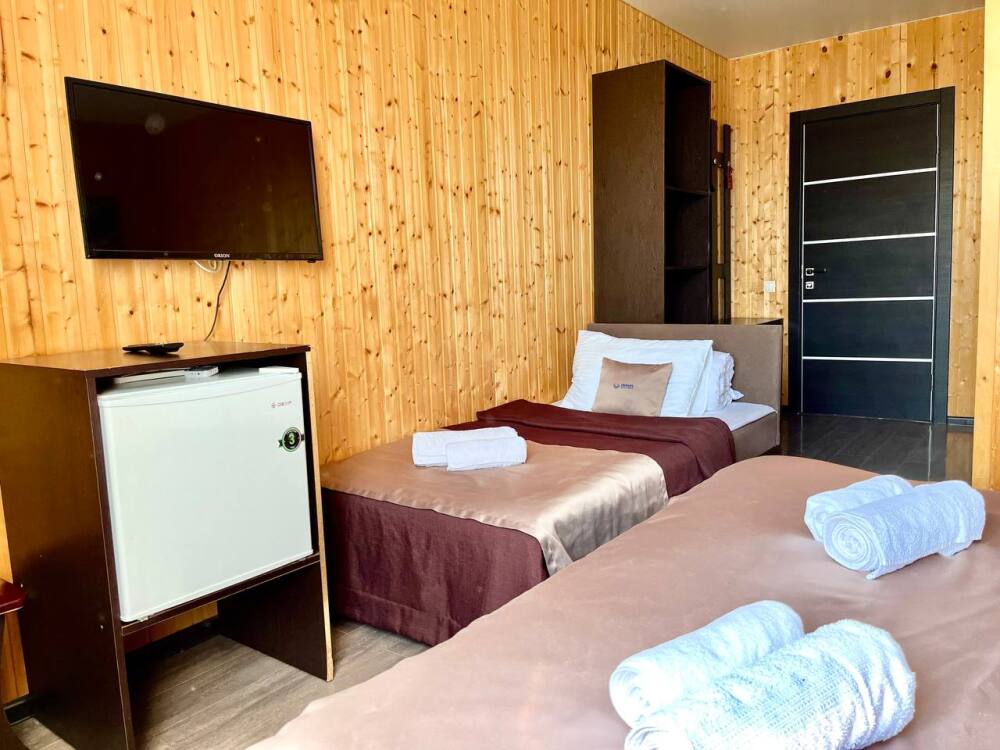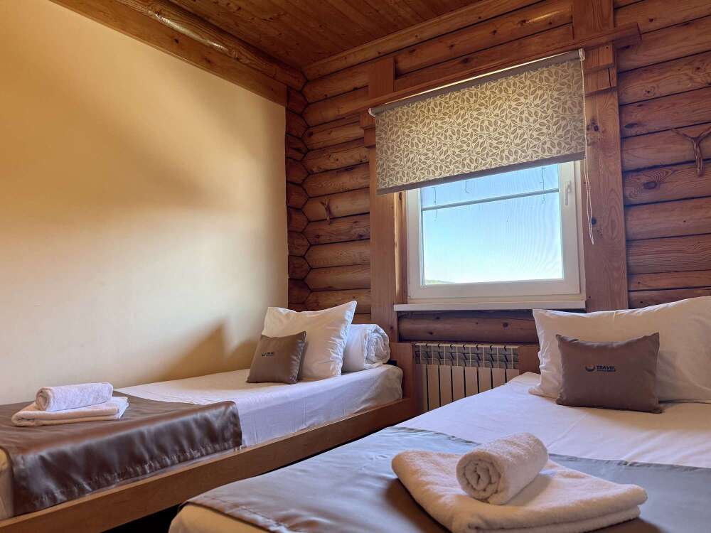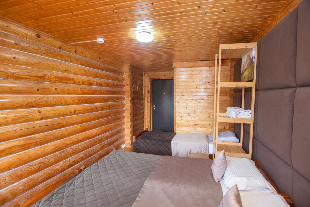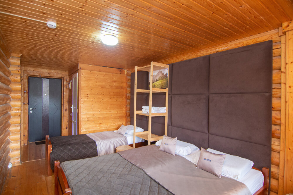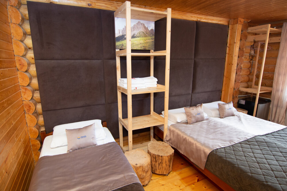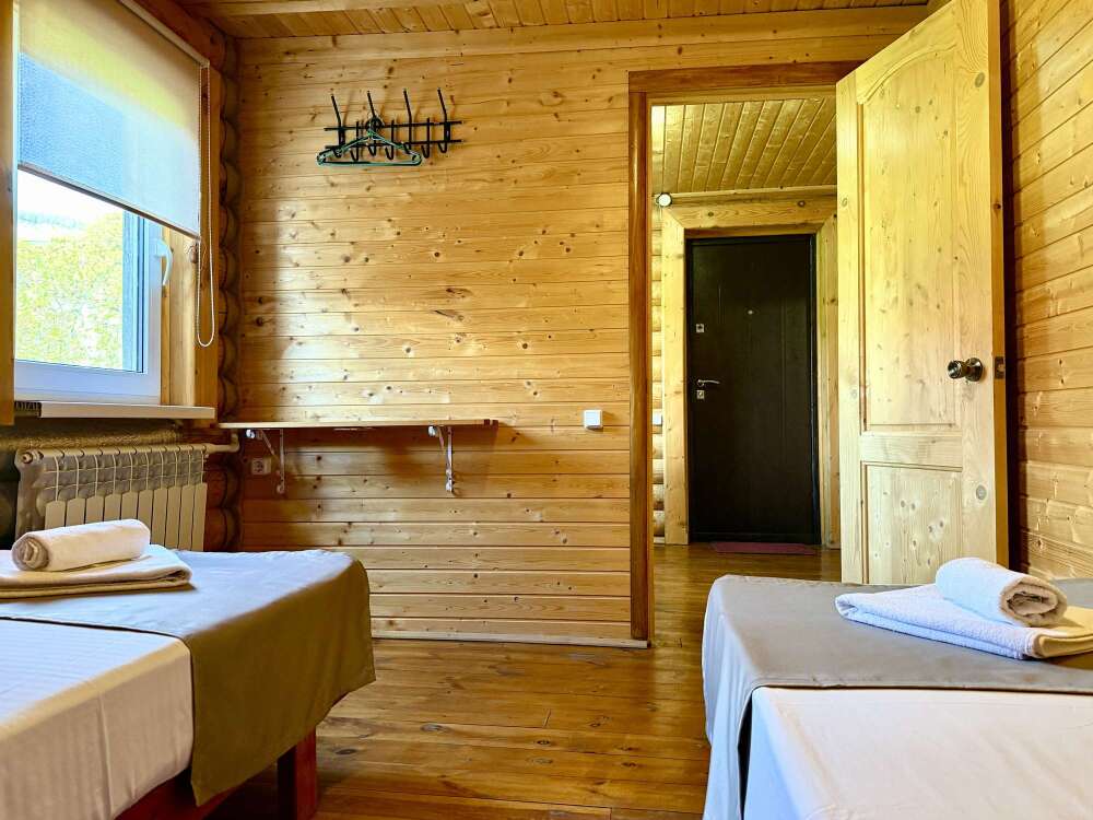 Уютные трёхместные номера оформлены в лёгком эко‑стиле, создающем атмосферу природной гармонии и спокойствия. В номере расположены двуспальная и односпальная кровати с тёплыми одеялами и ортопедическими подушками — каждый гость чувствует себя максимально комфортно.