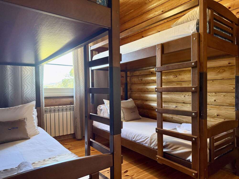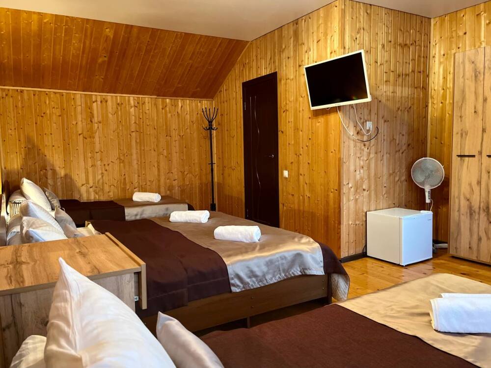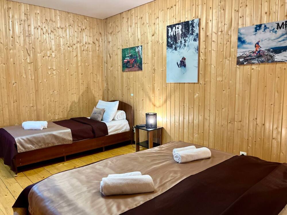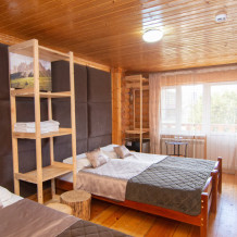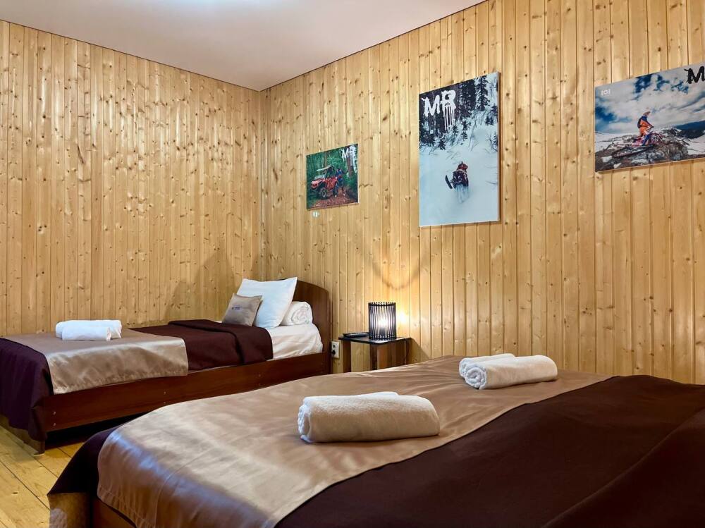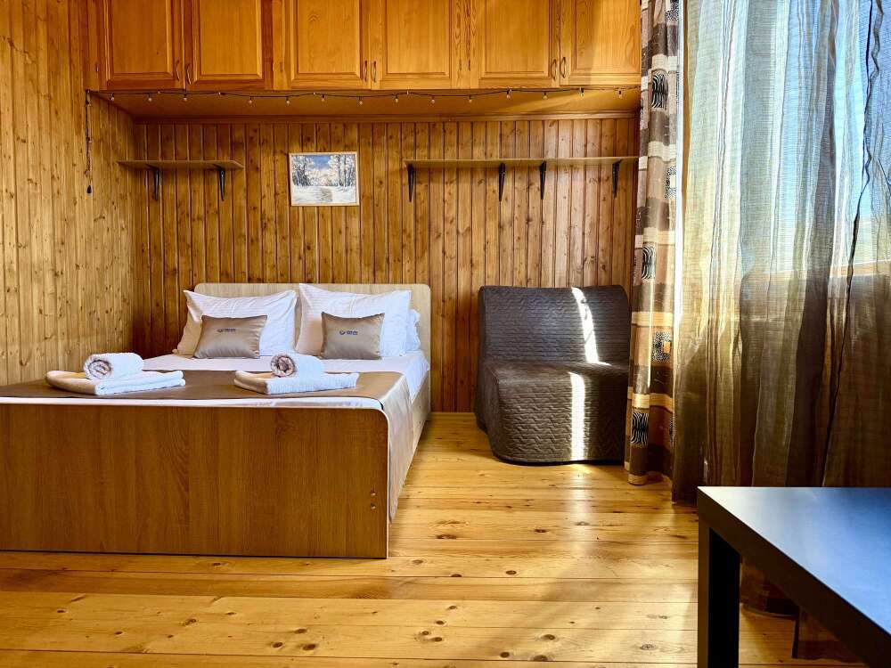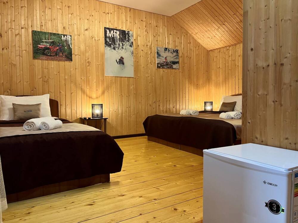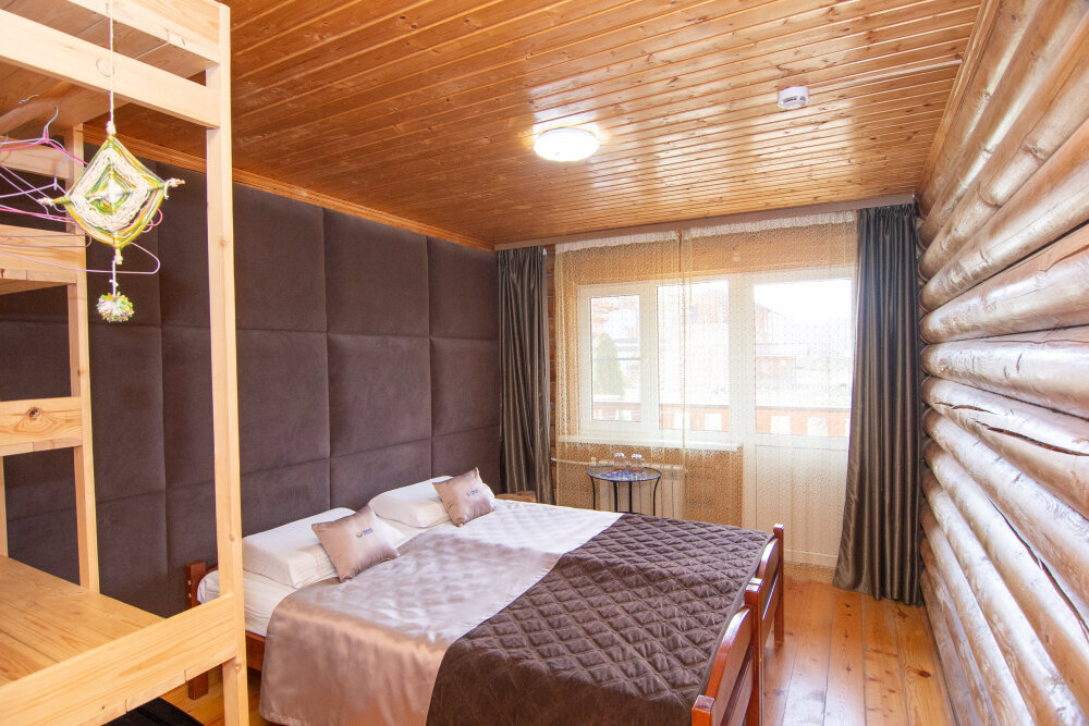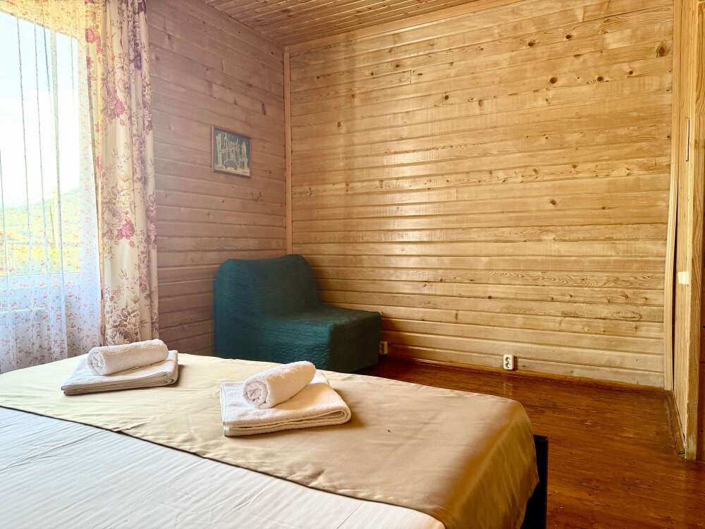 Уютные трёхместные номера оформлены в лёгком эко‑стиле, создающем атмосферу природной гармонии и спокойствия. В номере расположены двуспальная и односпальная кровати с тёплыми одеялами и ортопедическими подушками — каждый гость чувствует себя максимально комфортно.