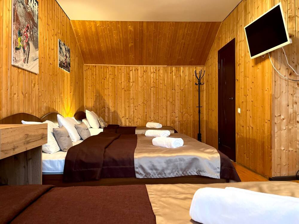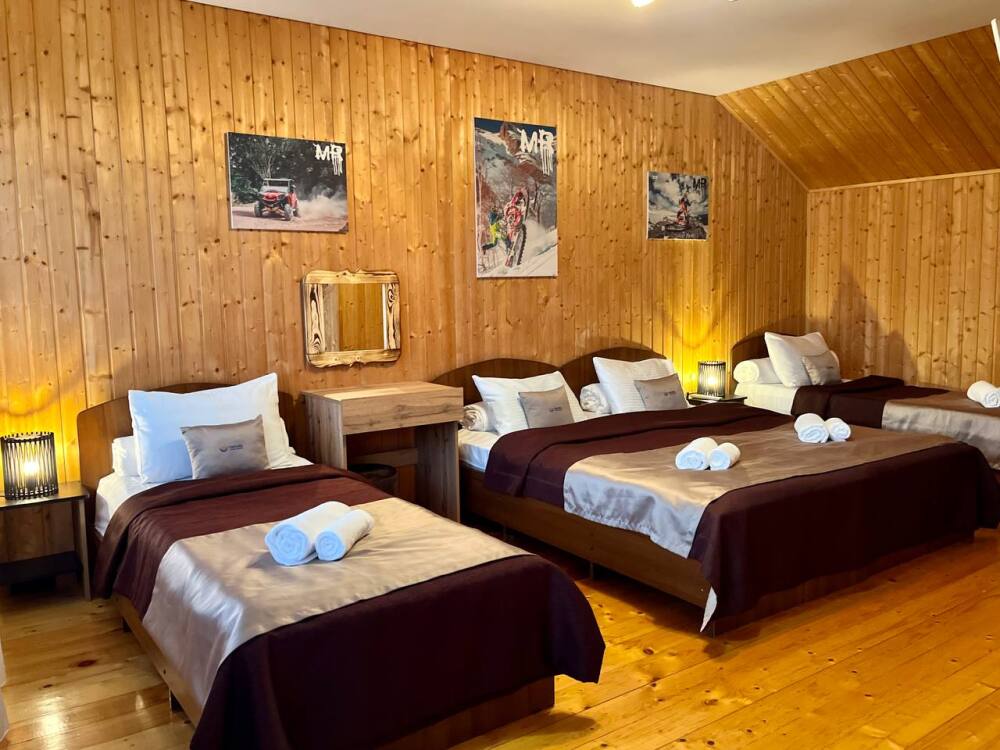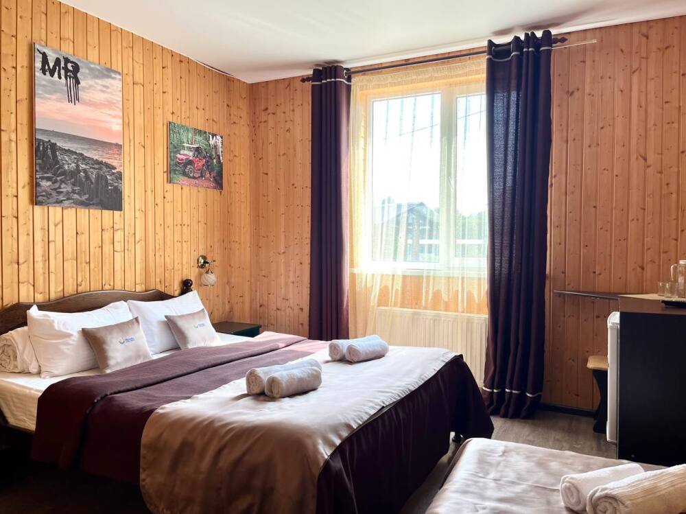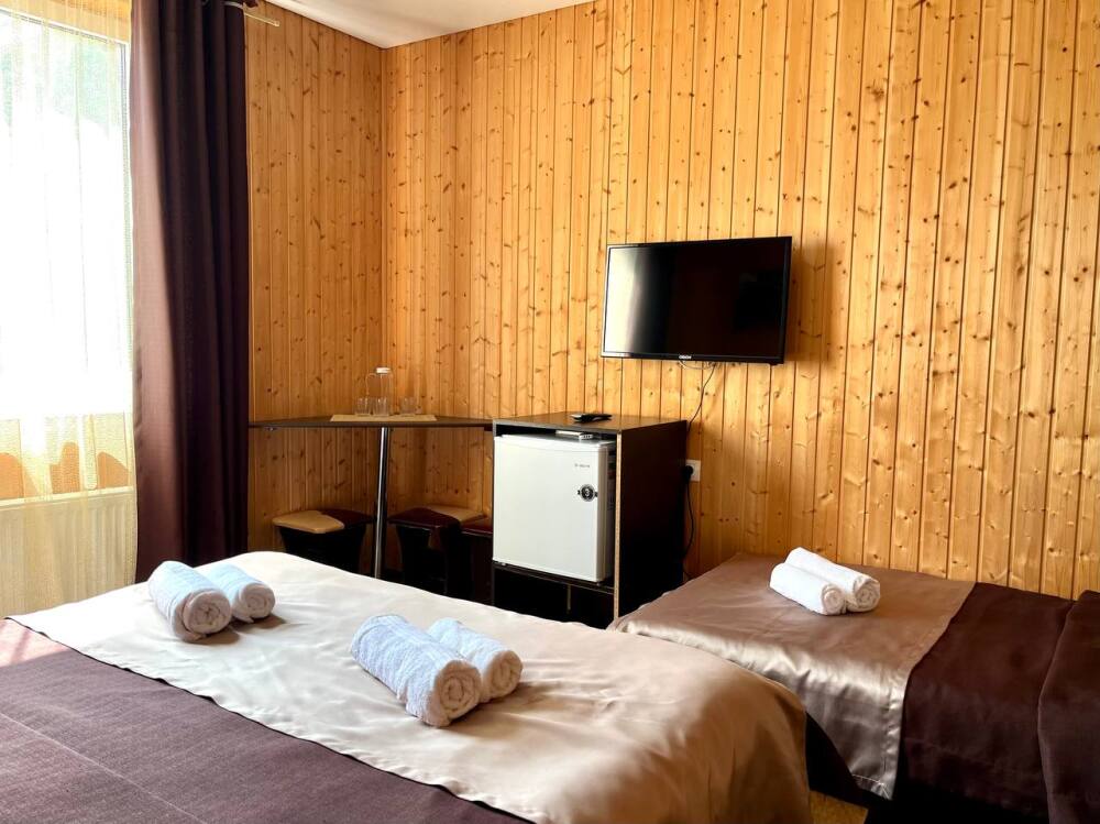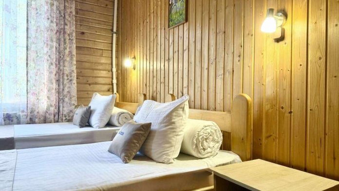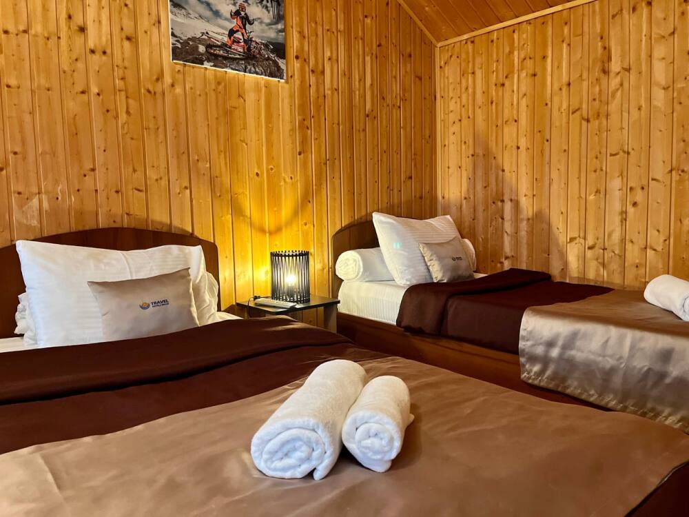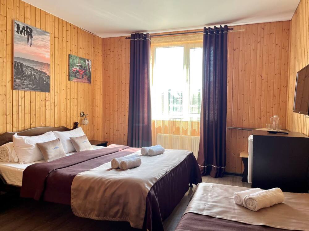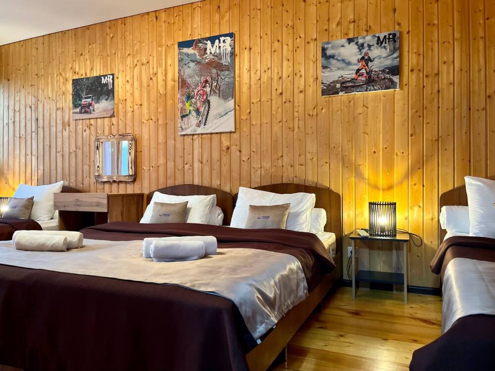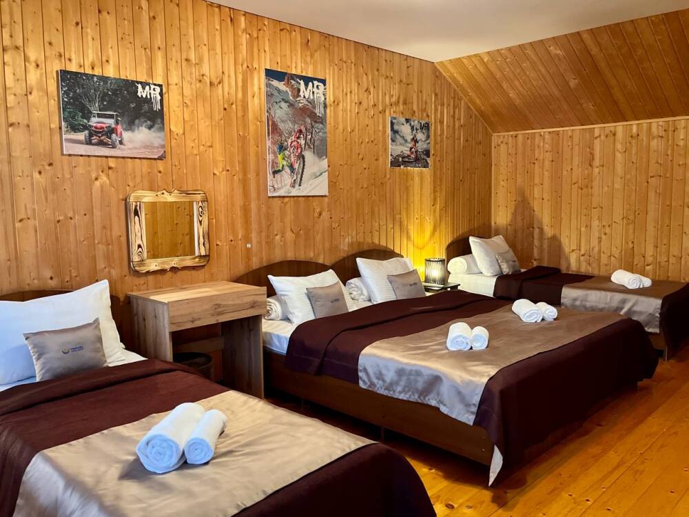 Уютные трёхместные номера оформлены в лёгком эко‑стиле, создающем атмосферу природной гармонии и спокойствия. В номере расположены двуспальная и односпальная кровати с тёплыми одеялами и ортопедическими подушками — каждый гость чувствует себя максимально комфортно.