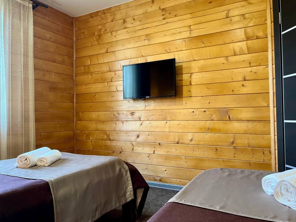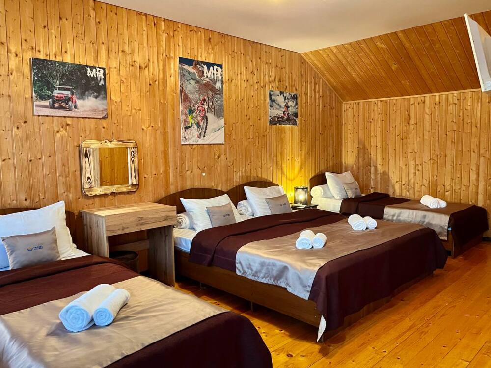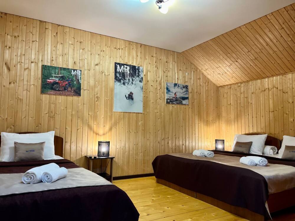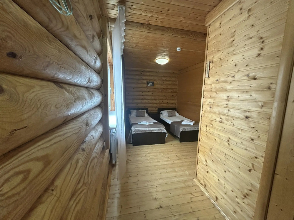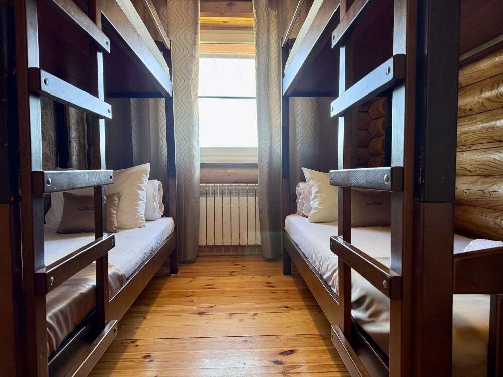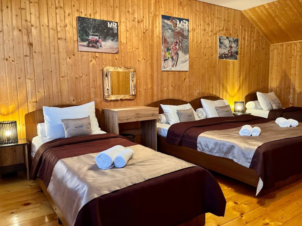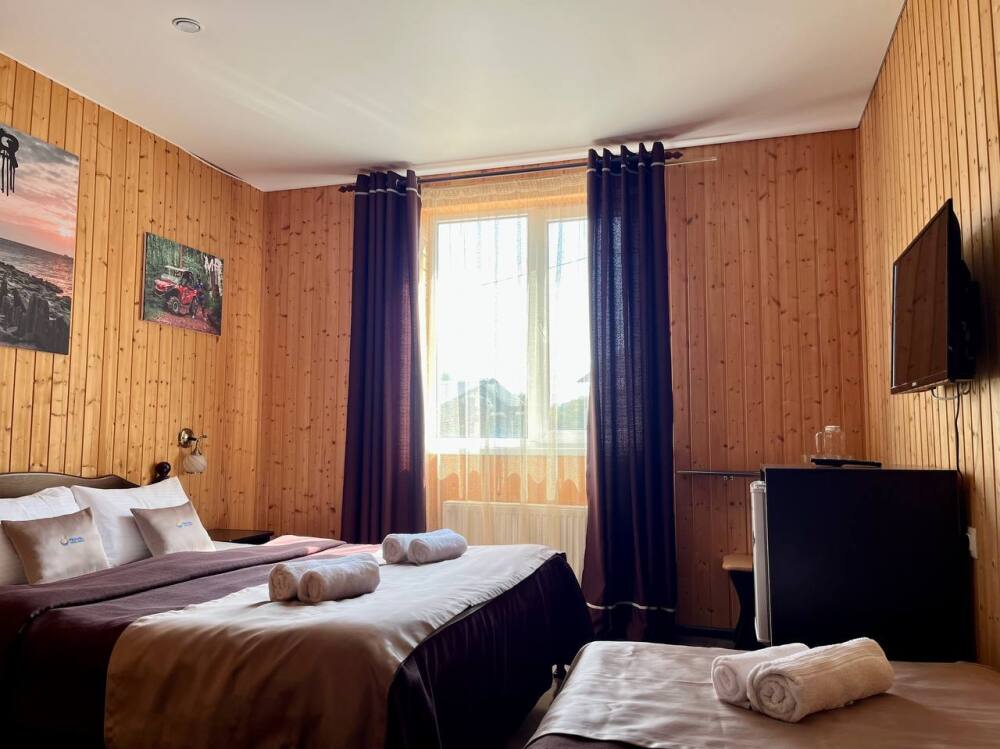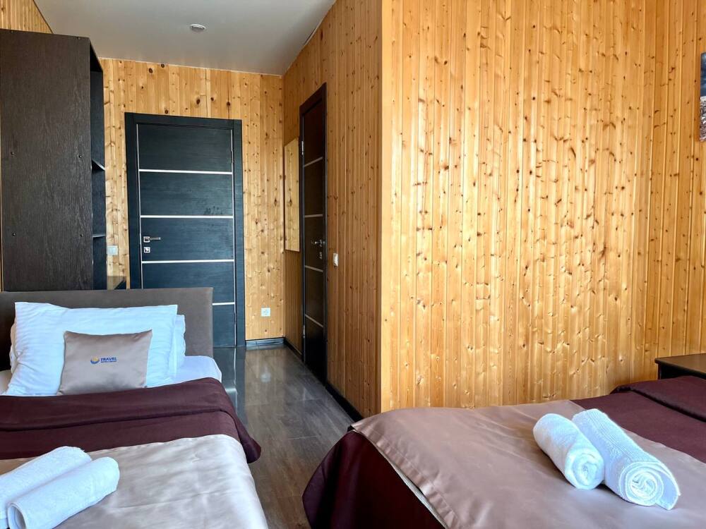 Уютные трёхместные номера оформлены в лёгком эко‑стиле, создающем атмосферу природной гармонии и спокойствия. В номере расположены двуспальная и односпальная кровати с тёплыми одеялами и ортопедическими подушками — каждый гость чувствует себя максимально комфортно.