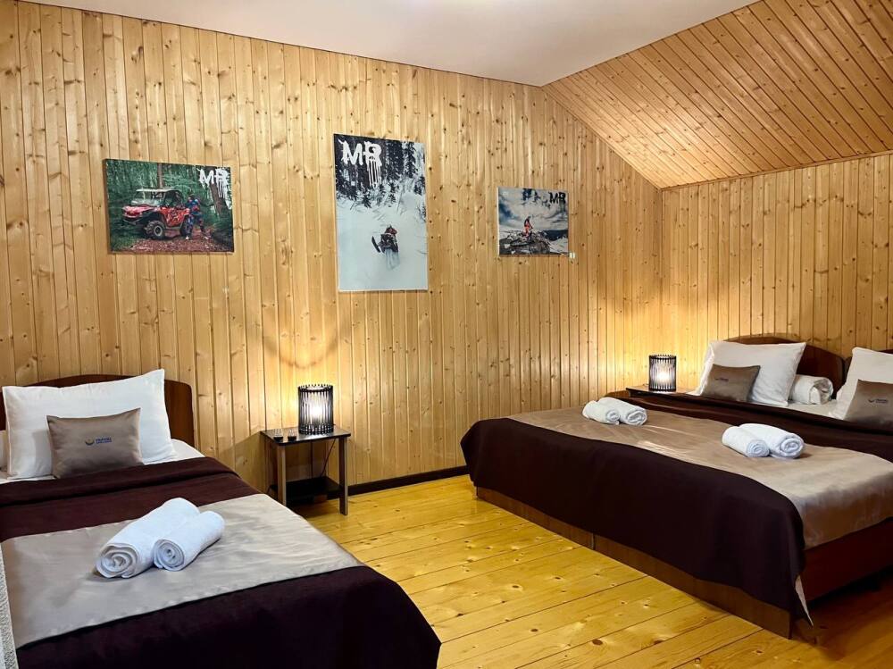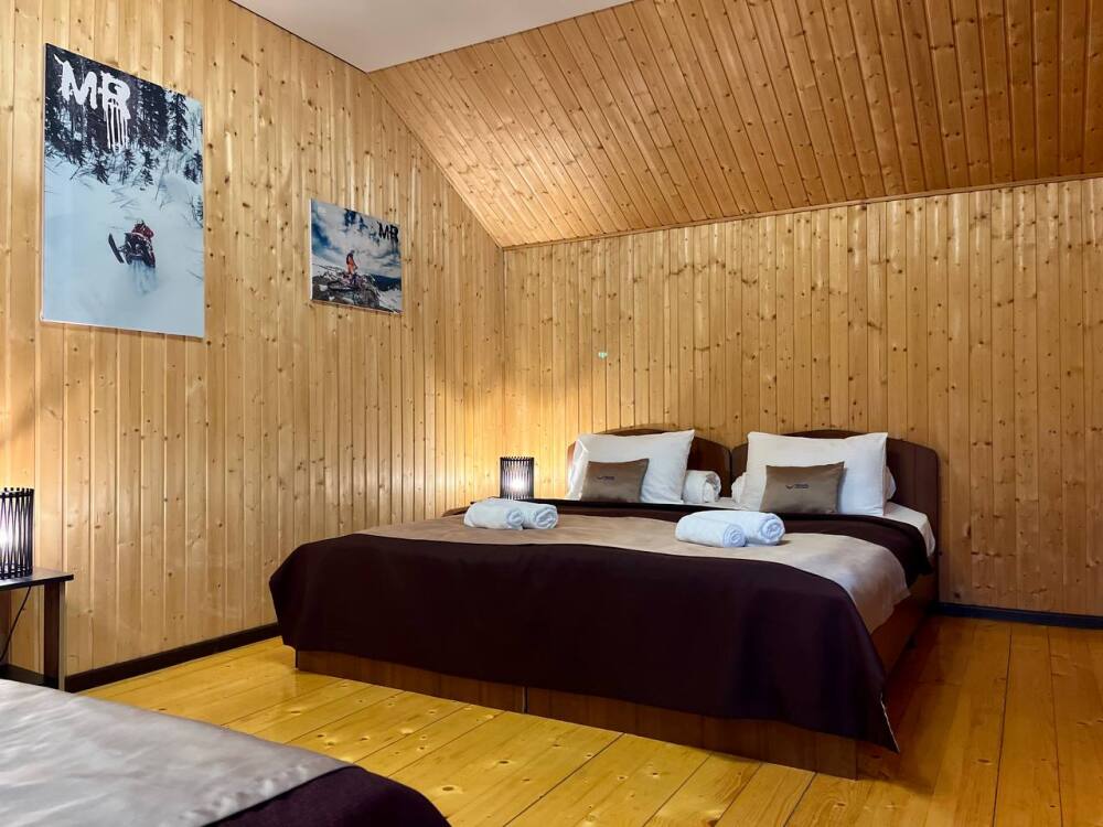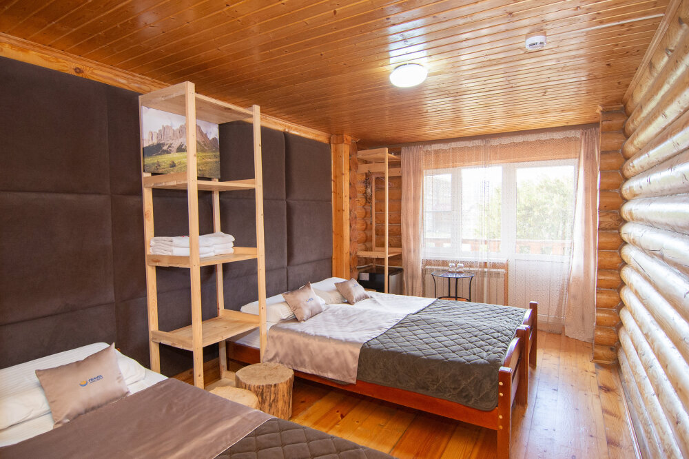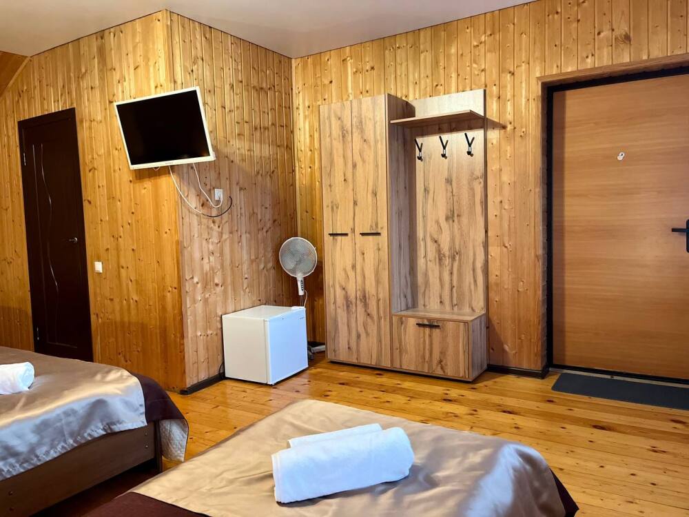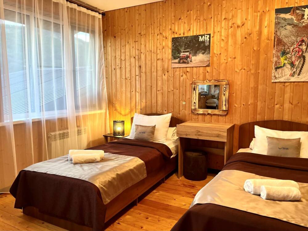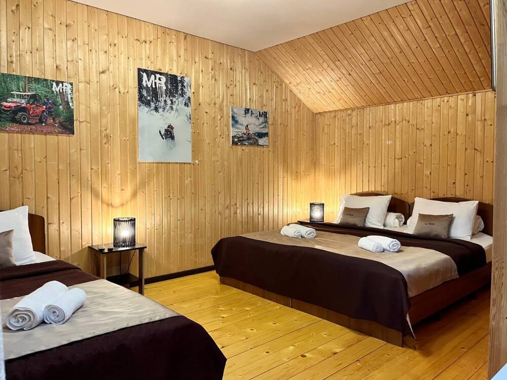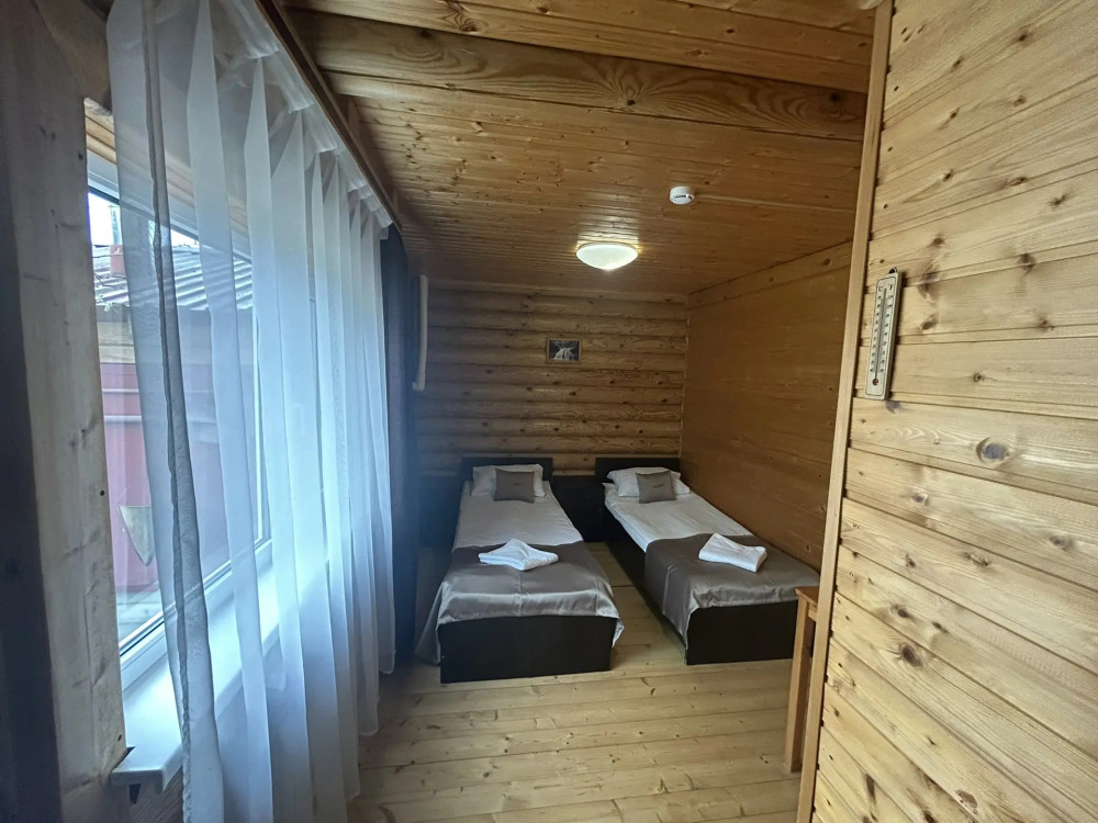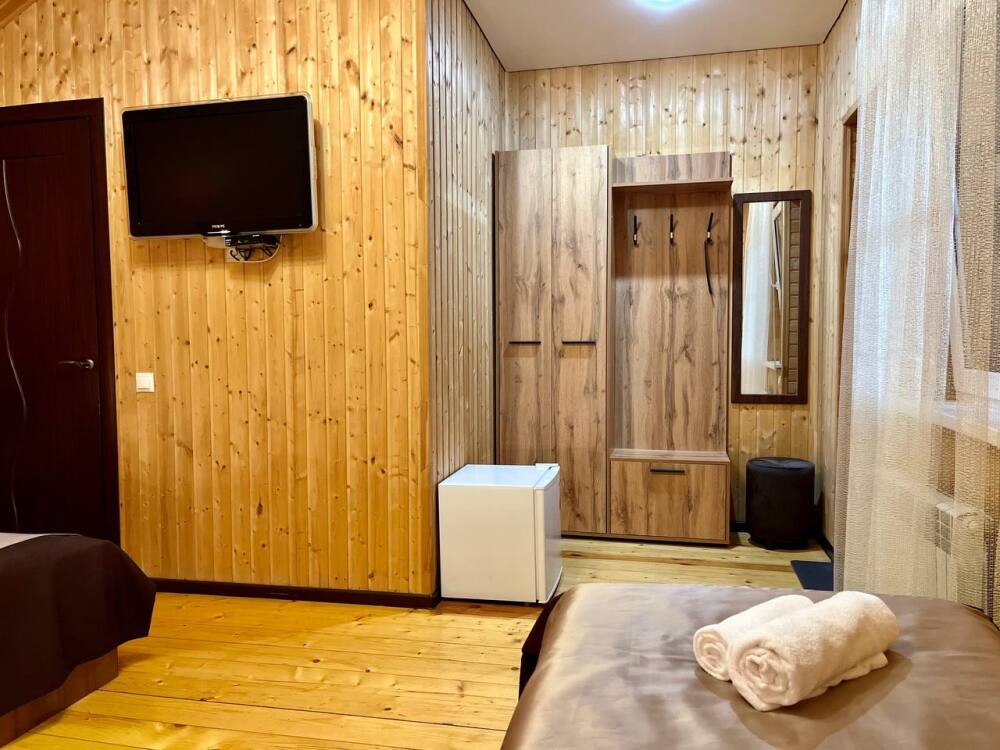 Уютные трёхместные номера оформлены в лёгком эко‑стиле, создающем атмосферу природной гармонии и спокойствия. В номере расположены двуспальная и односпальная кровати с тёплыми одеялами и ортопедическими подушками — каждый гость чувствует себя максимально комфортно.