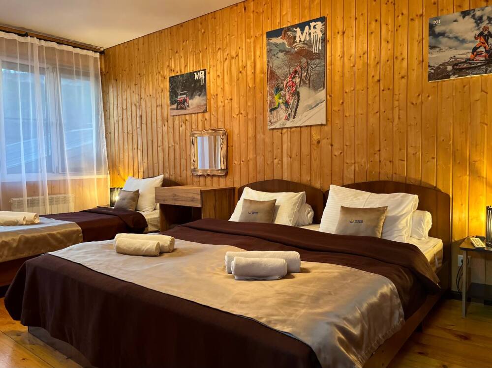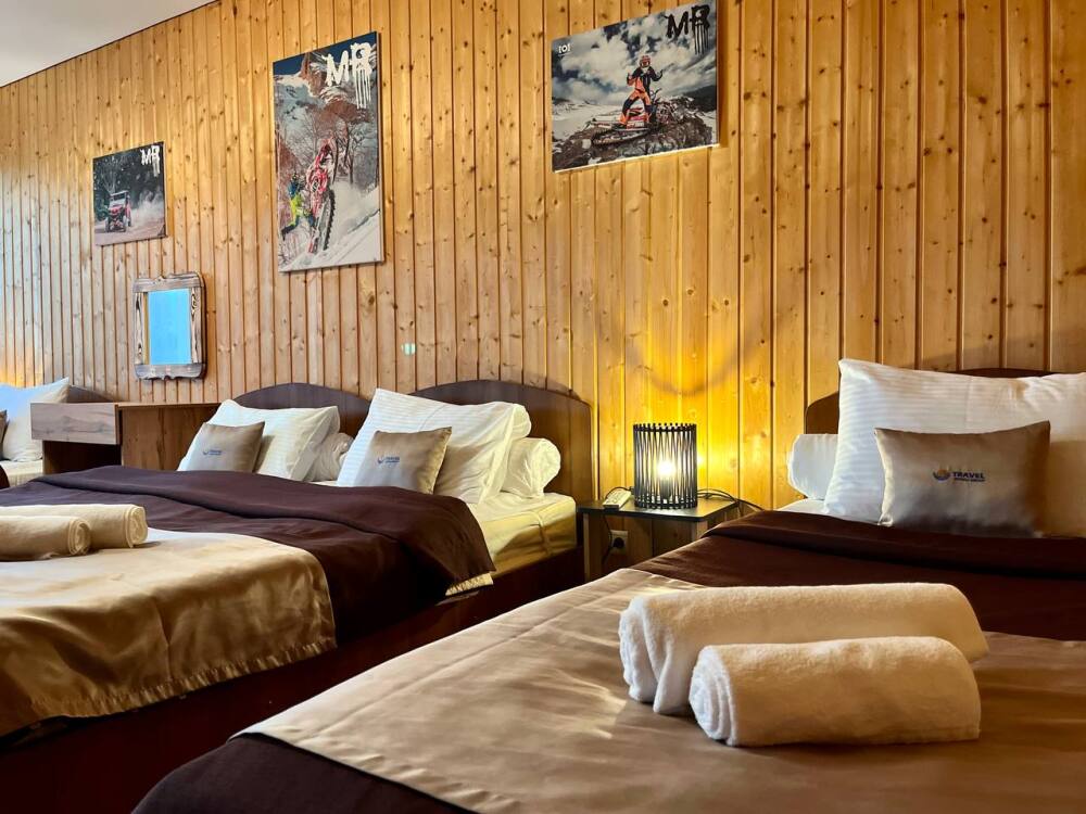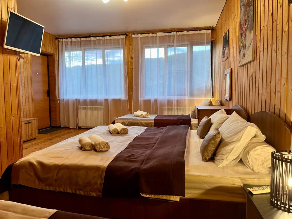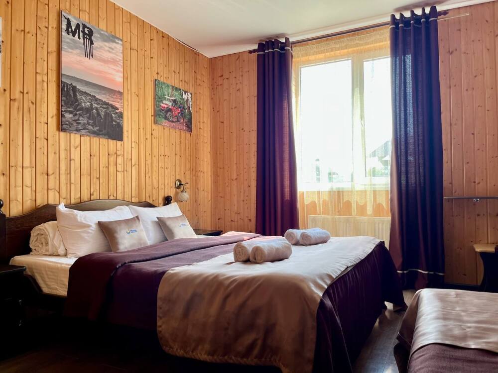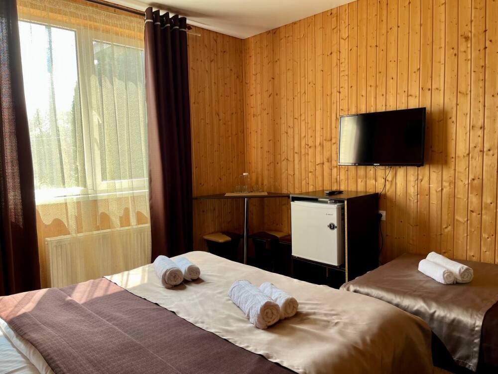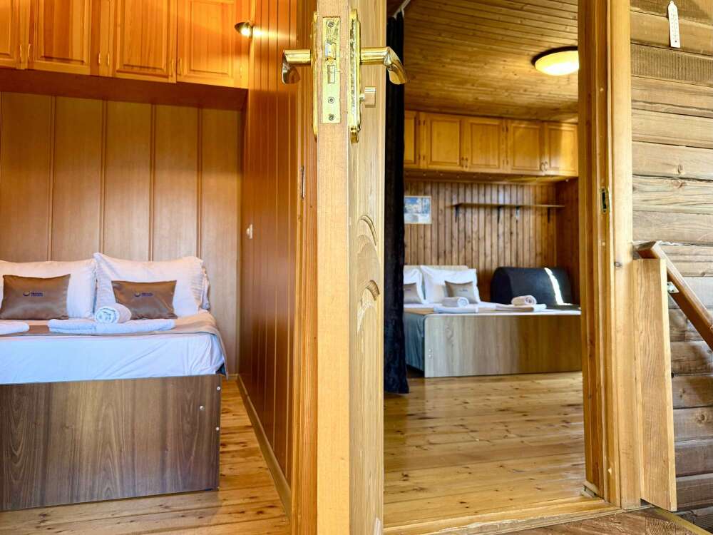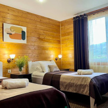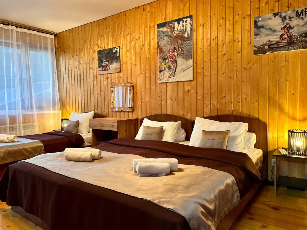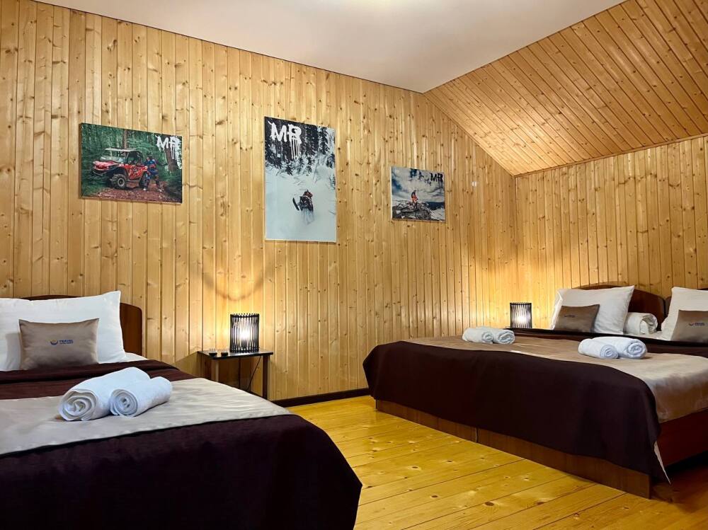 Уютные трёхместные номера оформлены в лёгком эко‑стиле, создающем атмосферу природной гармонии и спокойствия. В номере расположены двуспальная и односпальная кровати с тёплыми одеялами и ортопедическими подушками — каждый гость чувствует себя максимально комфортно.