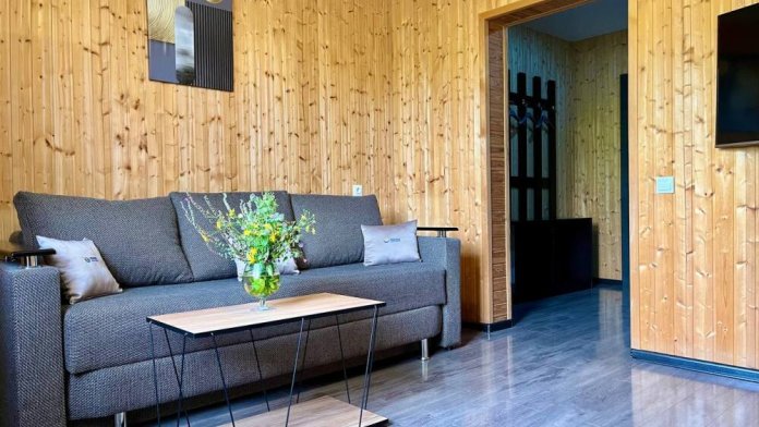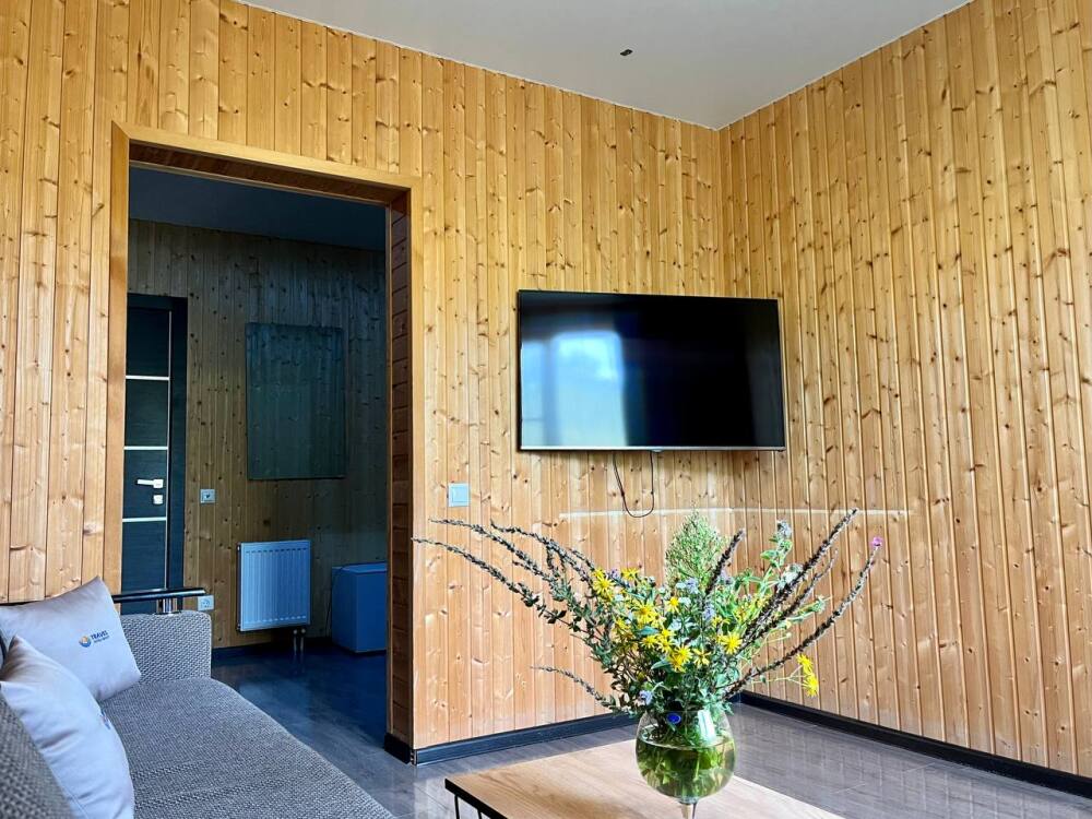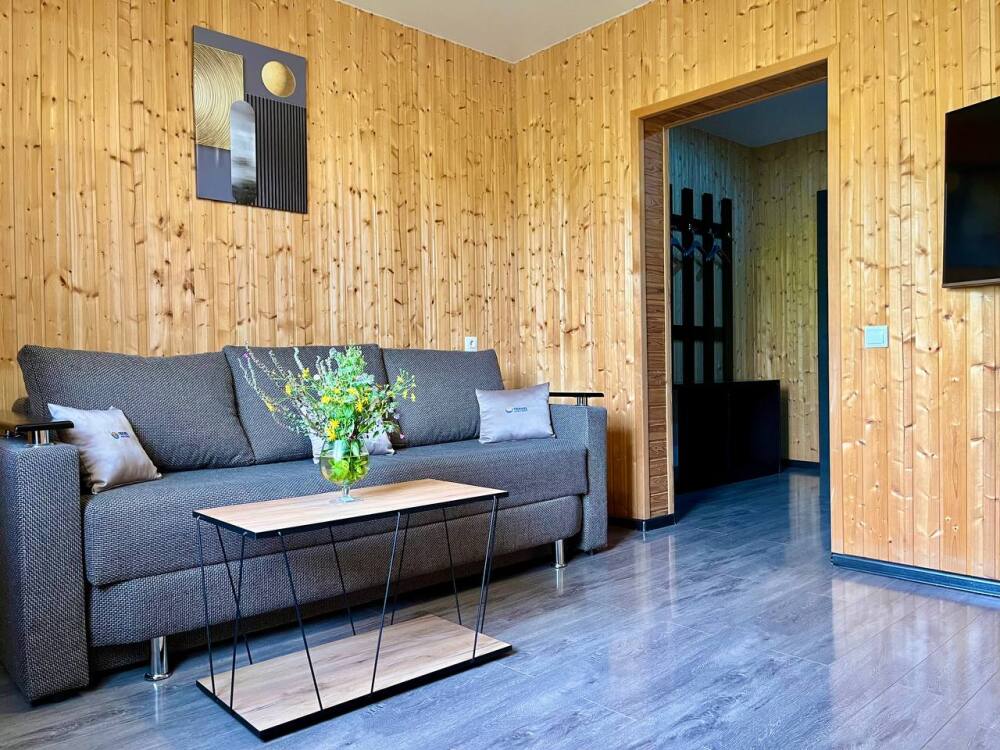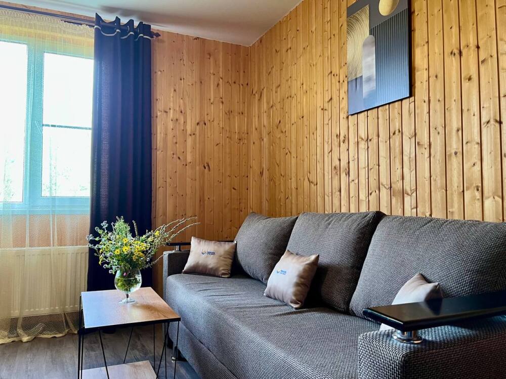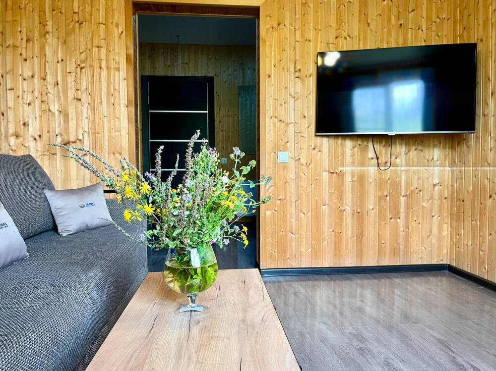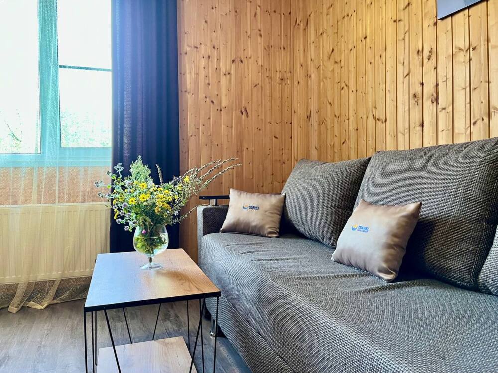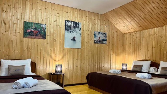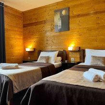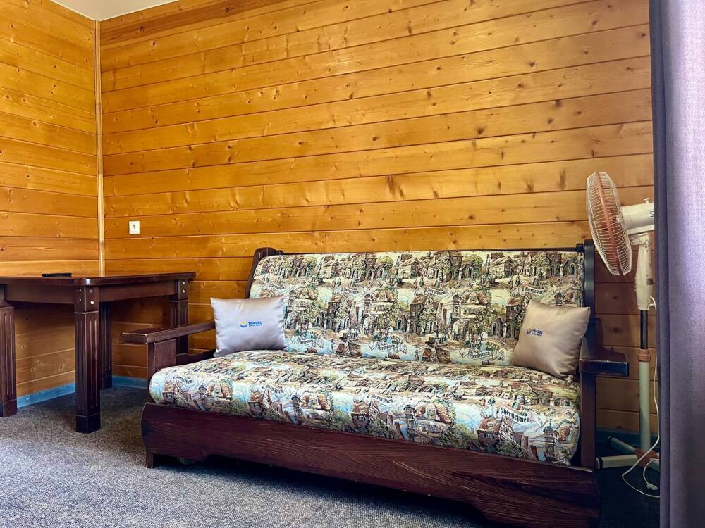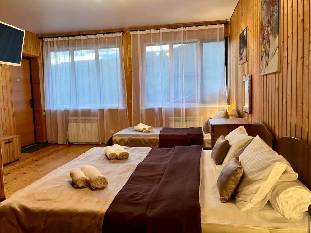 Уютные трёхместные номера оформлены в лёгком эко‑стиле, создающем атмосферу природной гармонии и спокойствия. В номере расположены двуспальная и односпальная кровати с тёплыми одеялами и ортопедическими подушками — каждый гость чувствует себя максимально комфортно.
