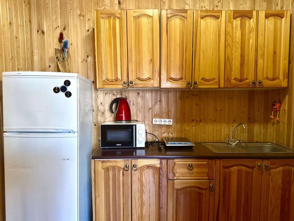 - оборудованная кухонная зона: электрочайник, холодильник, электро плита, посуда и кухонные принадлежности
