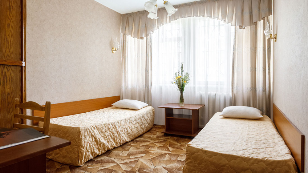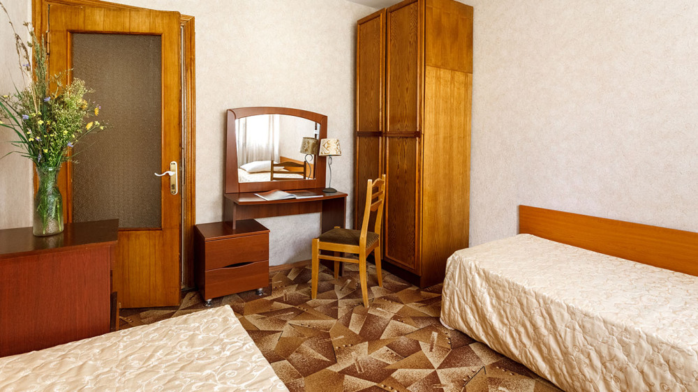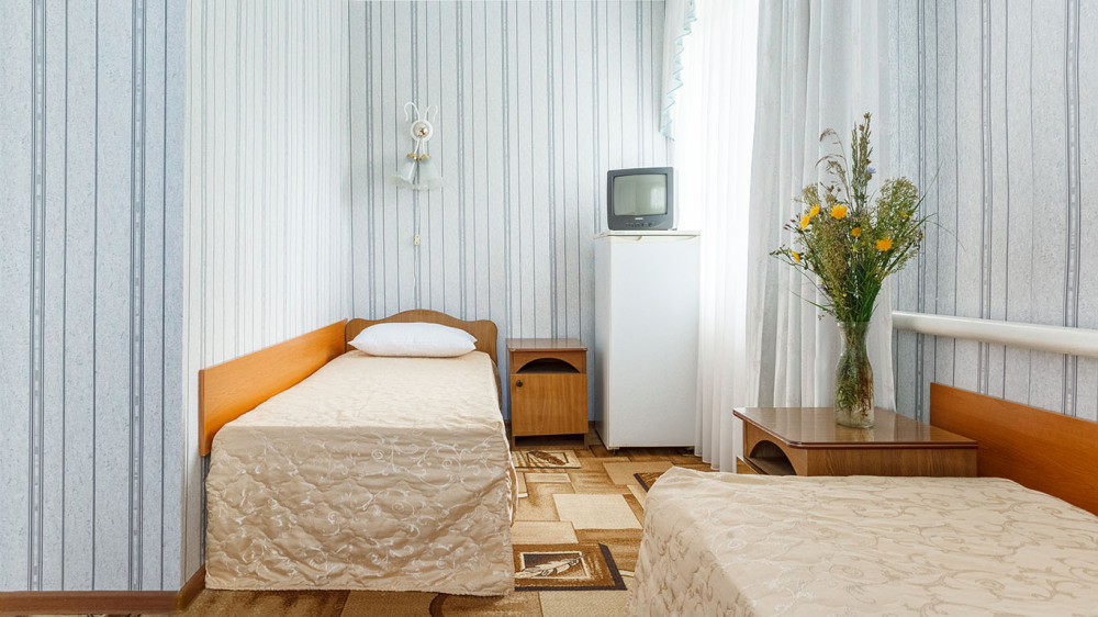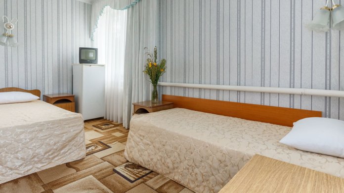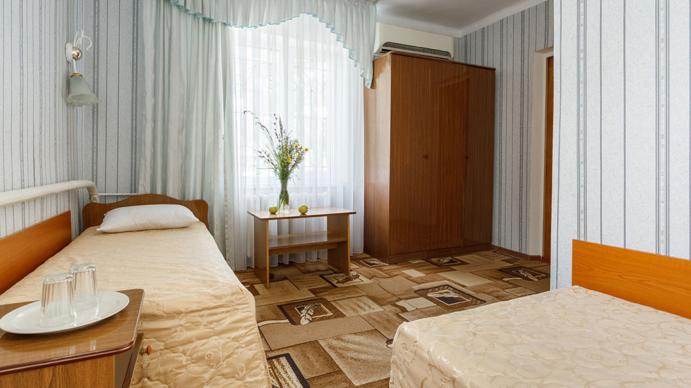 В номере: две односпальные кровати, шкаф, тумбочки, стол, стулья, телевизор, холодильник, сплит-система, постельное белье, полотенца, посуда.