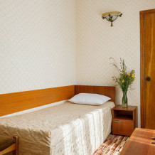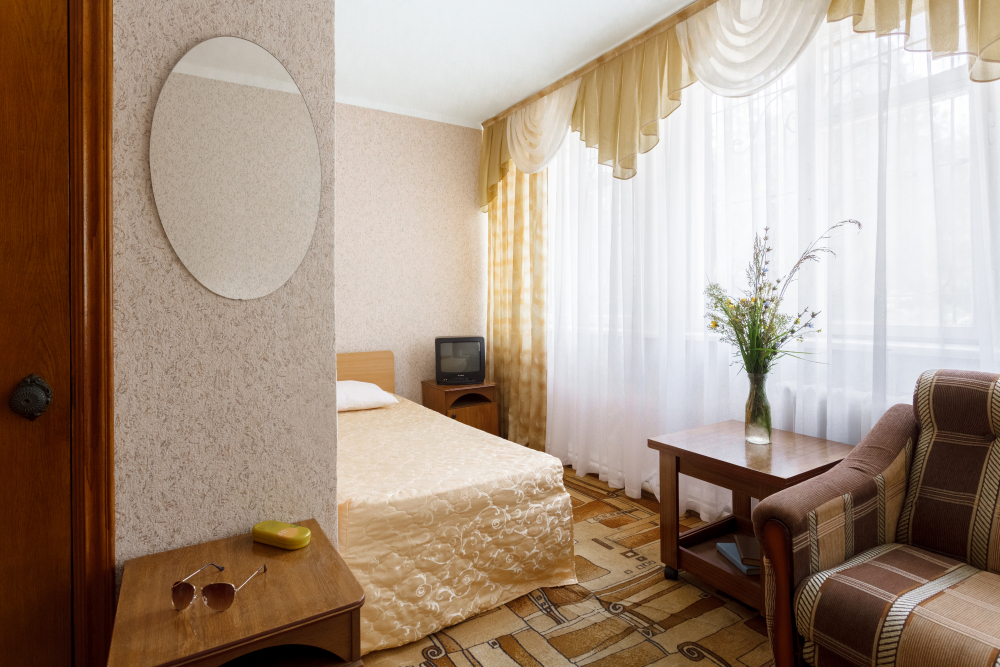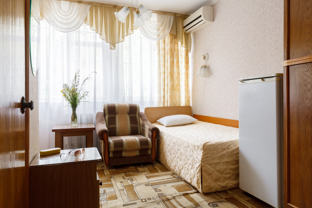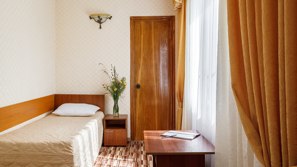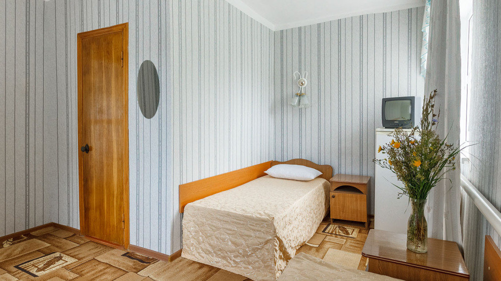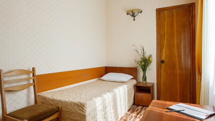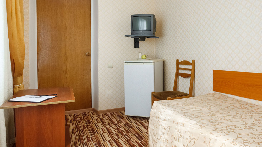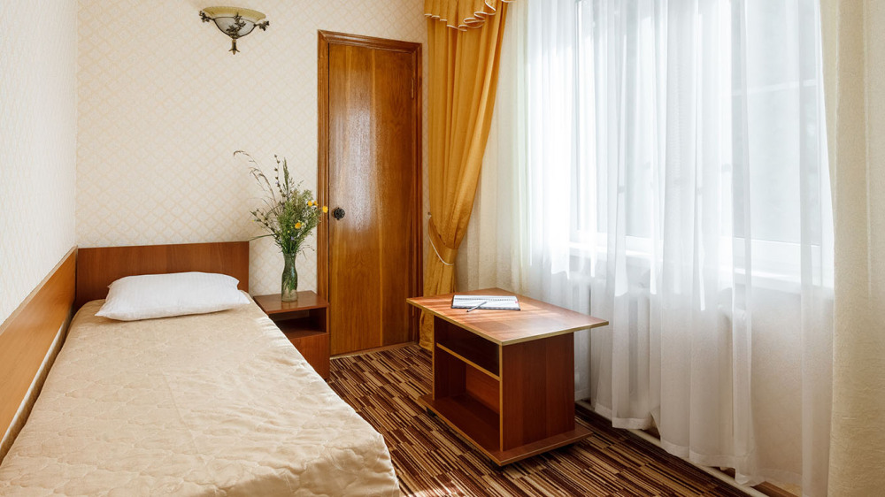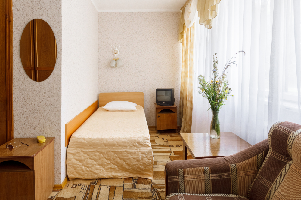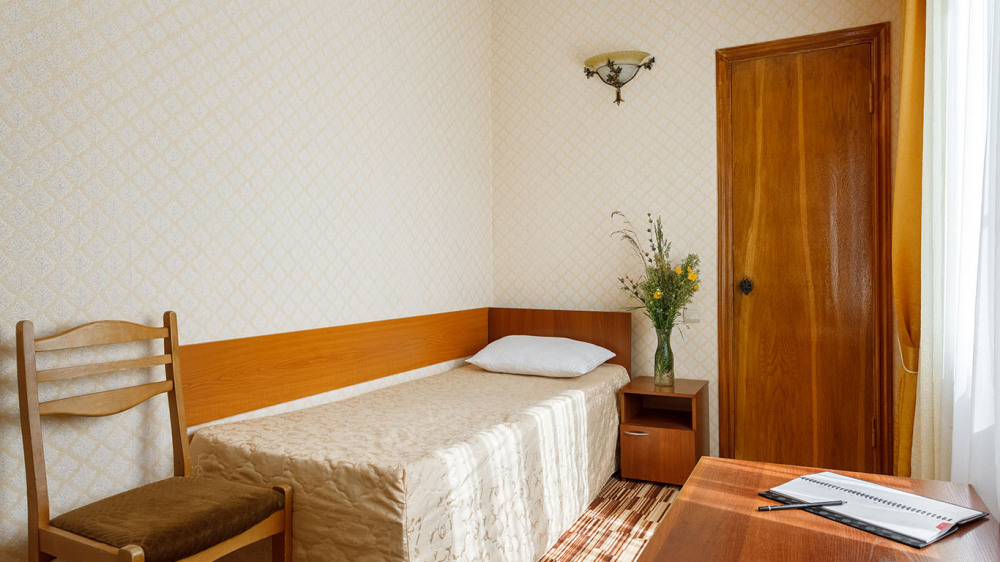 В номере: односпальная кровать, шкаф, тумбочка, стол, стул, телевизор, холодильник, сплит-система, постельное белье, полотенца, посуда, туалет.