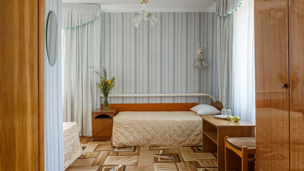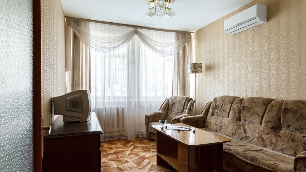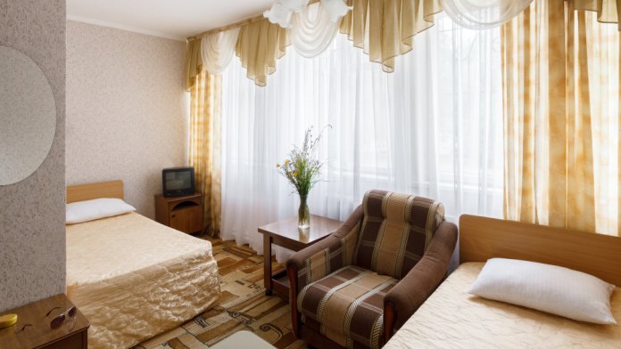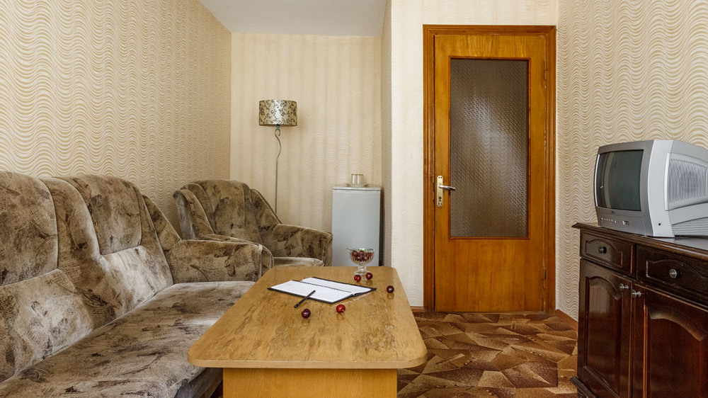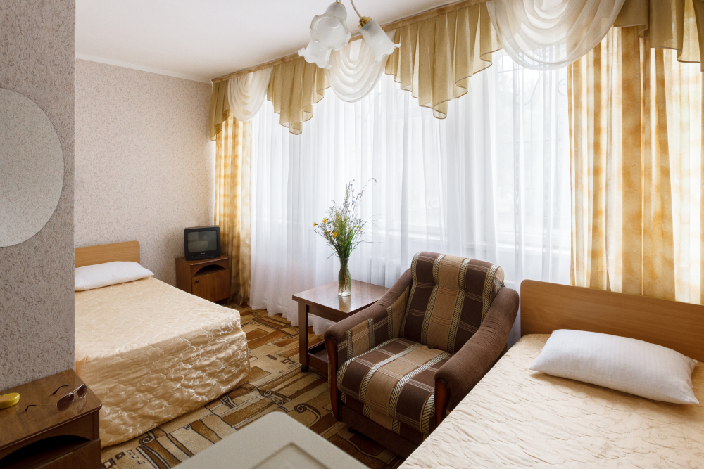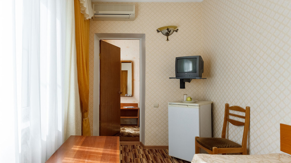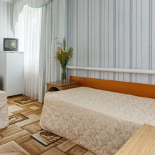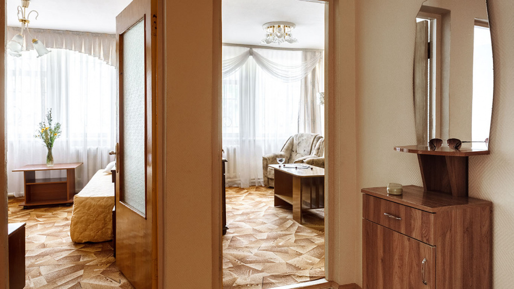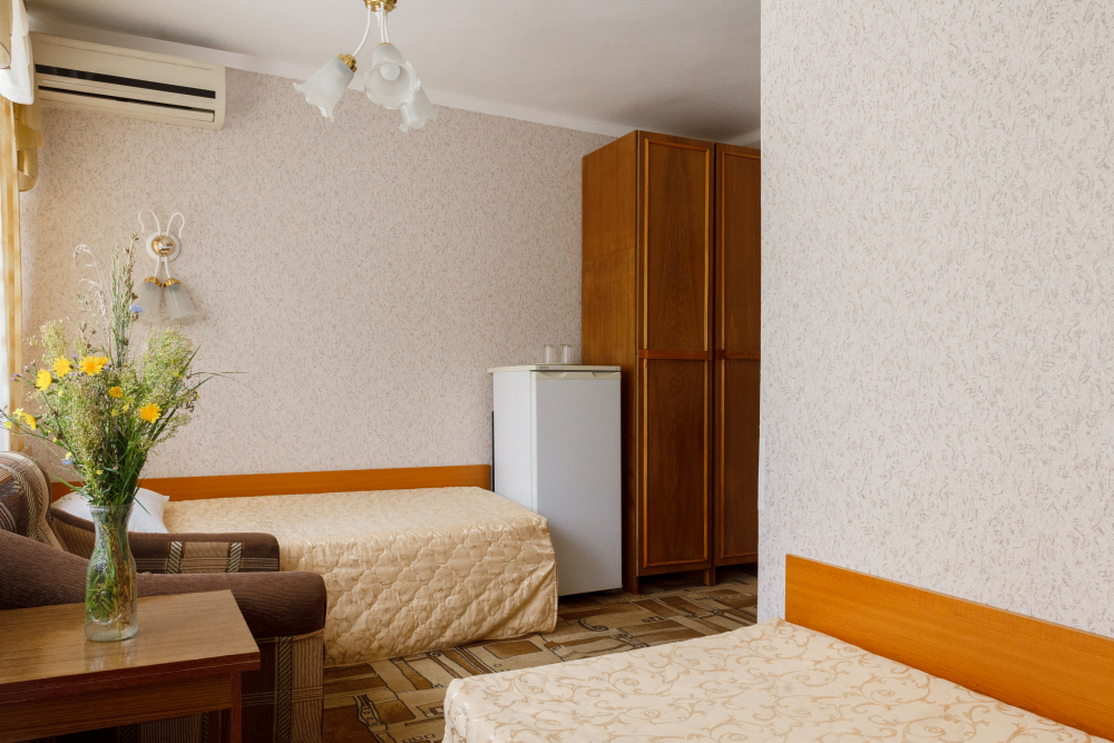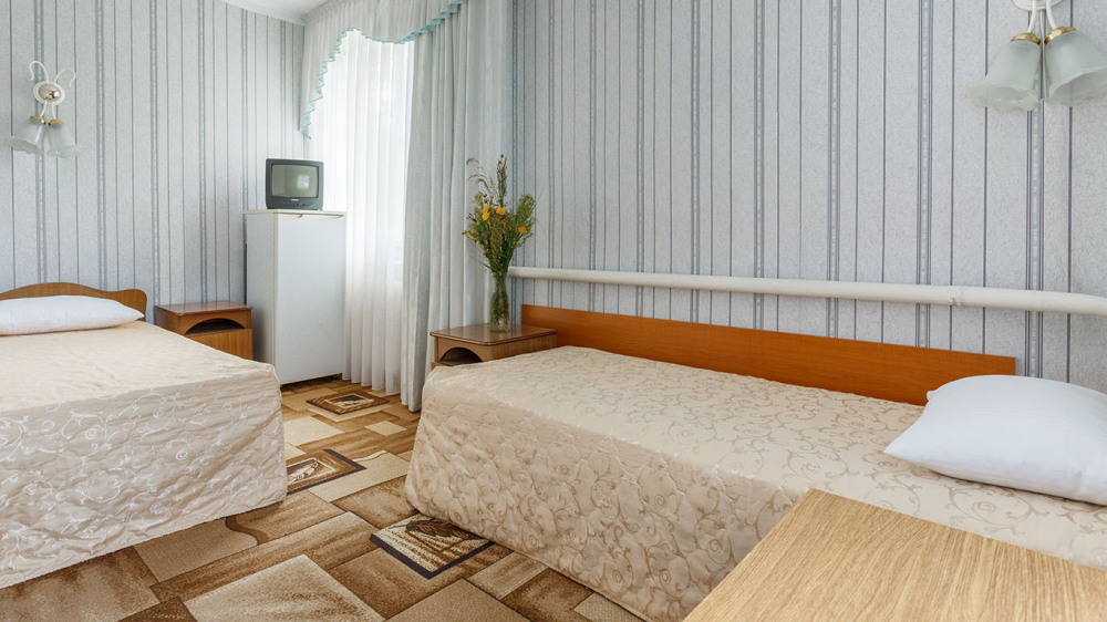 Просторные 2-комнатные номера с удобствами. В спальне две раздельные односпальные кровати, в гостиной диван и кресло, шкаф, тумбочки, стол, стулья, телевизор, холодильник, сплит-система, постельное белье, полотенца, посуда, туалет, душ/ванна.