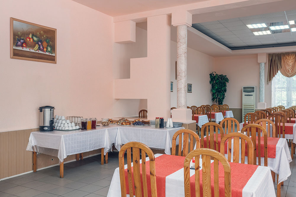 На территории оздоровительного комплекса организовано 3-х разовое питание по системе «шведский стол». В меню выбор мясных и рыбных блюд, первых блюд и бульонов, гарниров и салатов. Всегда свежие овощи, фрукты, зелень. Безалкогольные напитки в ассортименте - компот из свежей и сухофрукты, прохладительные чаи. Выпечка собственного производства. Во время рациона обеда и ужина предлагается столовое вино двух видов.