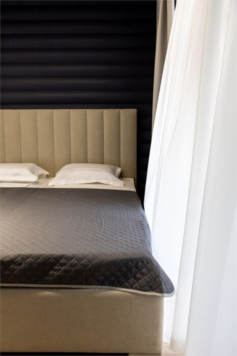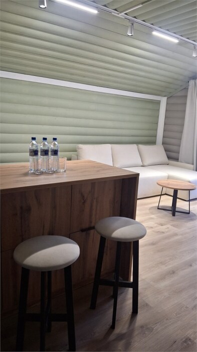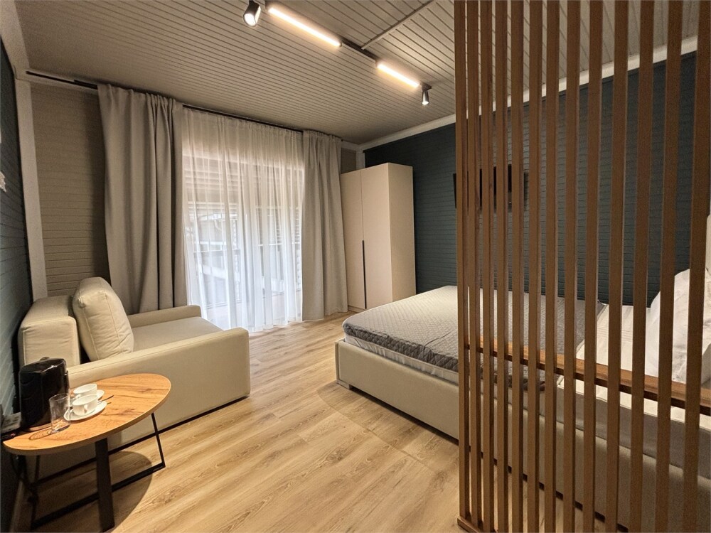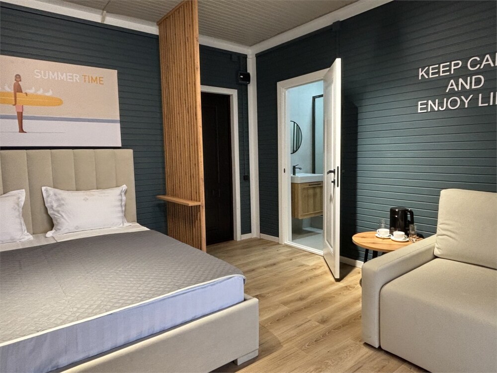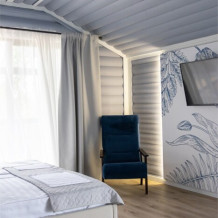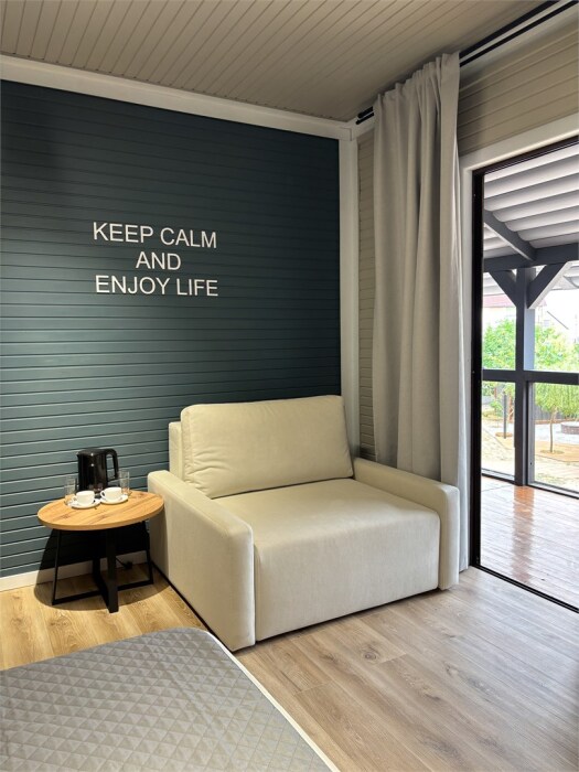 Просторный номер с двуспальной кроватью, раскладным диваном и собственным барным островом. Балкон отрывает вид на море и зеленый двор. Номер располагается на втором этаже.