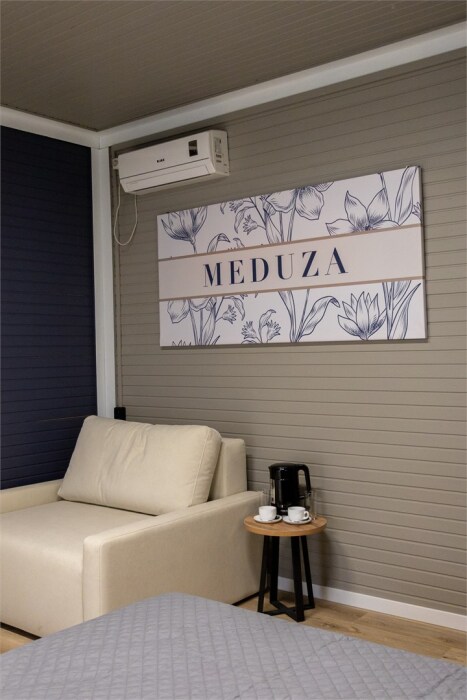 В отеле располагается территория вкуса «MEDUZA bar&cafe»: вкусные завтраки и самые популярные блюда, кавказская кухня и авторские лимонады. Две мангальных зоны, лаунж-зона с кальяном и костровой площадкой.