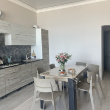 Уютная квартира с видом на море. На втором этаже большая терраса с шикарным видом на море и летней мебелью для отдыха. Кухня оборудована всем необходимым для приготовления пищи.