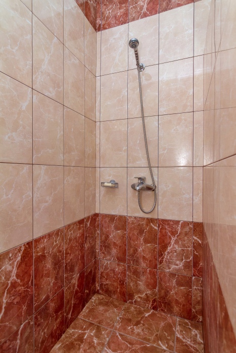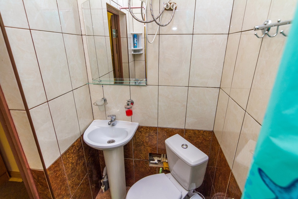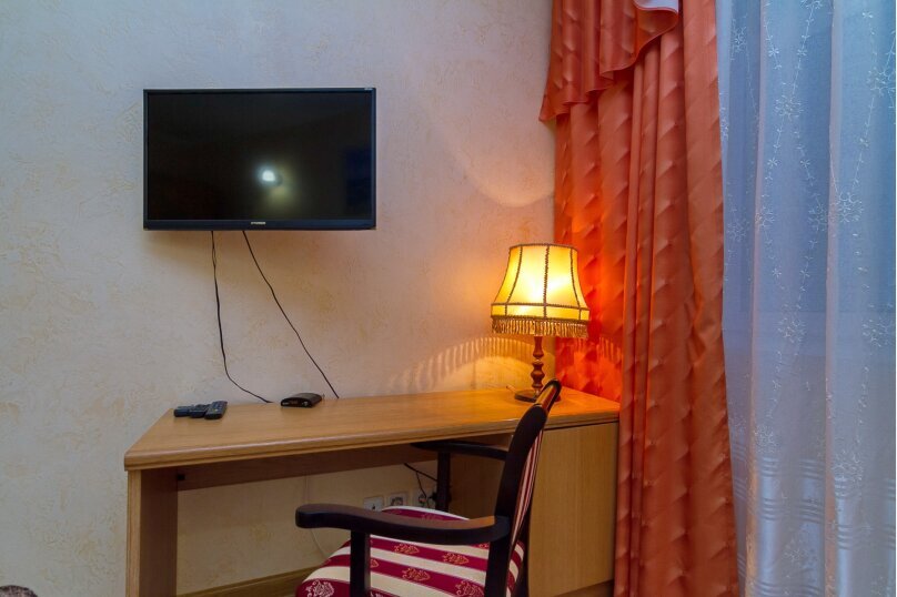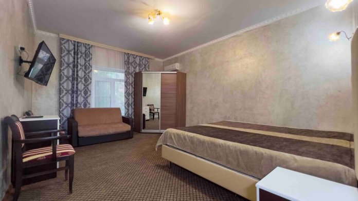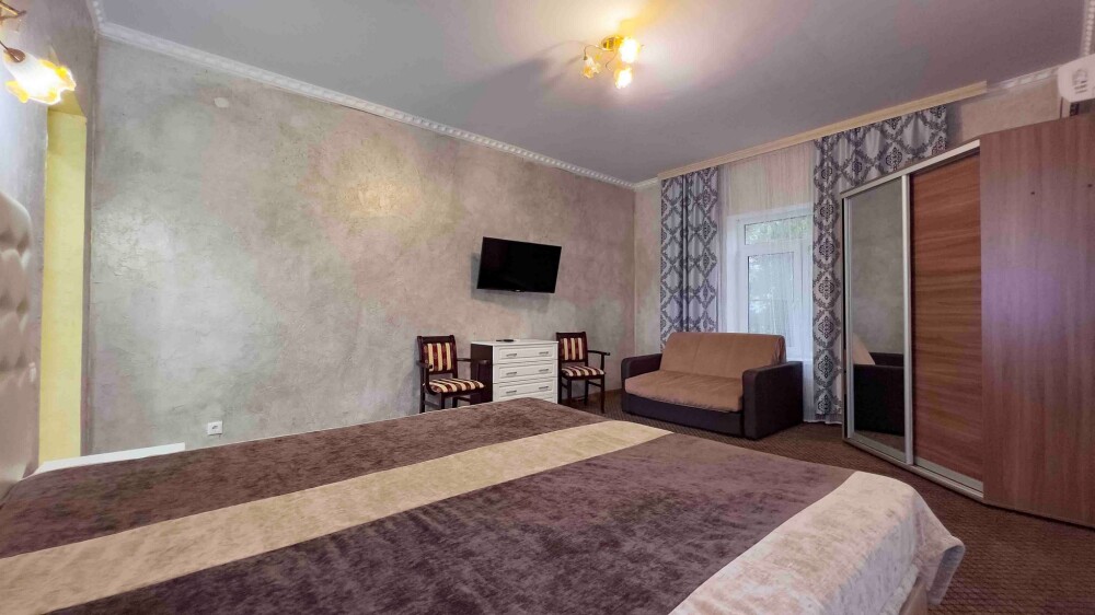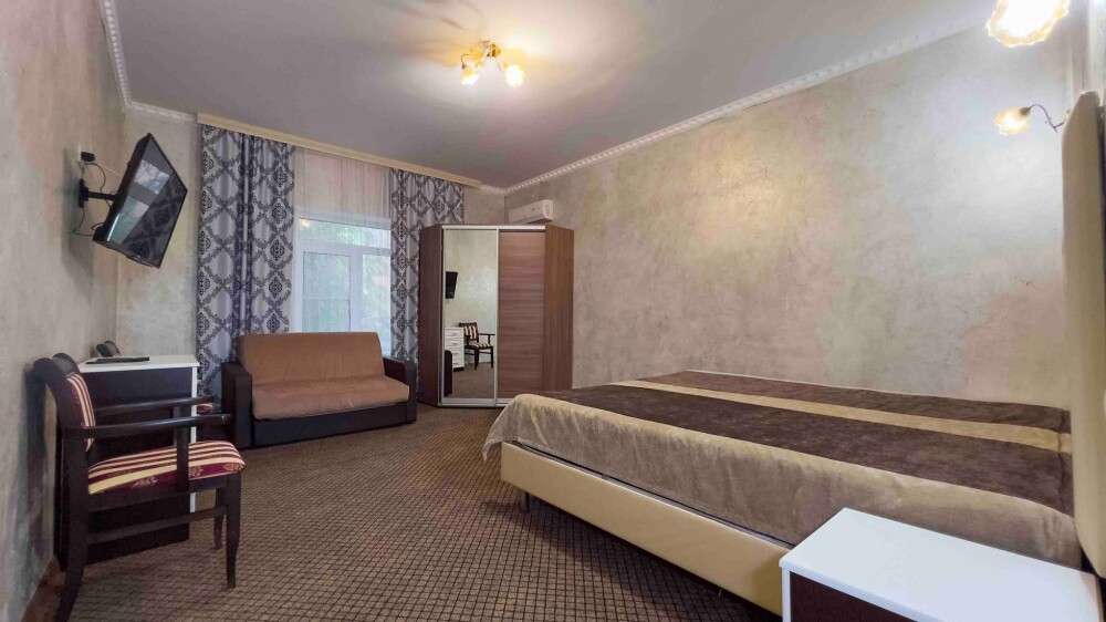 В номере новая мебель: двухспальная кровать (2 х односпальные кровати), диван-кровать, туалетный столик, кондиционер, телевизор, прикроватные тумбы, холодильник, душевая кабина, туалет.
