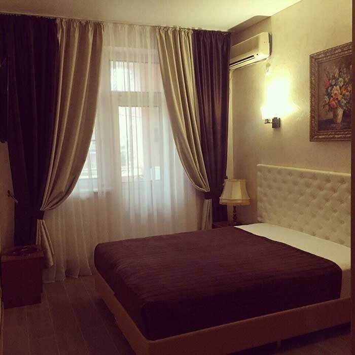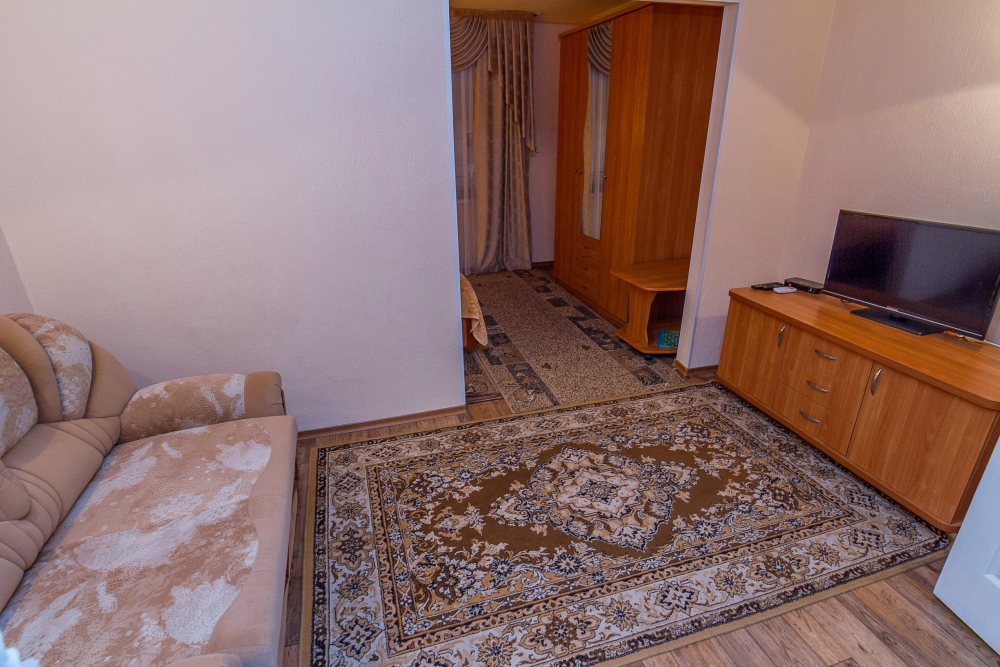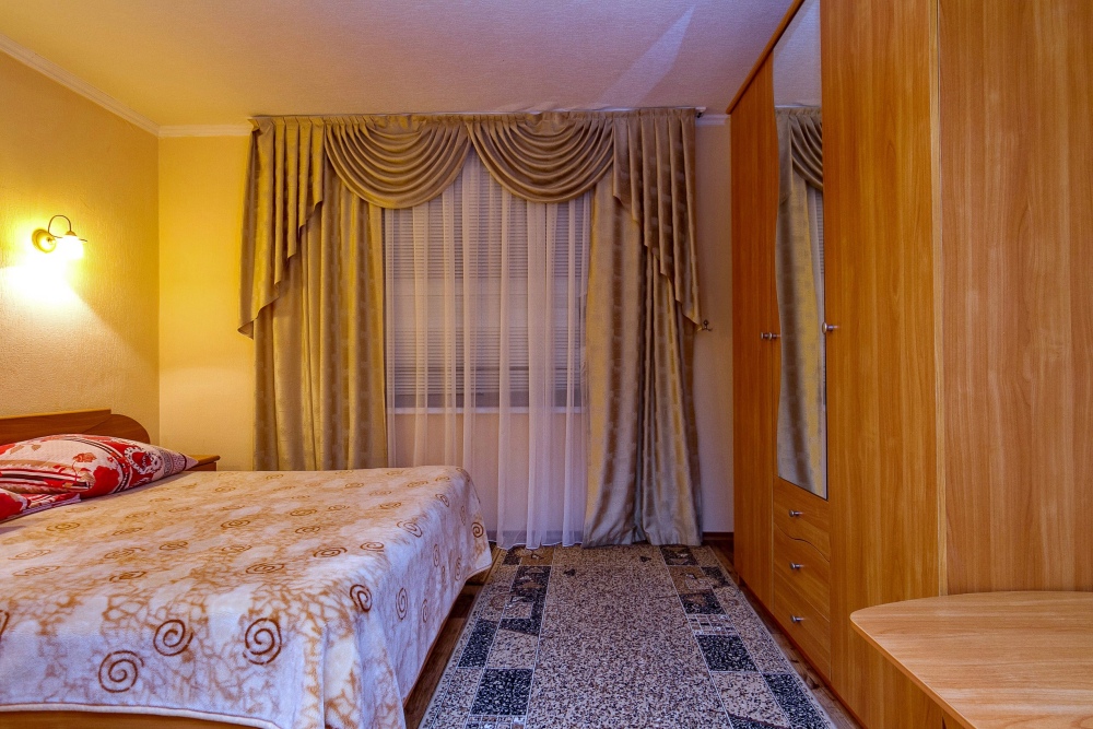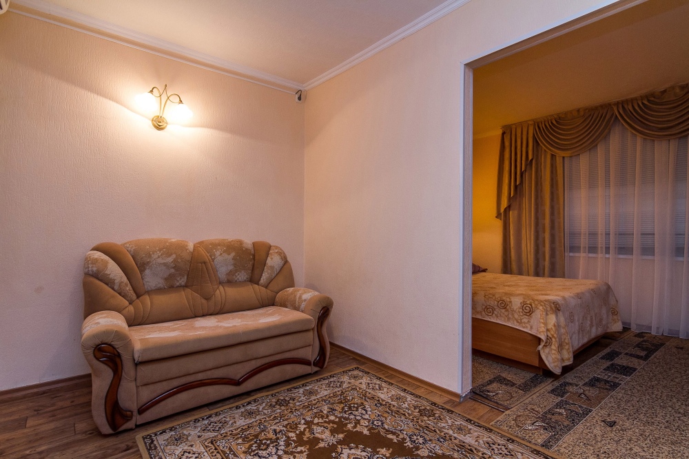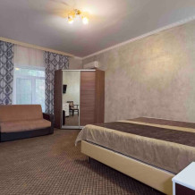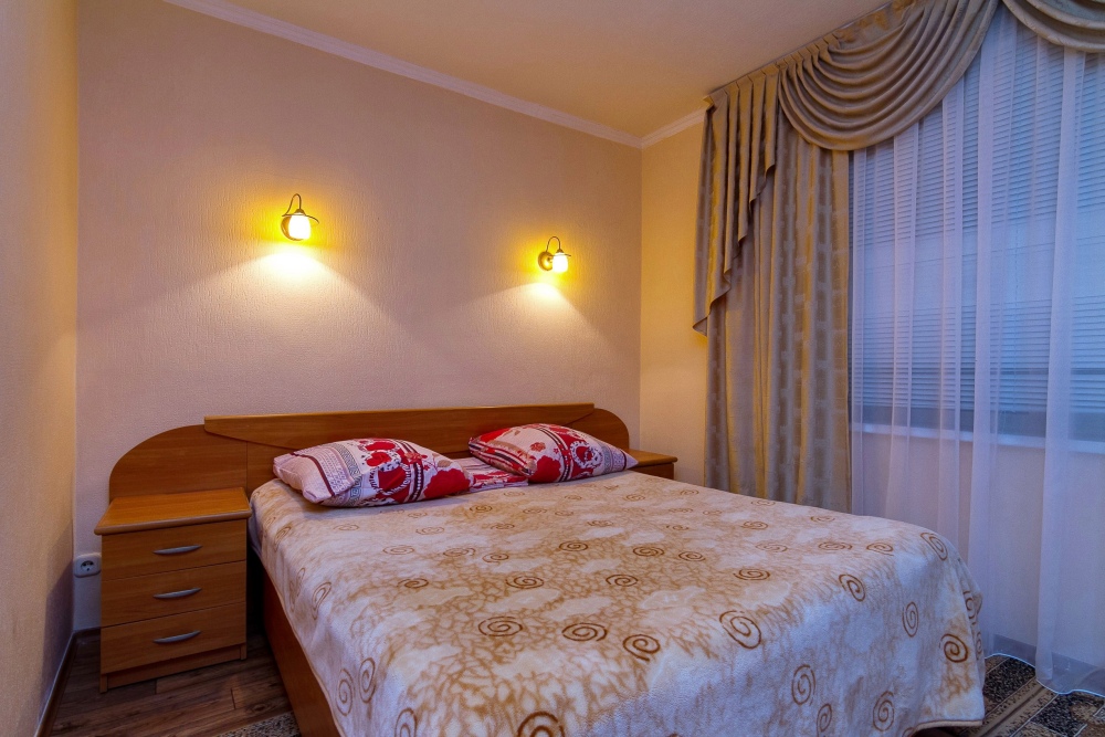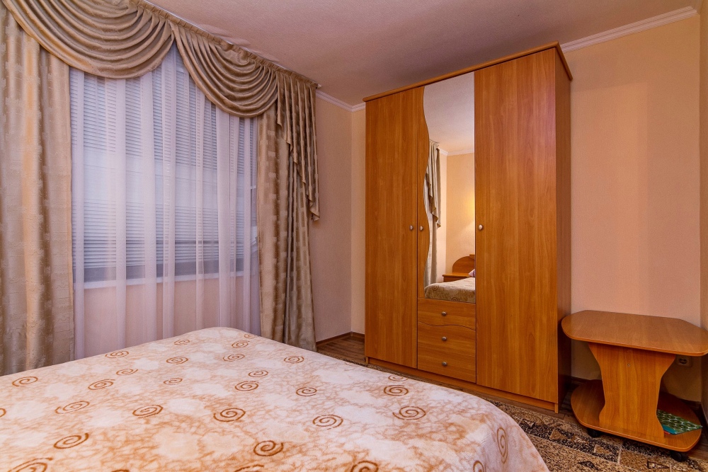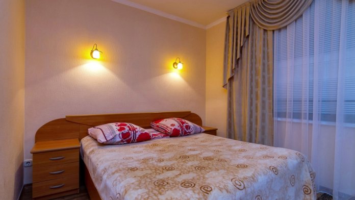 В комнатах апартаментов есть все для комфортного отдыха на азовском море: двухспальная кровать в каждой комнате, диван, туалетный столик, кондиционер, ТВ, прикроватные тумбы.