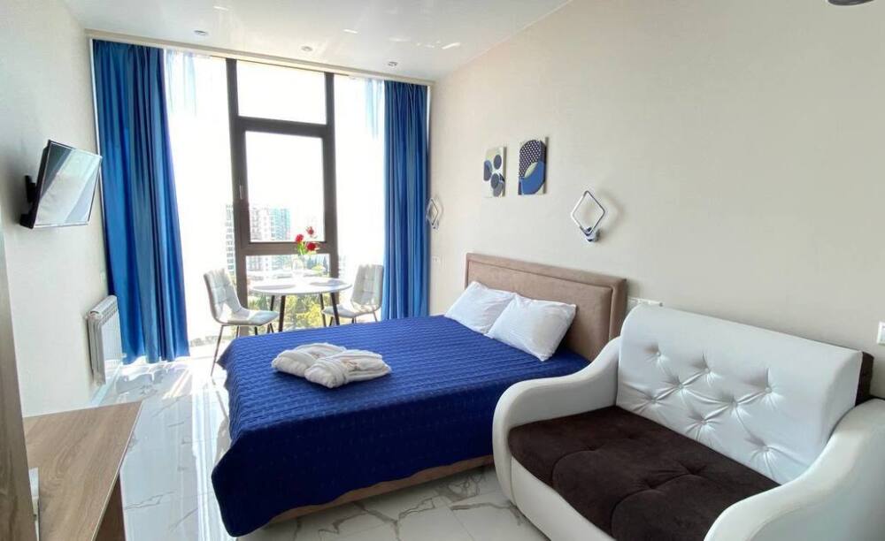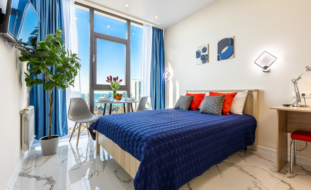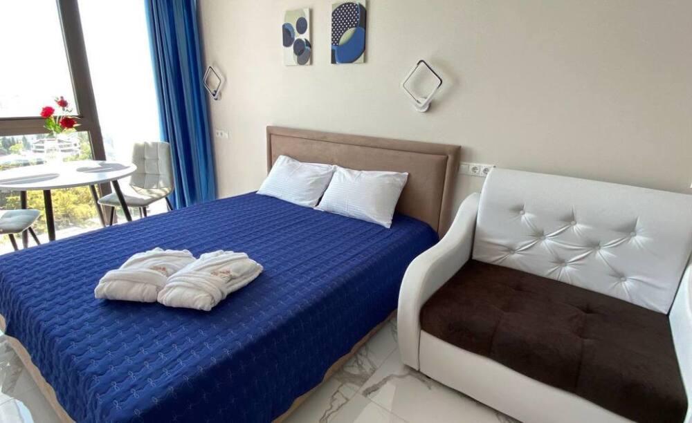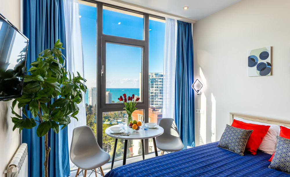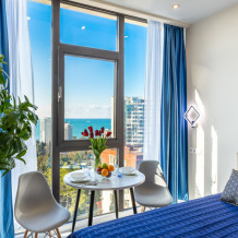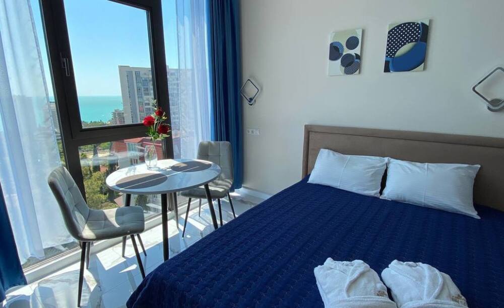 ОПИСАНИЕ: Новая стильная студия с повышенным уровнем сервиса в центре Сочи. Вас ждет панорамное остекление с видом на море. Двуспальная кровать («King Size», матрас Аскона), белоснежное постельное белье как в дорогом отеле, гостевые наборы (халаты, тапочки, шампунь, гель /душа, полотенца для душа и бассейна и др.), новая техника, оснащенная кухня, идеальная чистота и супер-комфорт.