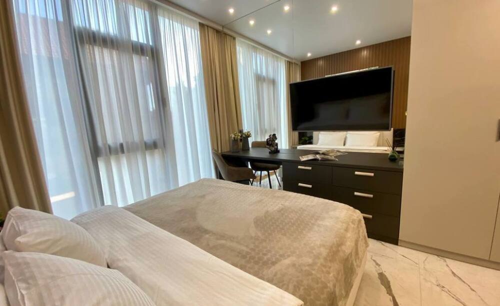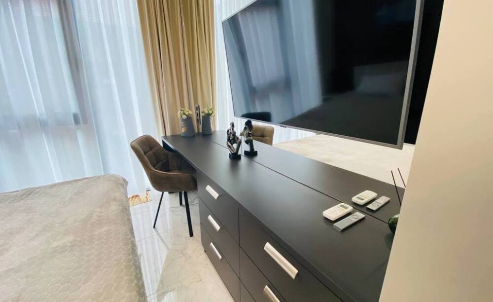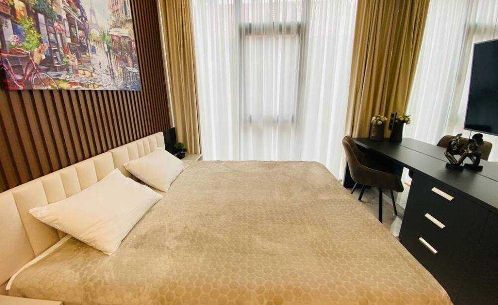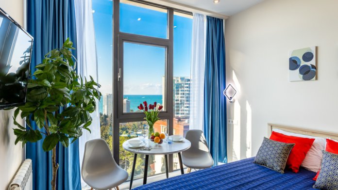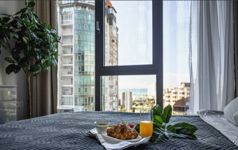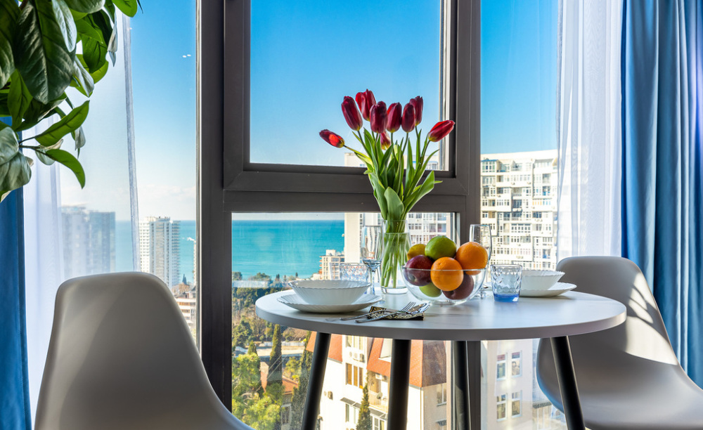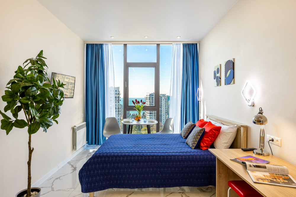 ОПИСАНИЕ: Новая стильная студия с повышенным уровнем сервиса в центре Сочи. Вас ждет панорамное остекление с видом на море. Двуспальная кровать («King Size», матрас Аскона), белоснежное постельное белье как в дорогом отеле, гостевые наборы (халаты, тапочки, шампунь, гель /душа, полотенца для душа и бассейна и др.), новая техника, оснащенная кухня, идеальная чистота и супер-комфорт.