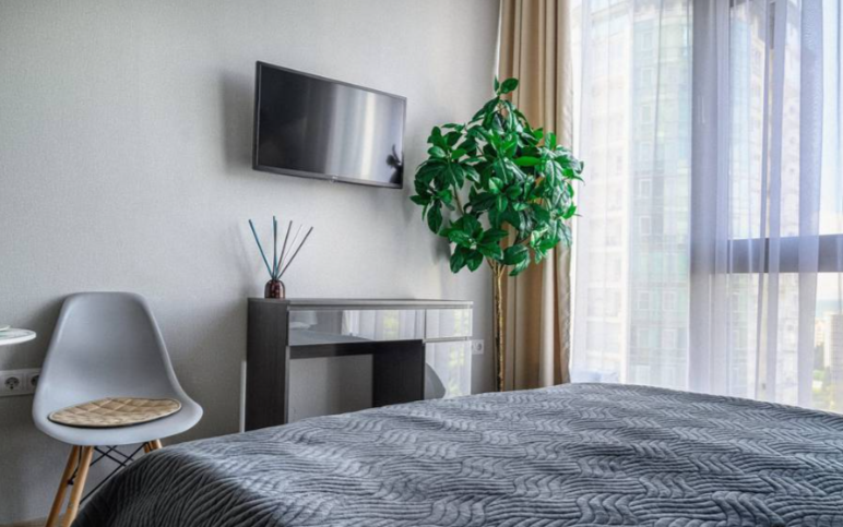 СТИЛЬНАЯ студия с новым дизайнерским ремонтом в ЖК Метрополь. Вид из окна на пышную зелень парка Дендрарий. Открыв окно, Вы можете наслаждаться благоухающим свежим воздухом и пением птиц. Большая и удобная двуспальная кровать, оснащенная кухня, холодильник, TV, Wi-Fi, фен, утюг, стирал. машина, кондиционер, мягкие белоснежные полотенца и постельное белье, средства для душа.