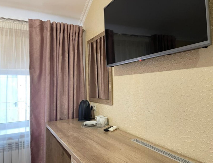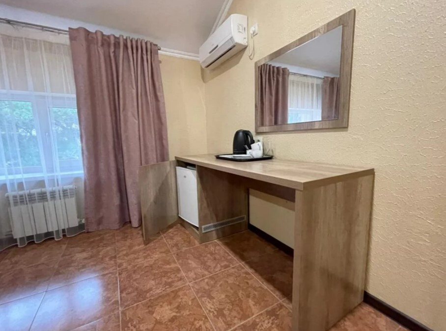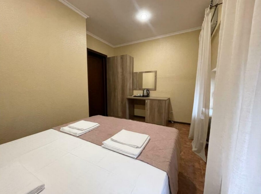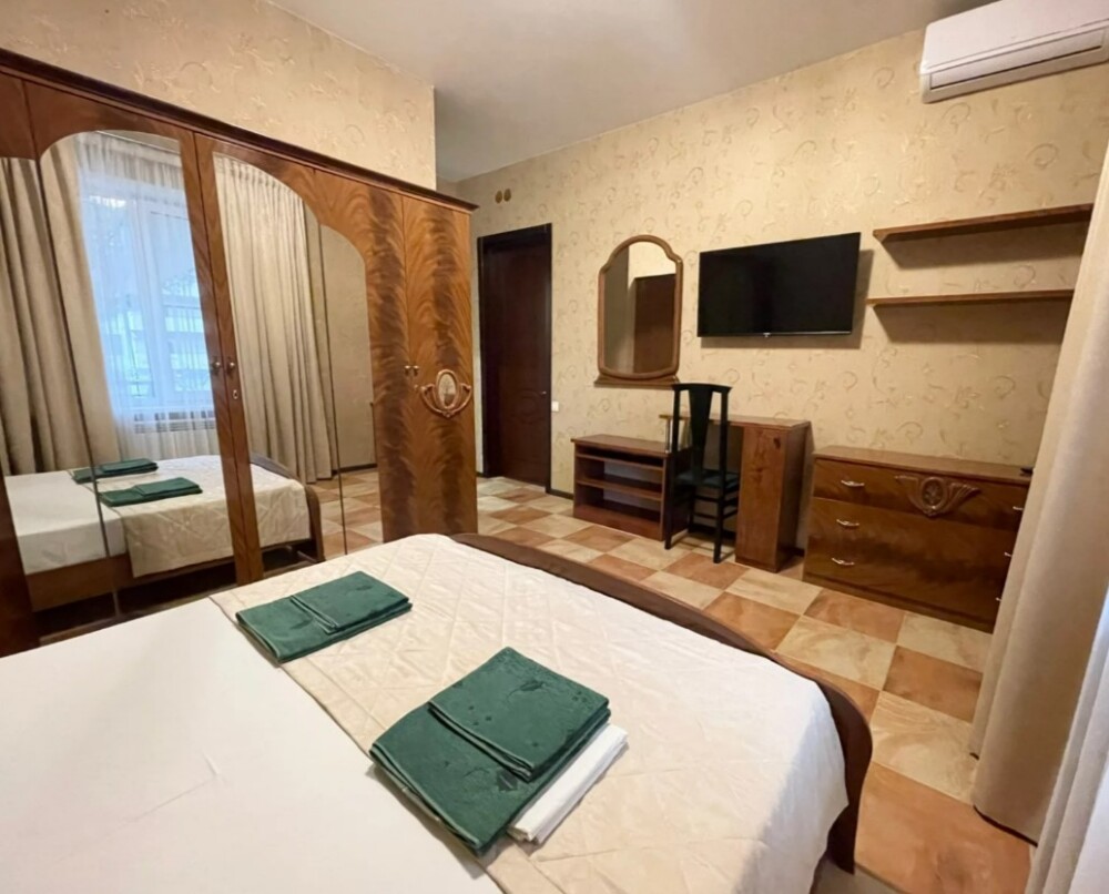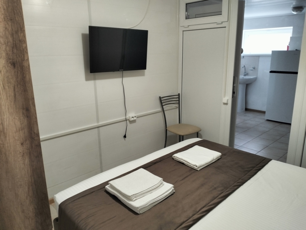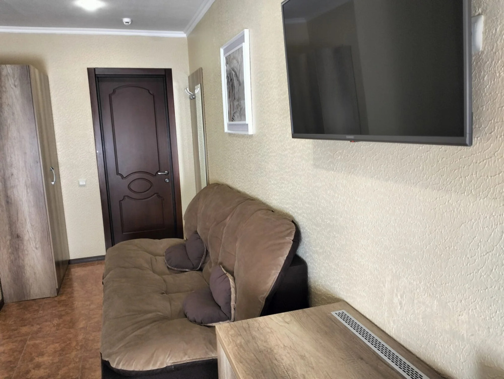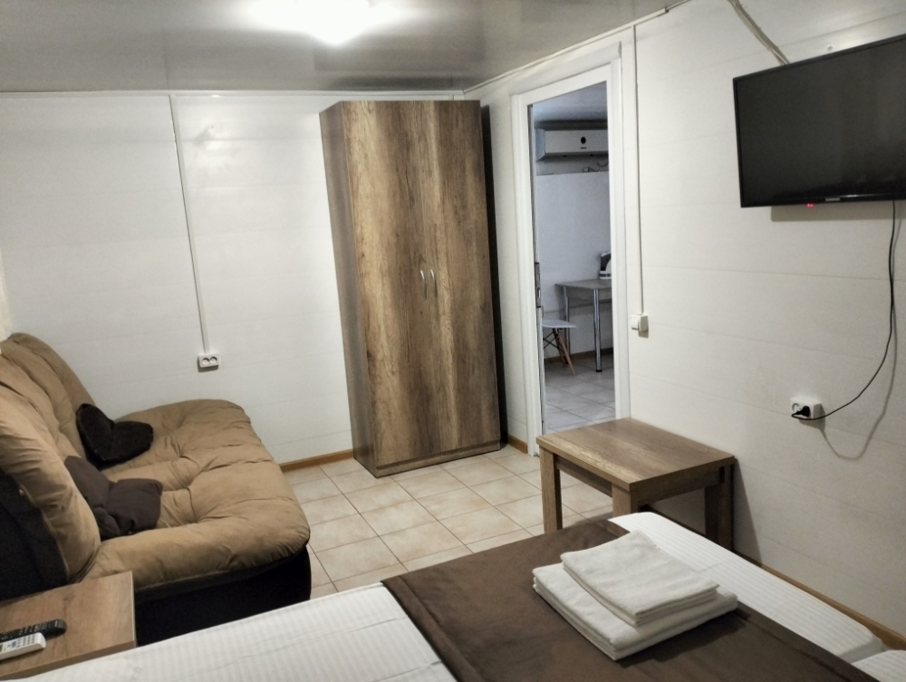 В номере сплит-система, мини-холодильник, электрический чайник, TV, шкаф. Санузел с ванной на 1 номер (вход из коридора).