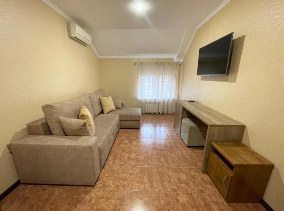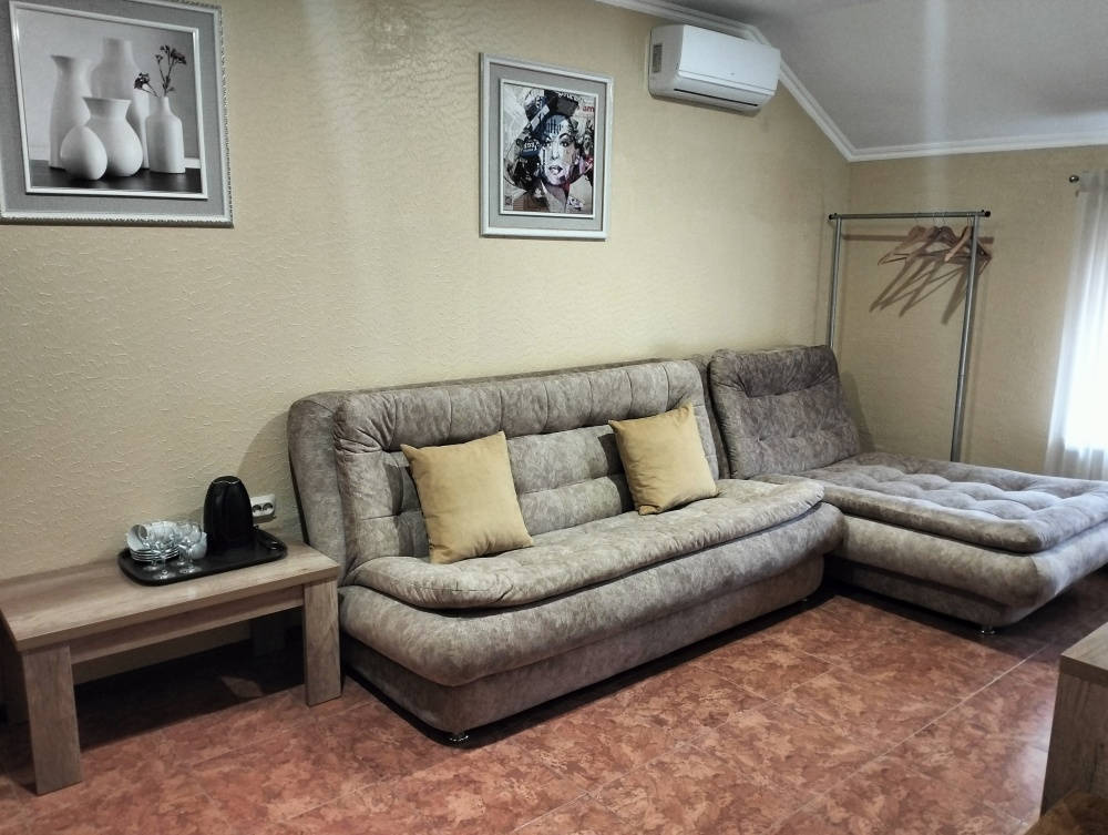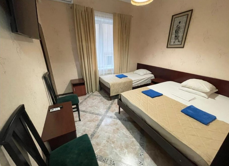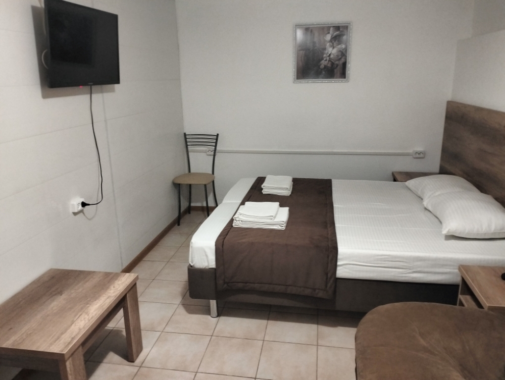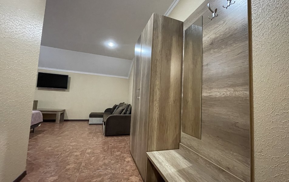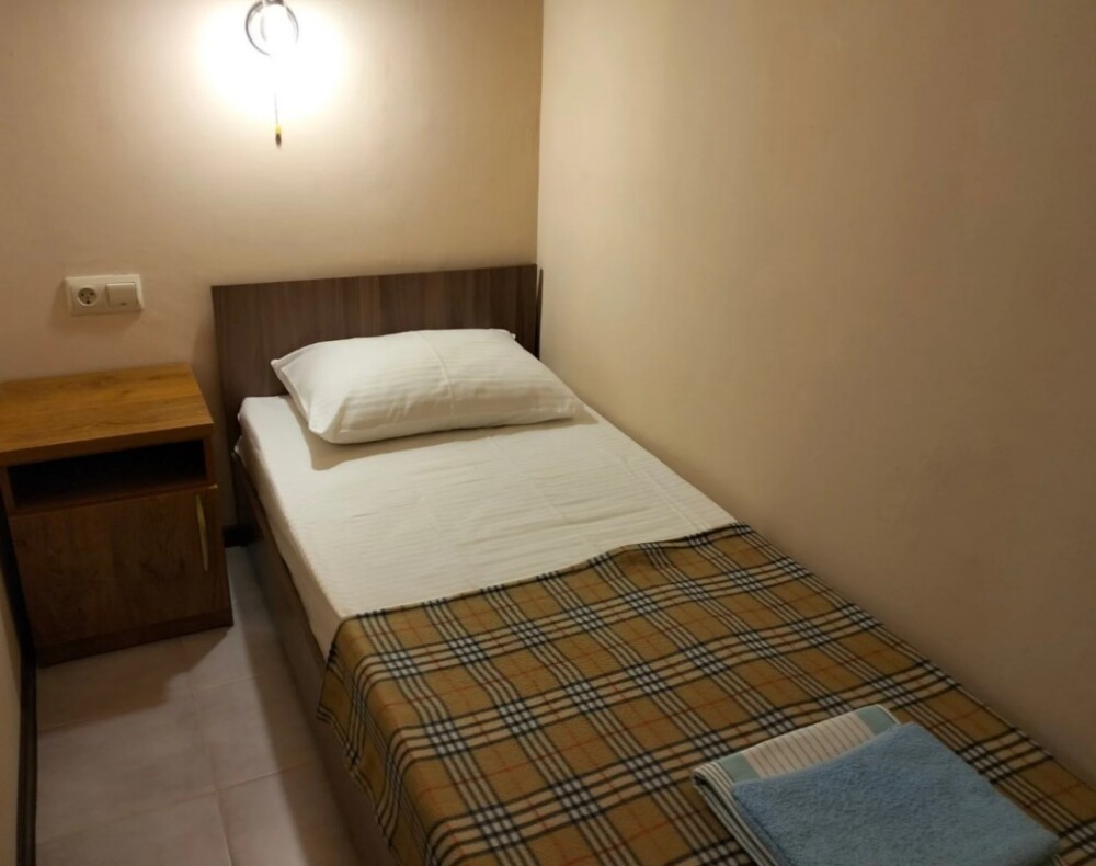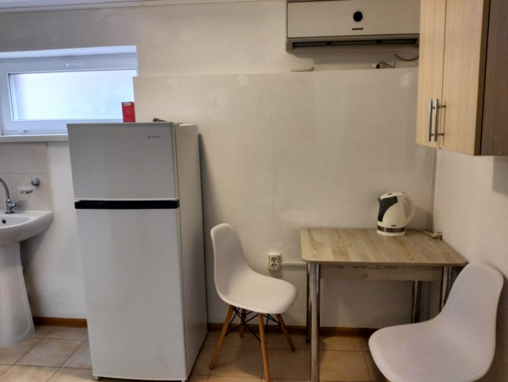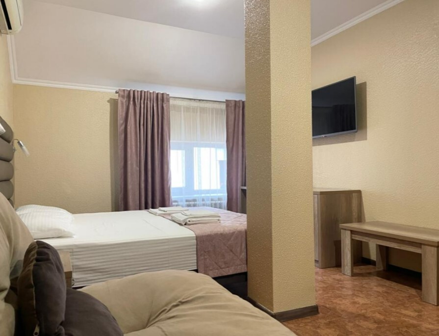 В номере сплит-система, мини-холодильник, электрический чайник, TV, шкаф. Санузел с ванной на 1 номер (вход из коридора).