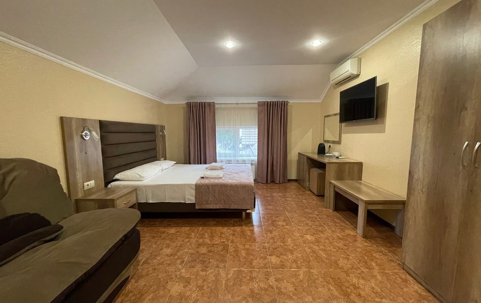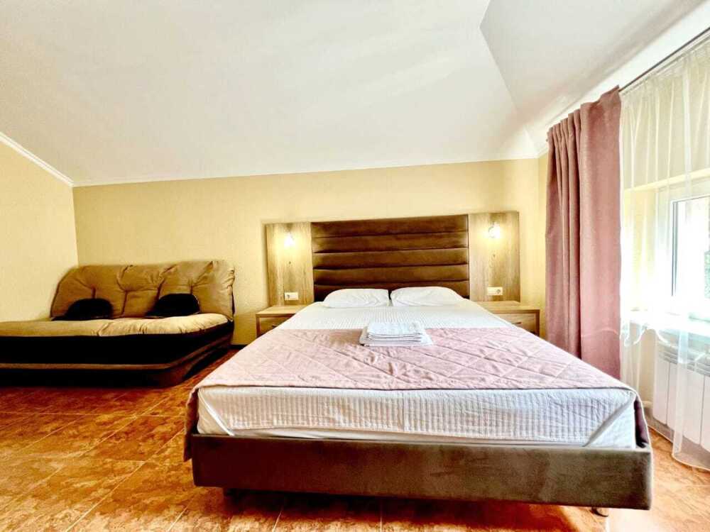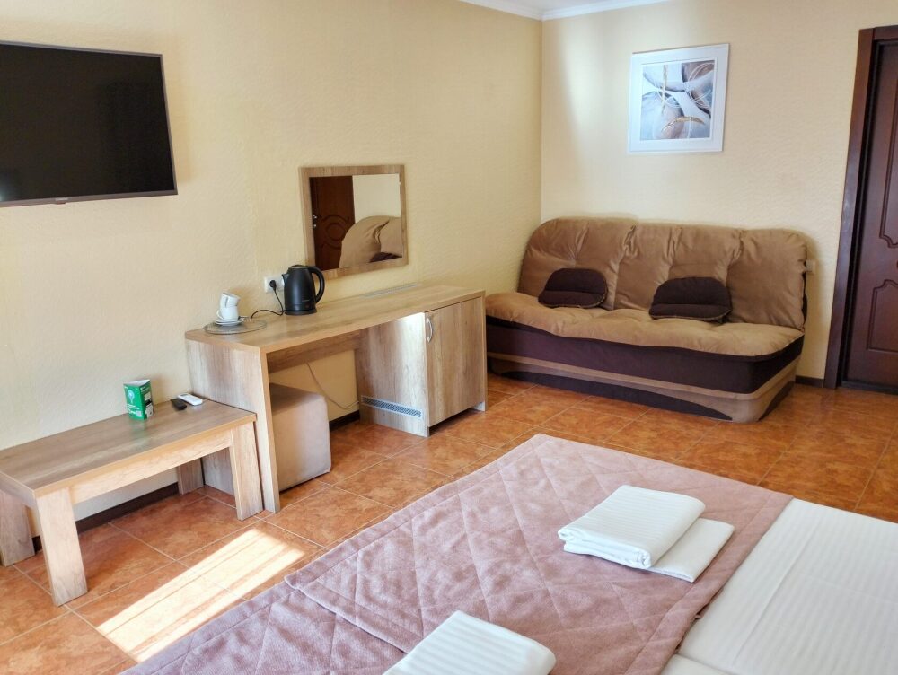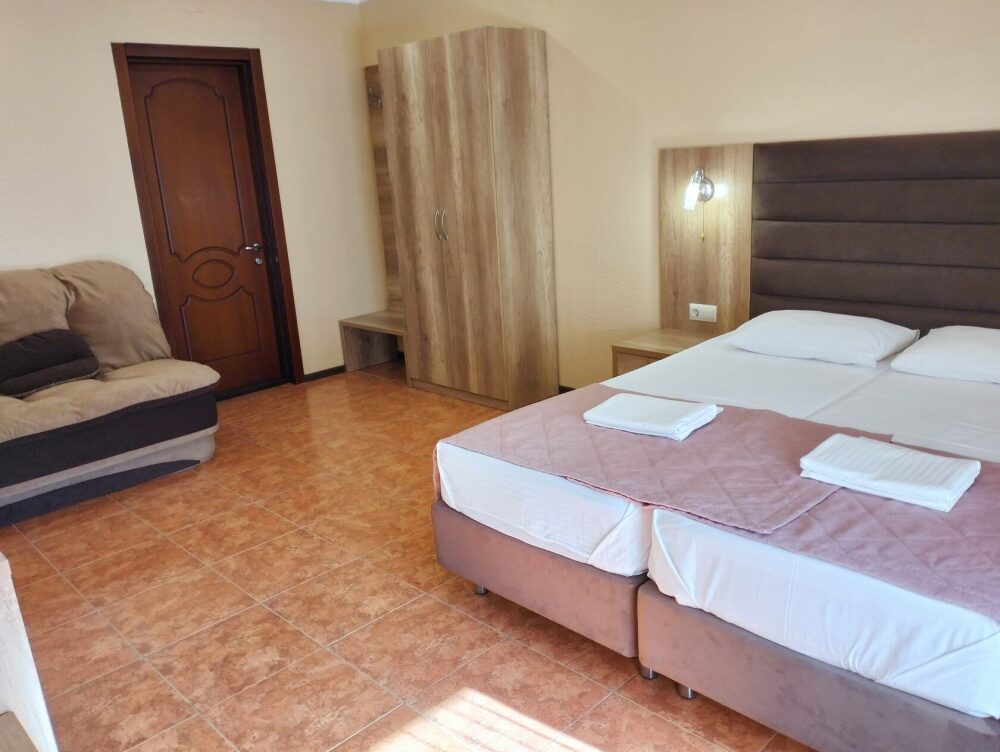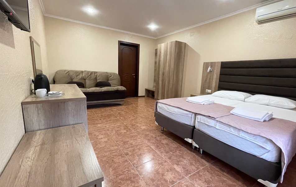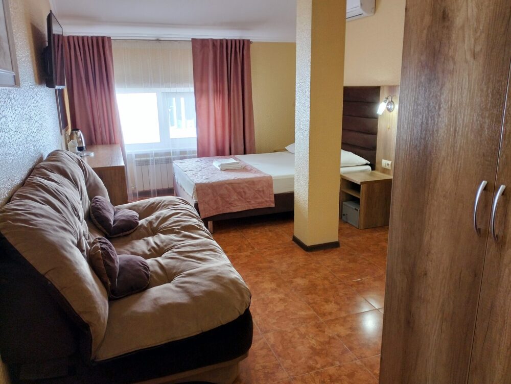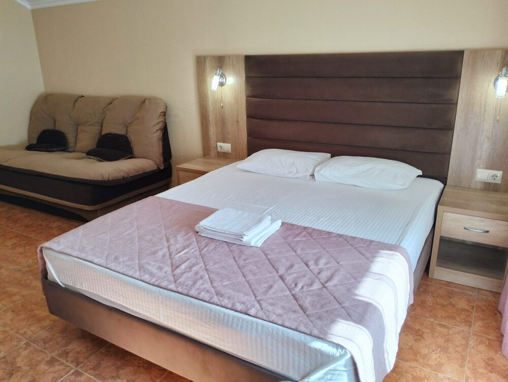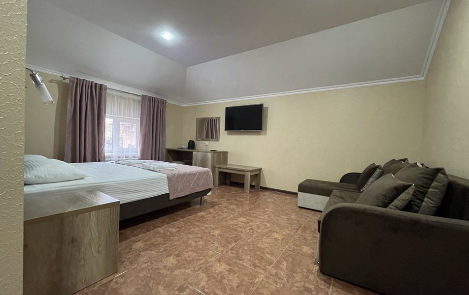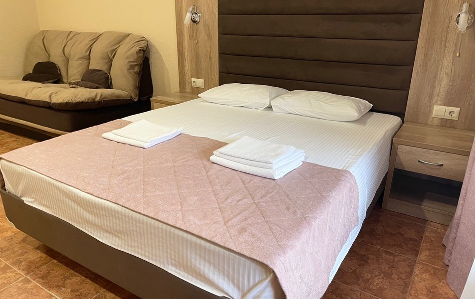 Четырехместный номер с двуспальной кроватью и двуспальным диваном.