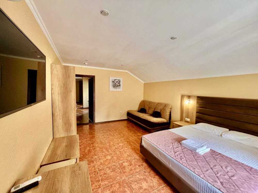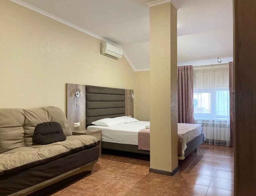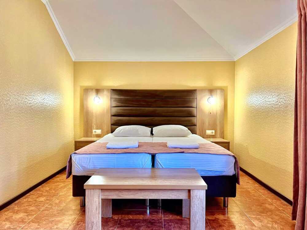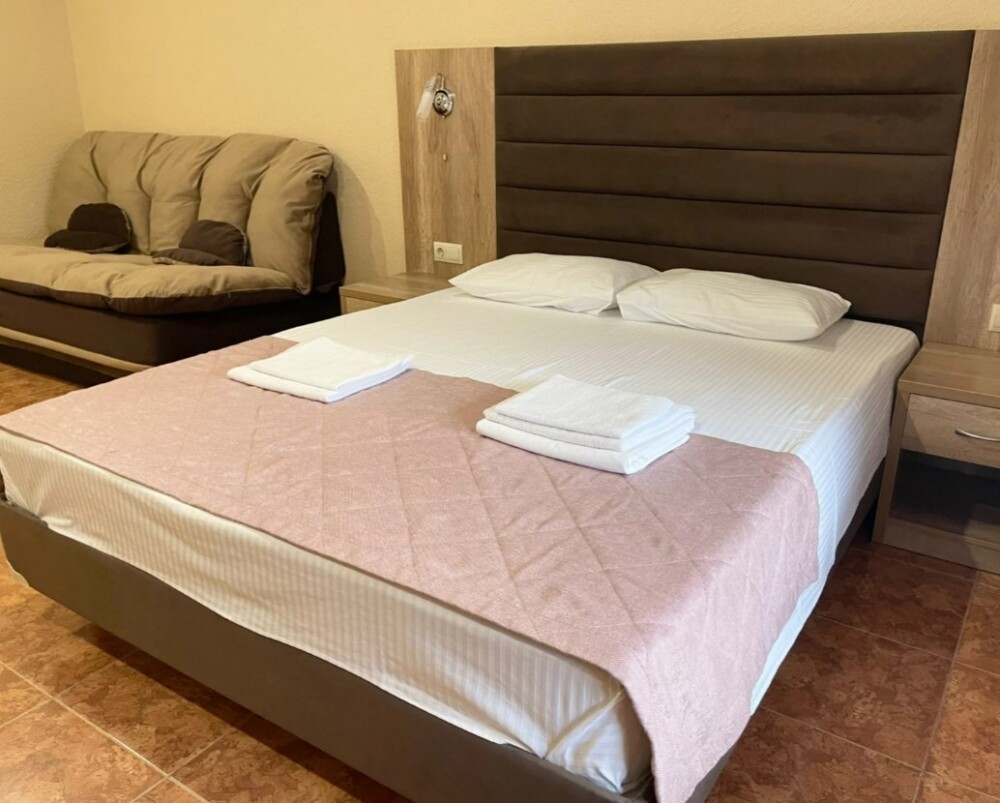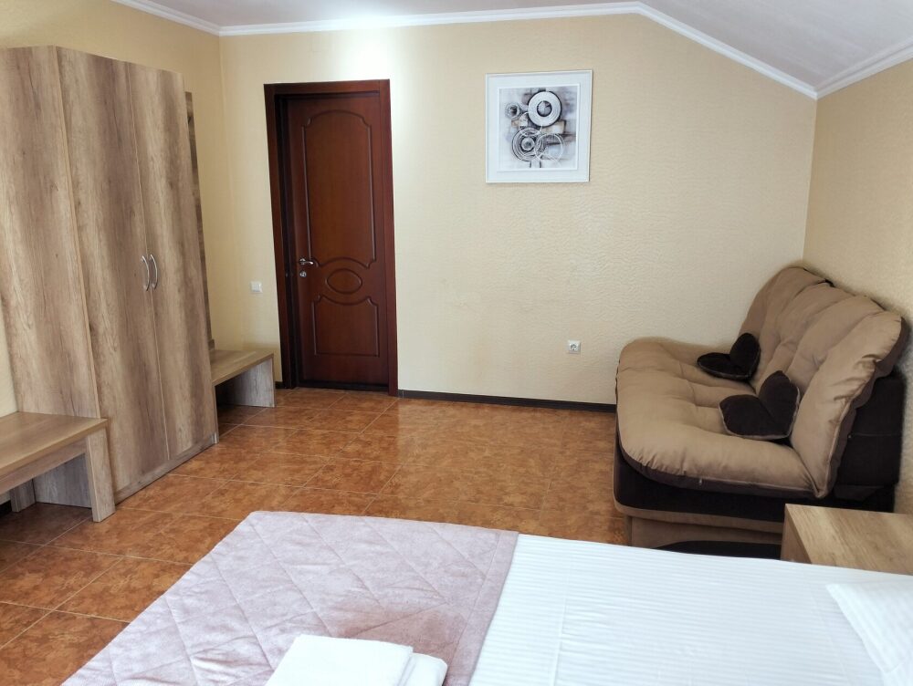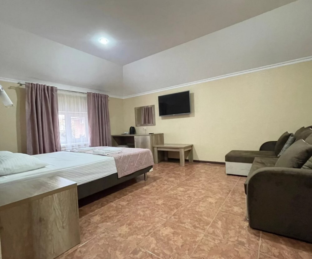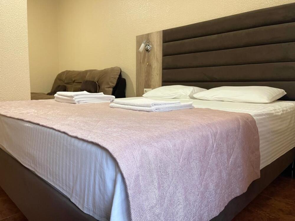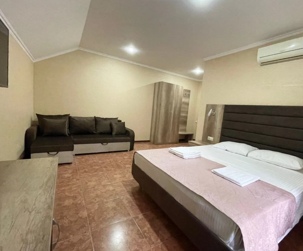 Четырехместный номер с двуспальной кроватью и двуспальным диваном.