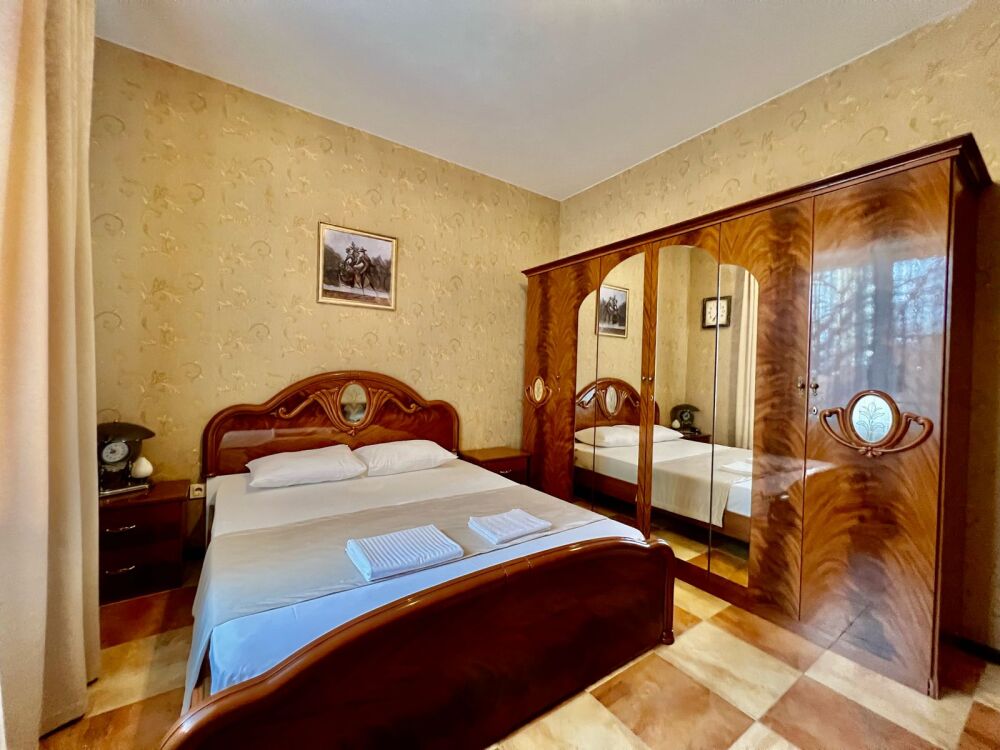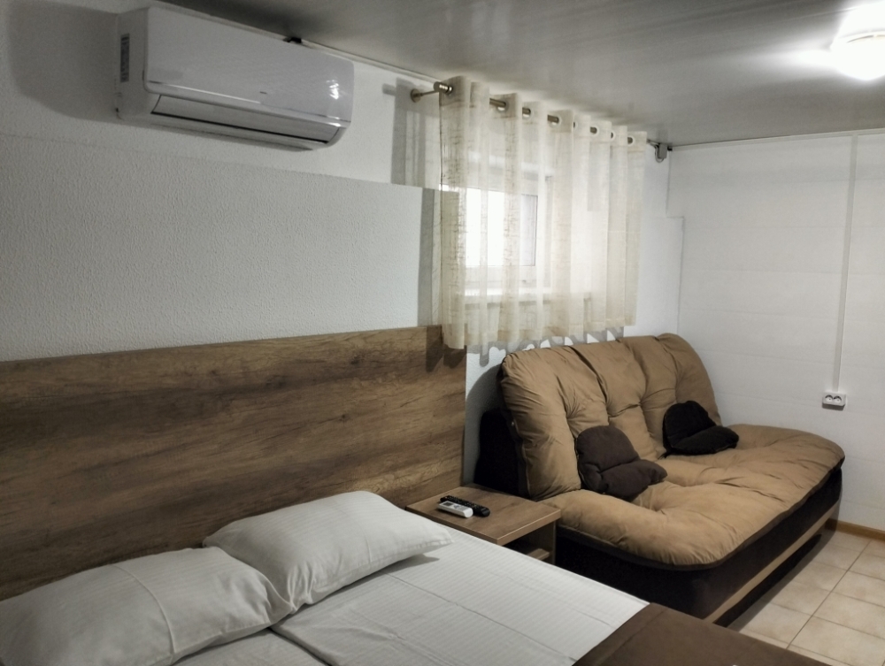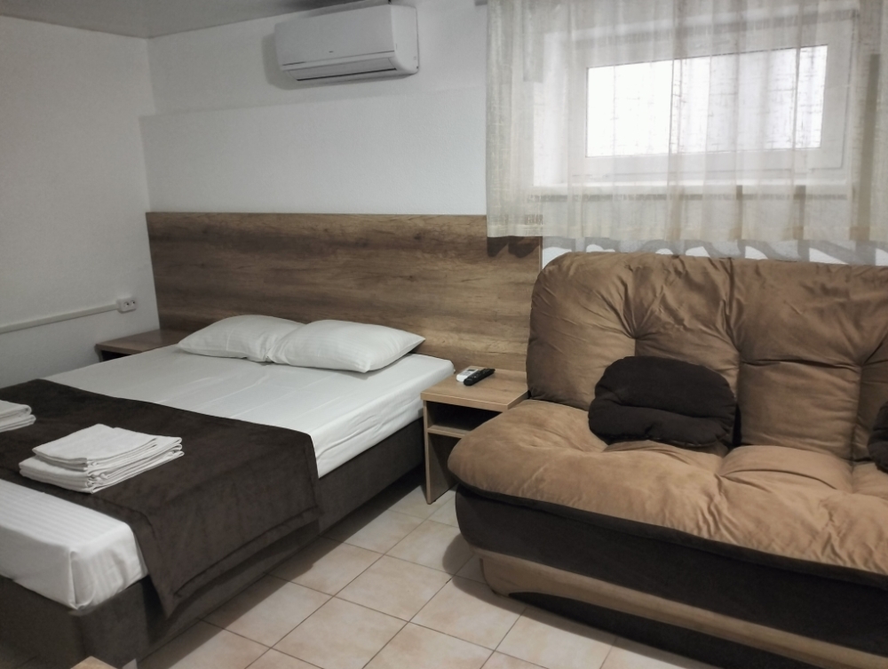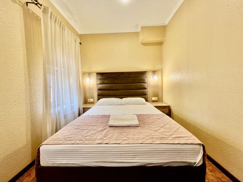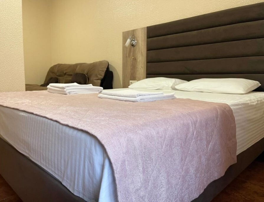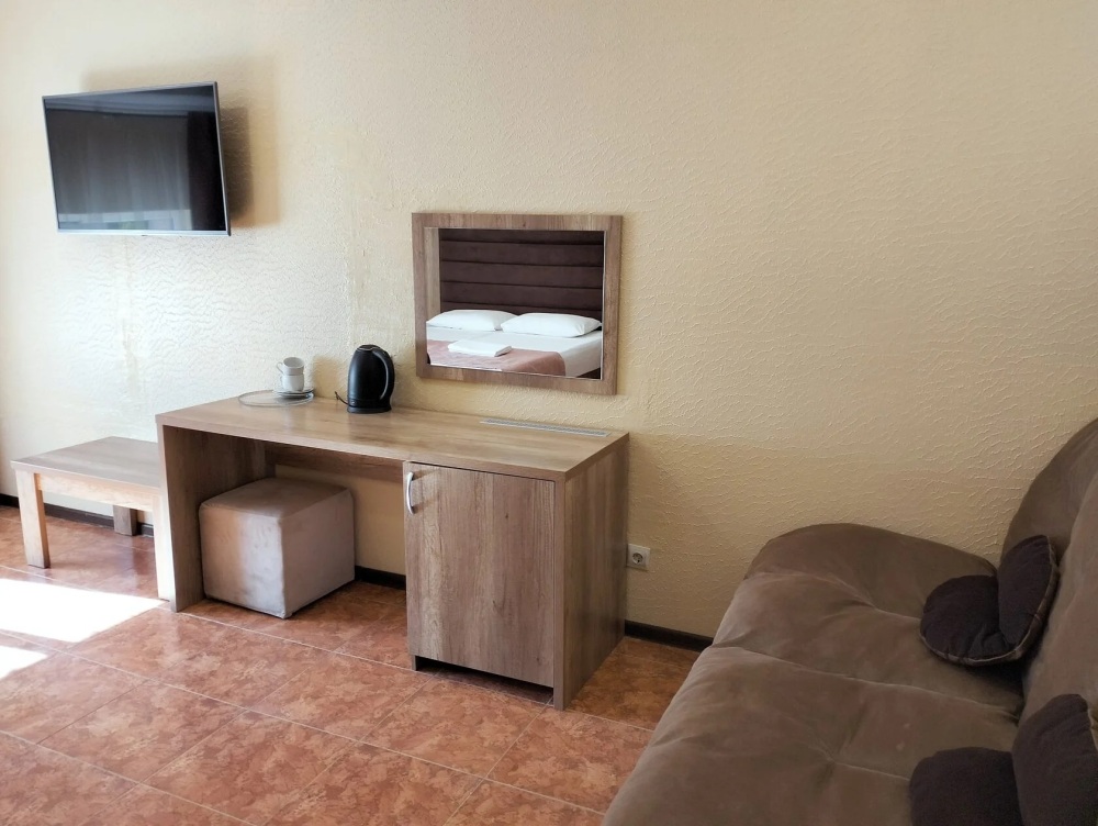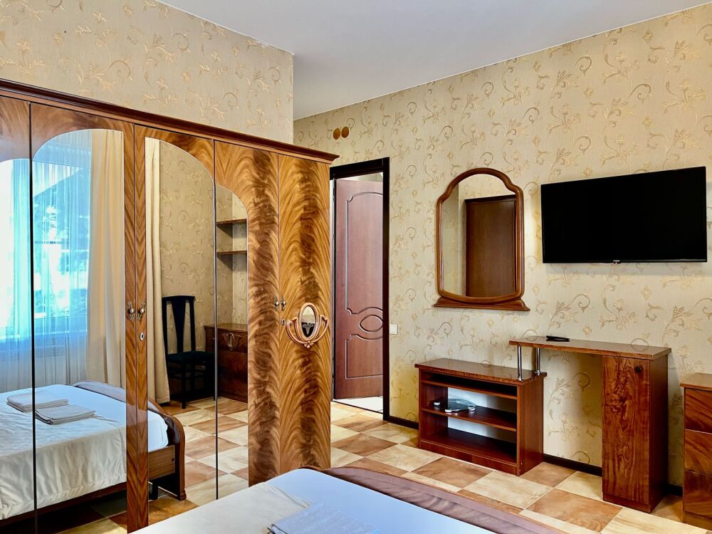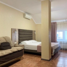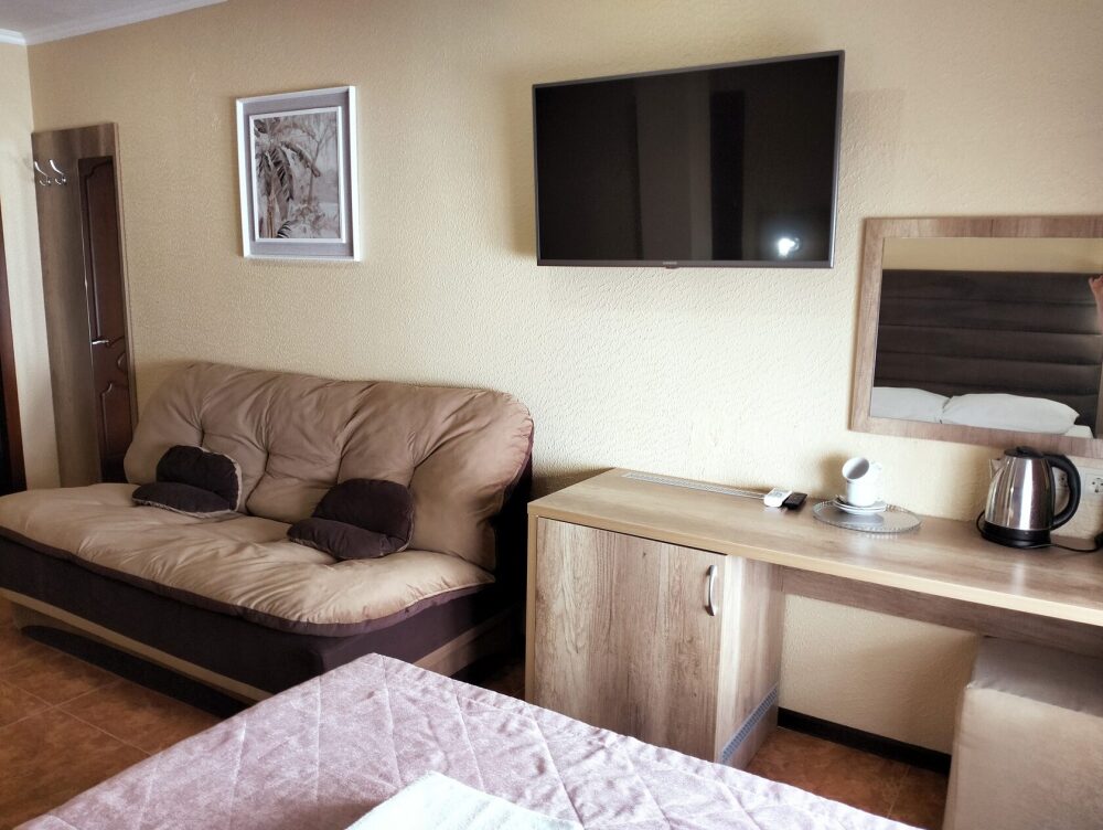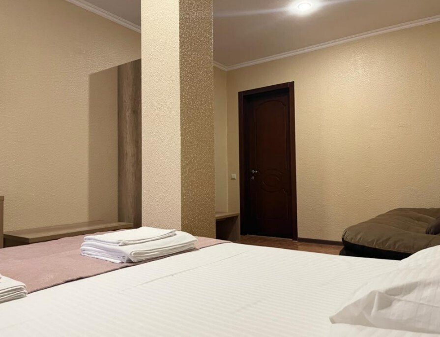 Четырехместный номер с двуспальной кроватью и двуспальным диваном.