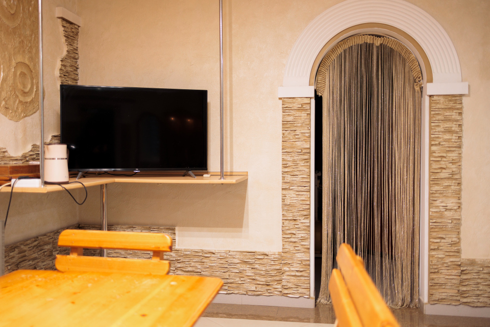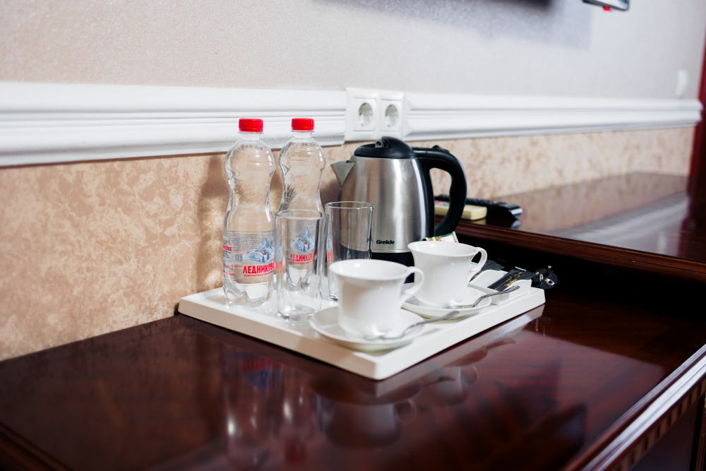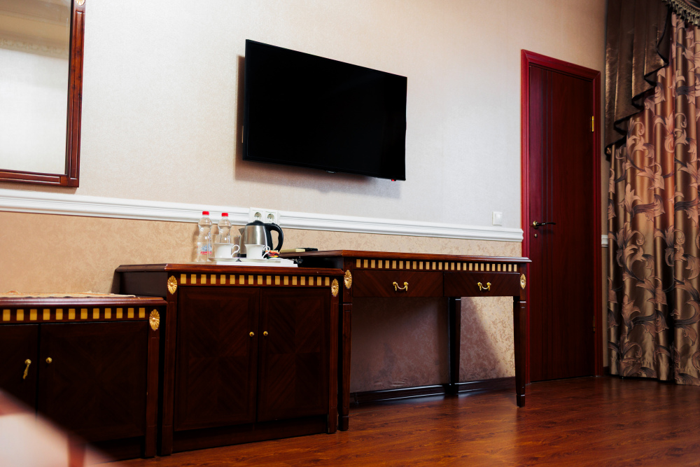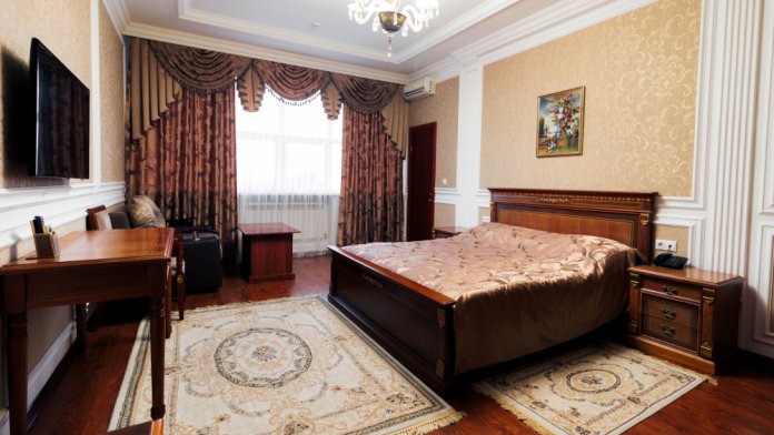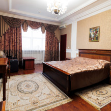 VIP номер- Роскошная классика для истинных ценителей изысканного комфорта. Двухкомнатный номер: спальня и гостиная. В номере кондиционер, телефон, холодильник, сейф. В гостиной: диван и два кресла, столик журнальный и письменный, телевизор в каждой комнате и кондиционеры тоже. Спальня: двуспальная кровать 1800х2000,шкаф , тумбочки прикроватные. В прихожей комнате - шкаф купе. Душевая, санузел с зеркалом, феном, полный комплект туалетных принадлежностей, набор полотенец, халаты, тапочки. В номерах чайники электрические с посудой чайной, чай и сахар,бутылированная вода