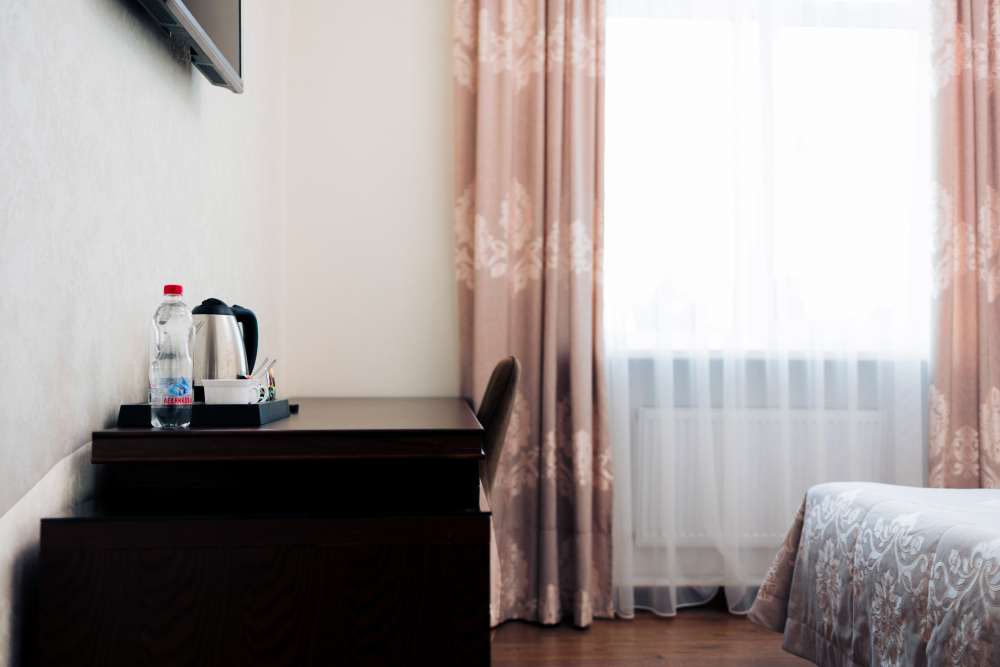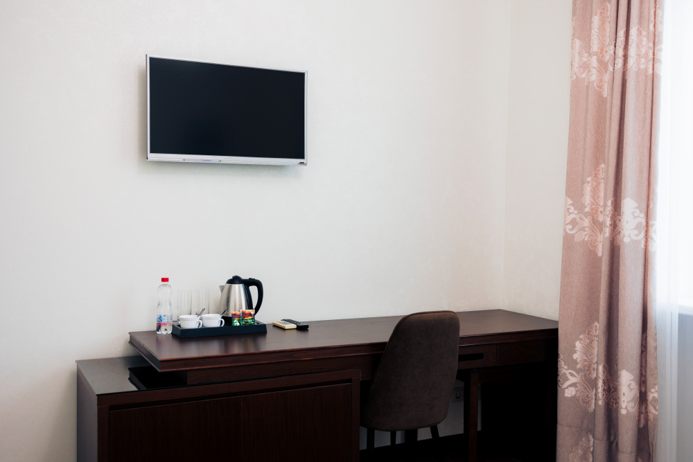 СТАНДАРТ с одной кроватью — уютные однокомнатные номера. В номерах этой категории кровати р-р 1800х2000, прикроватные тумбочки, кресла, журнальный столик, рабочий стол. Номера оснащены индивидуальной системой кондиционирования, телевизорами ж/к, холодильником, телефоном, чайники электрические с чайной и столовой посудой, сахар, чай и вода бутылированная .В ванной комнате душевая, санузел, зеркало, фен и тапочки, а так же набор туалетных принадлежностей и по два комплекта полотенец (для рук и тела), ножное.