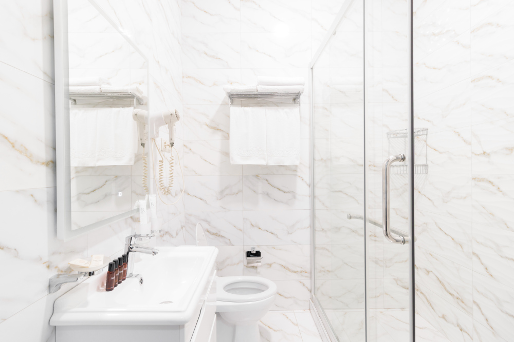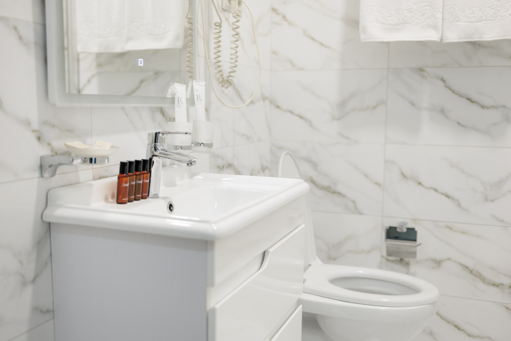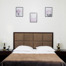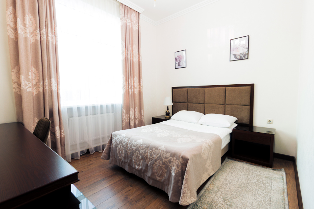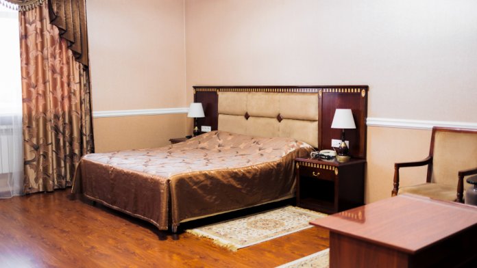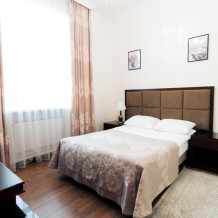 ЛЮКС – однокомнатный – номера в современном классическом стиле. Оснащены кондиционерами, телевизорами, холодильники и телефоном. В номере данной категории двуспальная кровать кровать 1800х2000, тумбочки прикроватные, шкаф, кресла, стол письменный и журнальный тумбы под Т/В и для багажа. В ванной комнате – душевая, фен и зеркало, санузел, полный комплект туалетных принадлежностей, по 3 комплекта полотенец (для лица и тела) и ножное, халаты, тапочки.