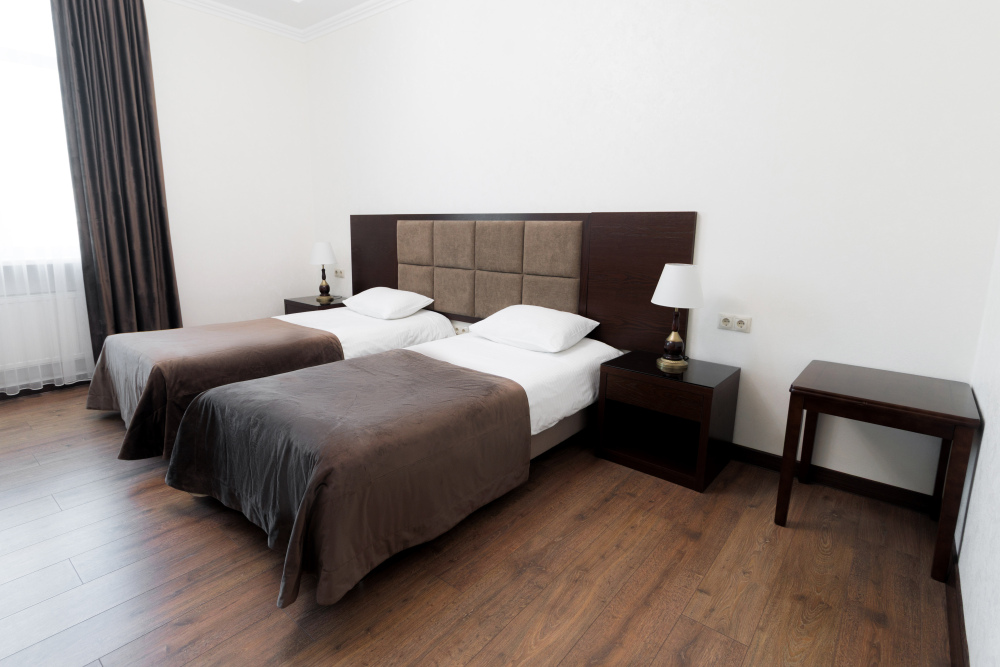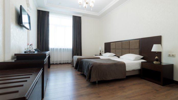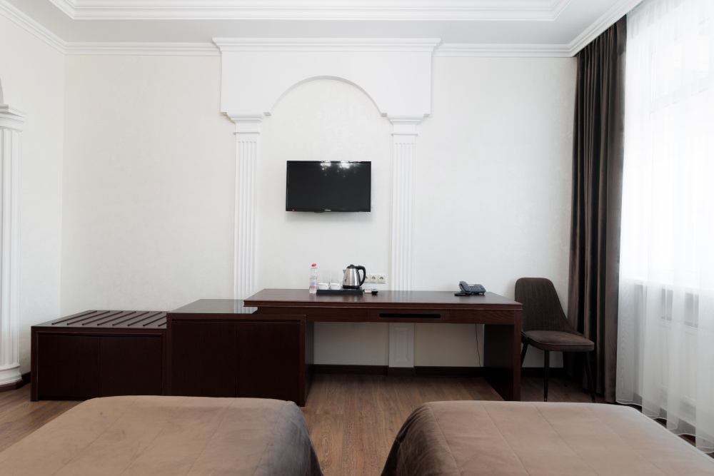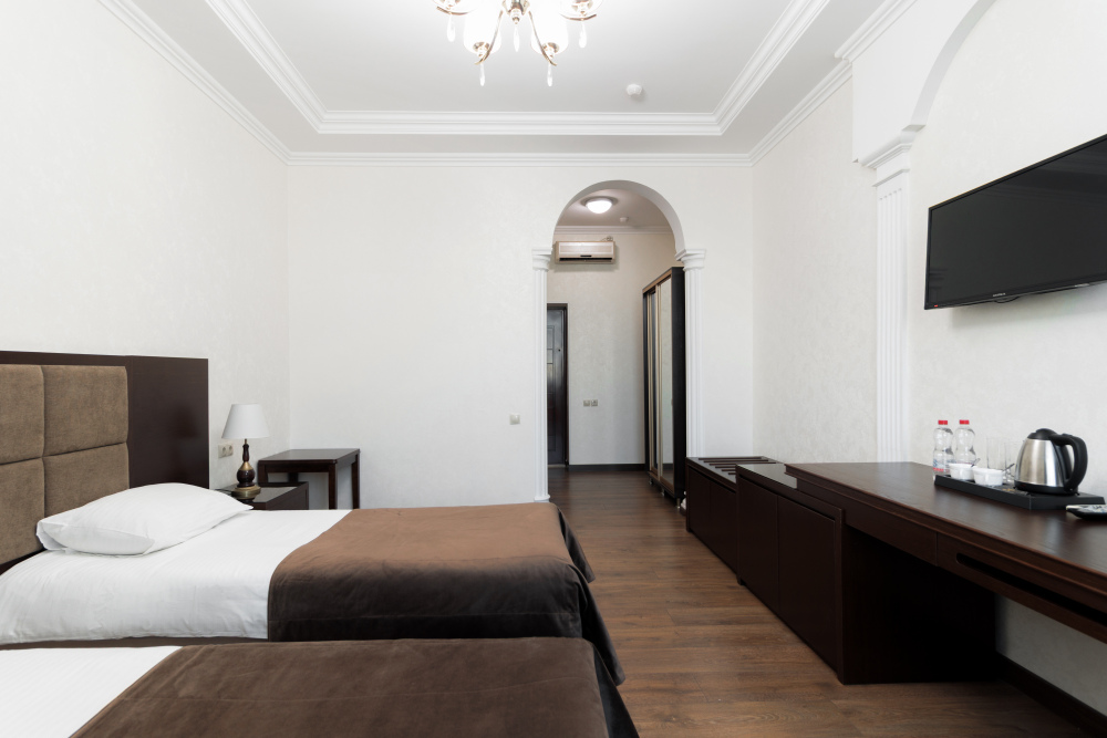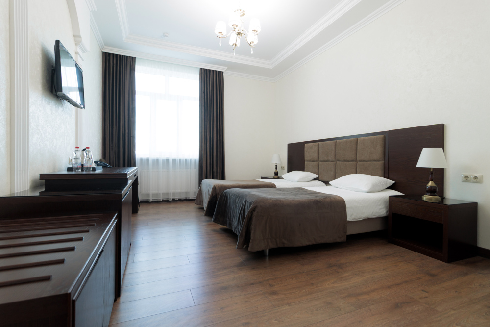 СТАНДАРТ с двумя кроватями — уютные однокомнатные номера с двумя кроватями. В номерах этой категории две односпальные кровати с ортопедическими матрасами, прикроватные тумбочки, кресла, журнальный столик, рабочий стол. Номера оснащены индивидуальной системой кондиционирования, телевизорами ж/к, холодильником, телефоном, чайники электрические с чайной и столовой посудой, сахар, чай и вода питьевая 2 шт. по 0,5л.В ванной комнате расположены душевые кабины, санузел, зеркало, фен и тапочки, а так же набор туалетных принадлежностей и по два комплекта полотенец (для рук и тела), ножное