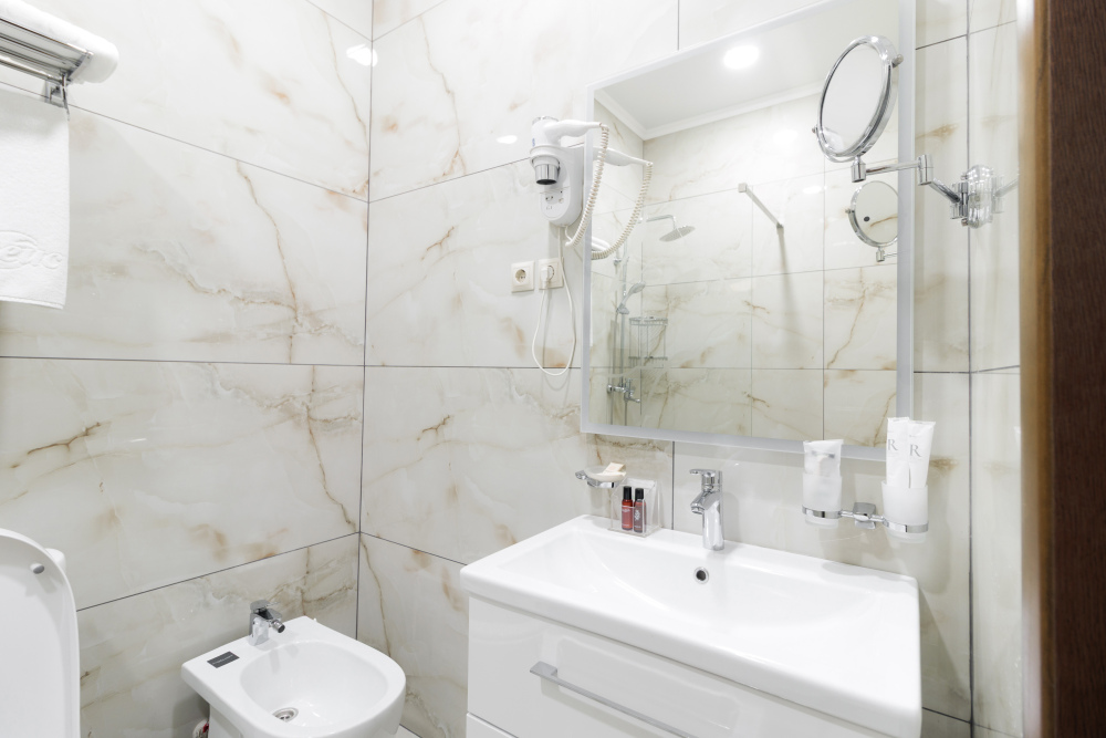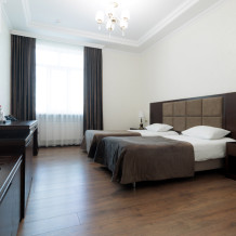 ЛЮКС – двухкомнатный – оформленные в современном стиле . В каждом номере по 2 кондиционера, 2 телевизора, диван и два кресла, журнальный и туалетный столики, холодильник и телефон,двуспальная кровать, тумбочки прикроватные. В ванной комнате – душевая, санузел с зеркалом и феном, полный комплект туалетных принадлежностей, по 3 комплекта полотенец (для лица и тела) и ножное, халаты, тапочки. В номерах чайники электрические с посудой чайной и столовой, чай/кофе и вода бутылированная.