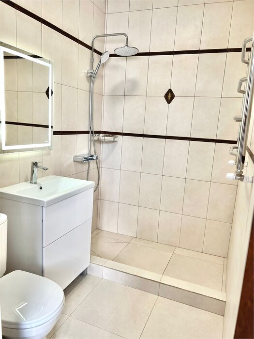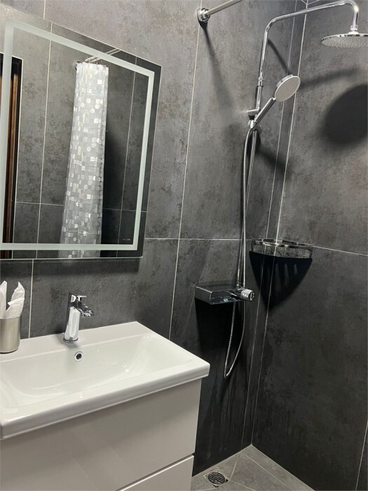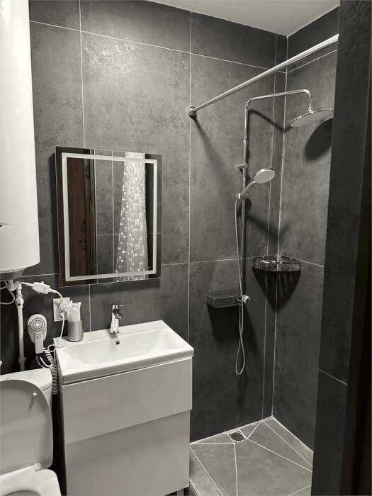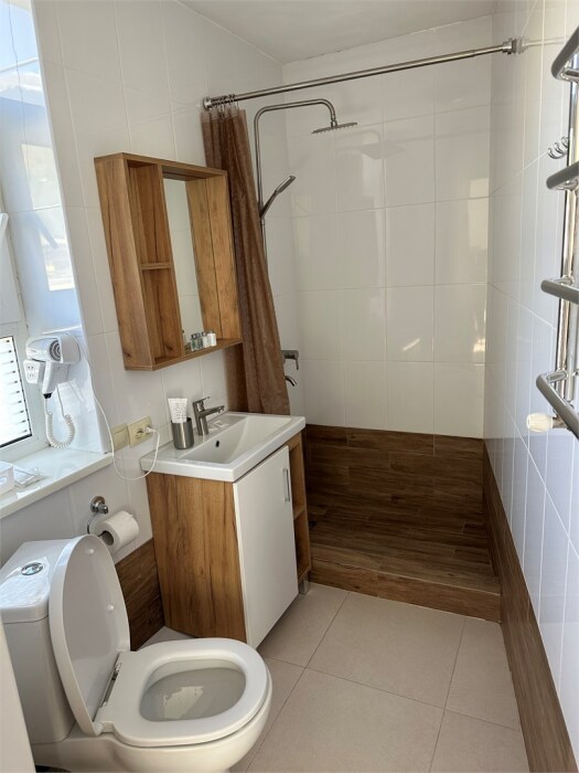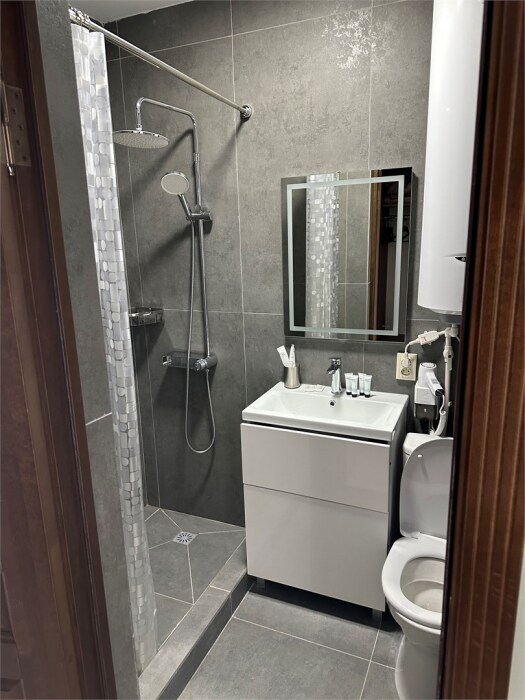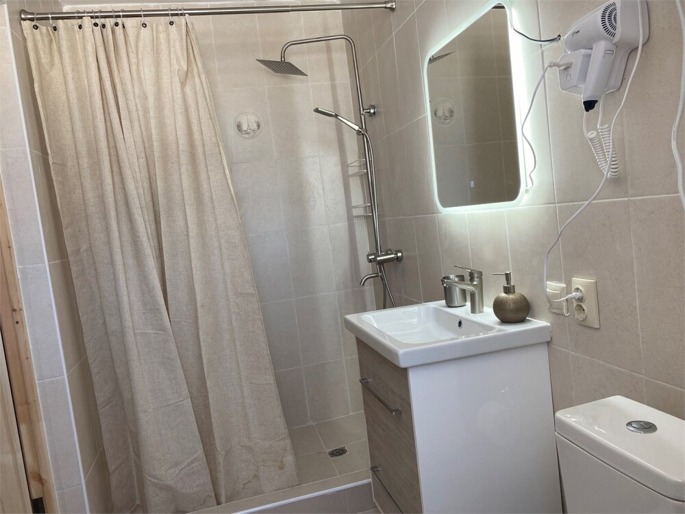 В ванной - набор полотенец, гигиенические принадлежности, фен.