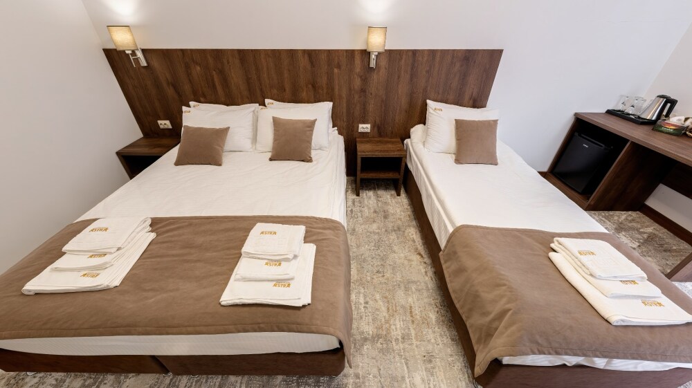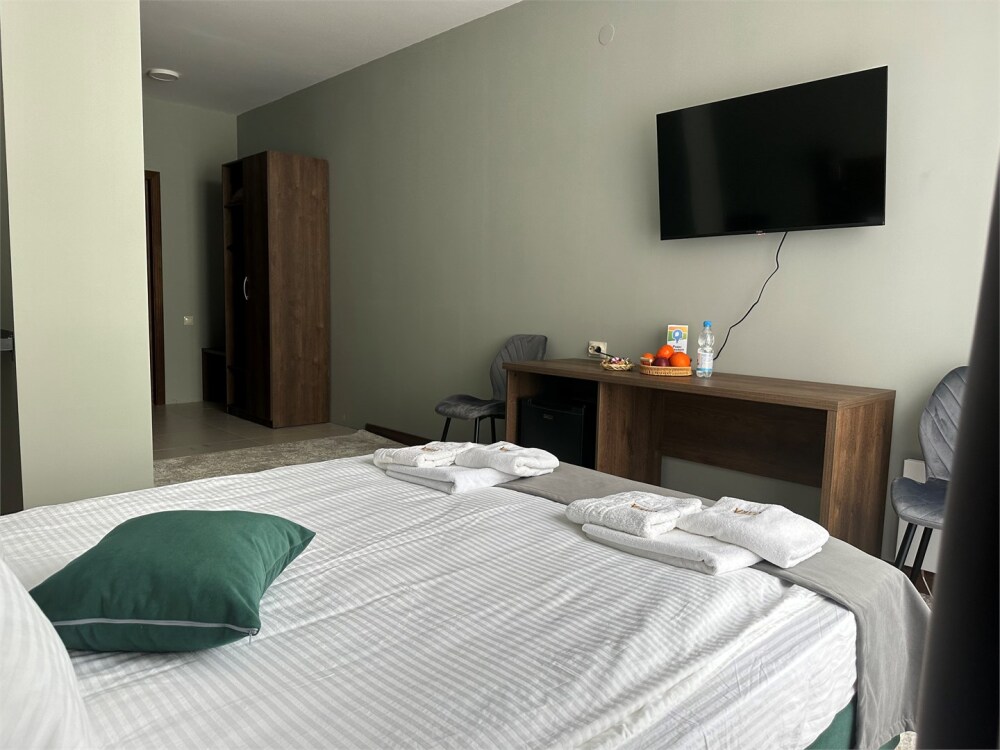 в номере имеются одна двухспальная и одна односпальная кровать, шкаф, вешалка и чемоданница, холодильник, телевизор WI-FI, чайный набор, фен, комплект полотенец, средства гигиены. Wi-fi бесплатный.